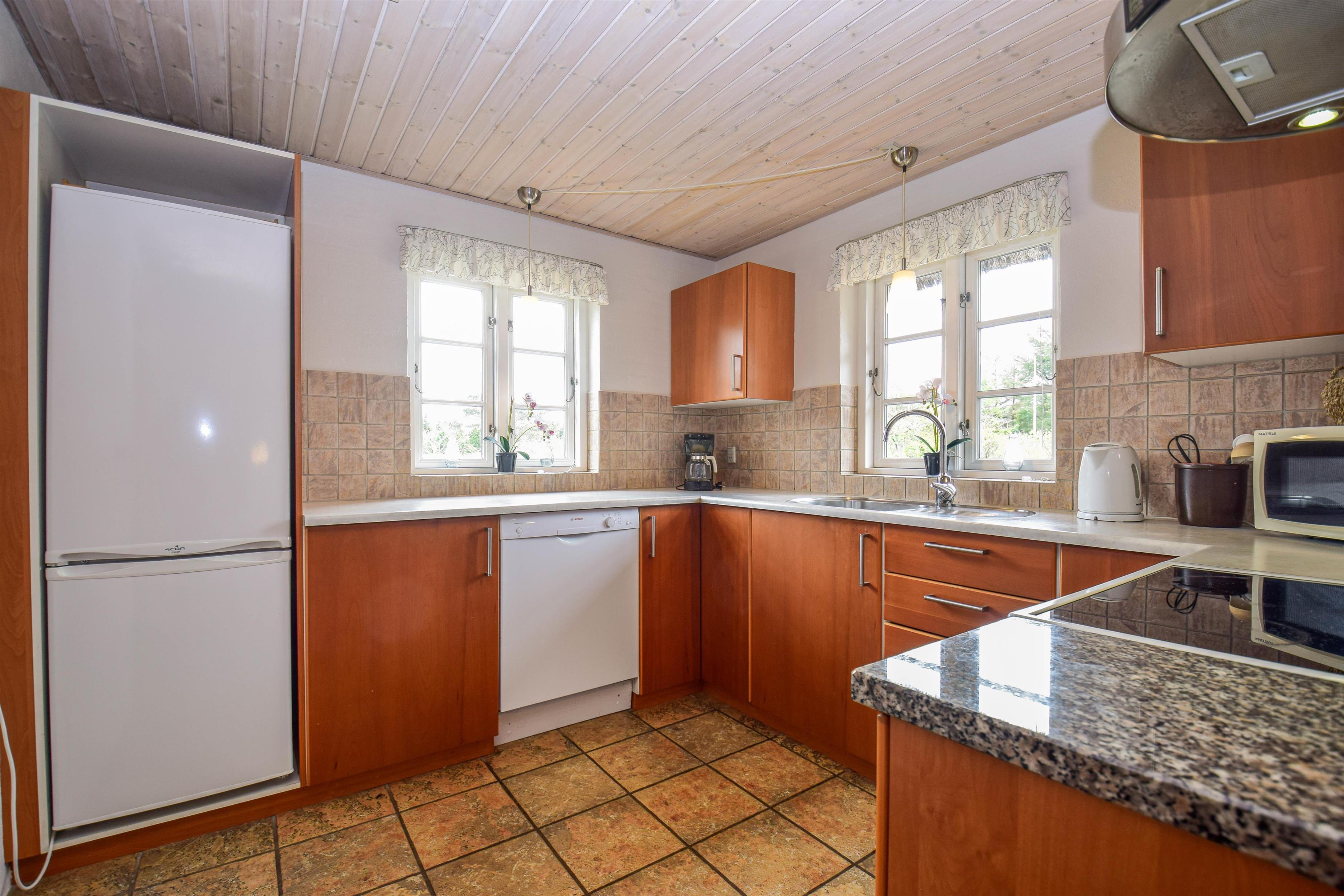 Med sine 100 m² er huset opført i kvalitetsmaterialer og byder på en stilfuld og velovervejet indretning. Væggene er vandskurede i dæmpede farver, hvilket skaber en lys og indbydende atmosfære. Trægulv i værelserne og klinker i køkken-alrummet understreger den høje komfort og nem vedligeholdelse.