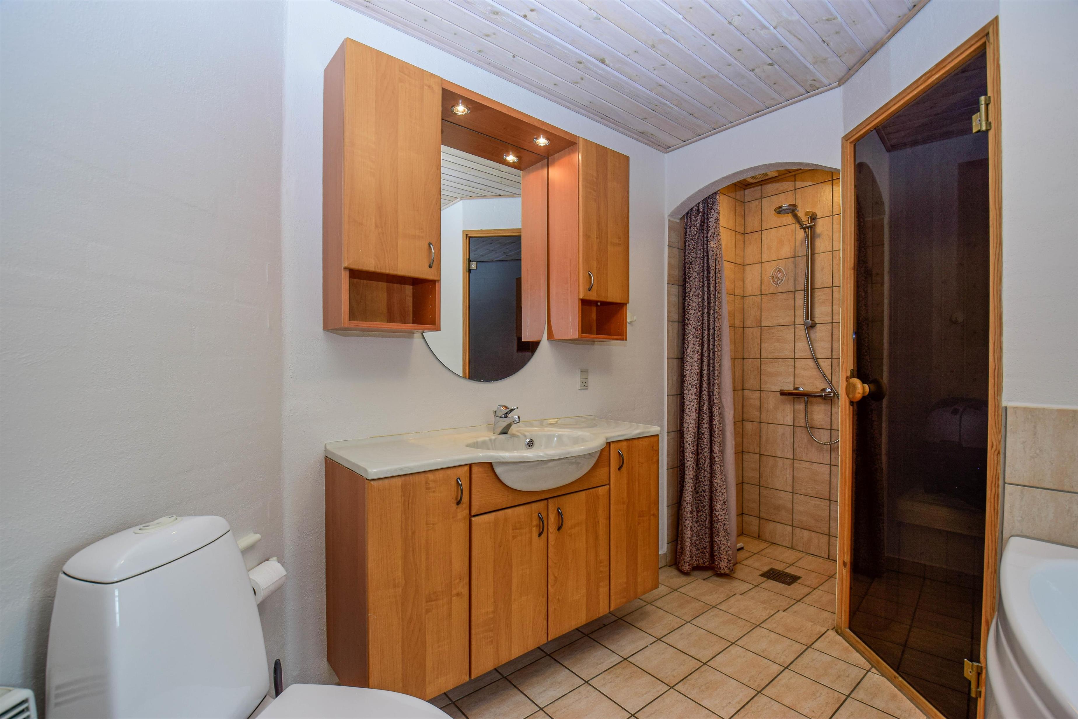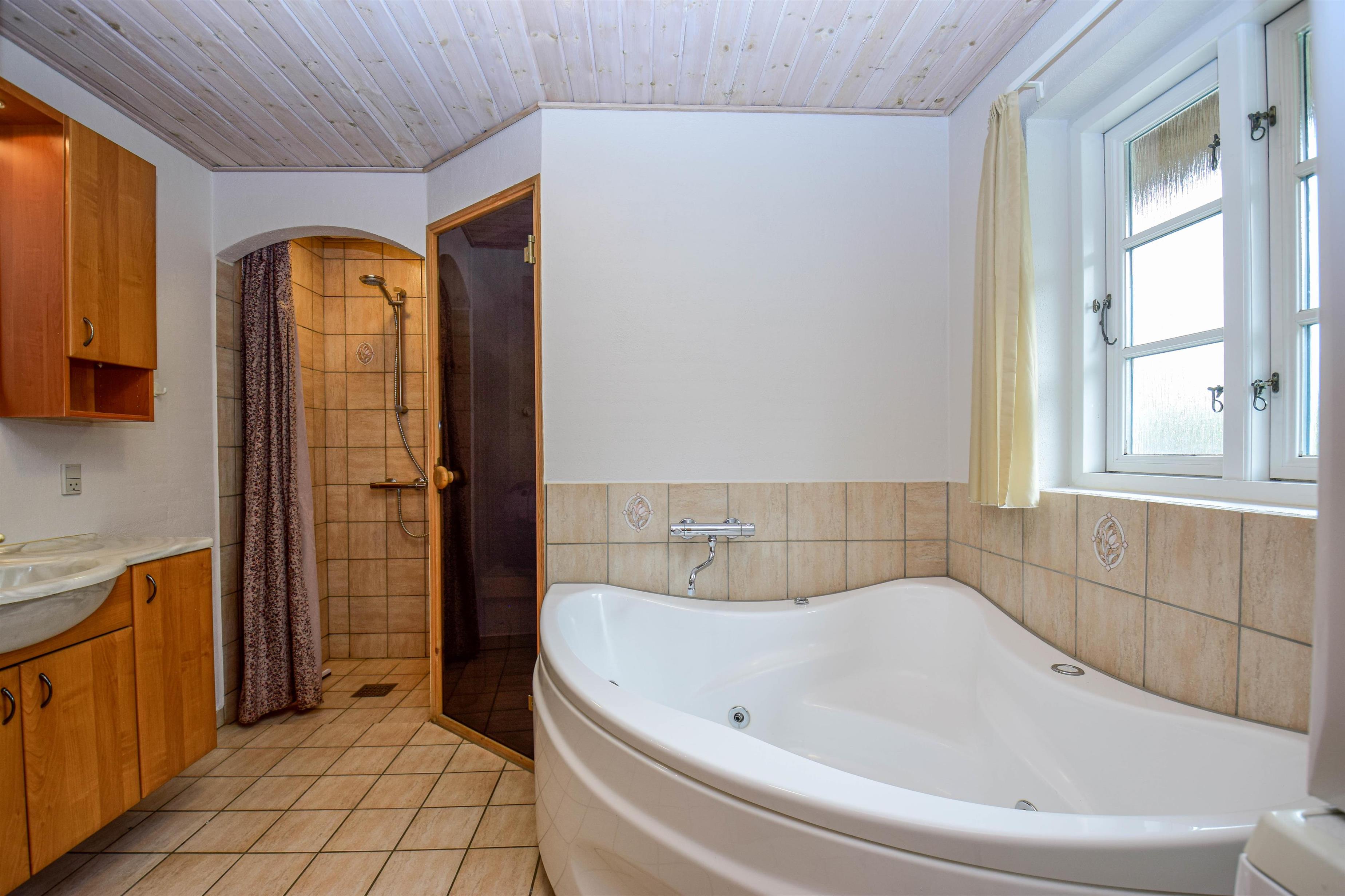 - Et stort, veludstyret badeværelse med bruser, spabad og sauna – oplagt til afslapning og velvære efter en dag i naturen.
