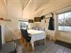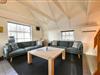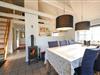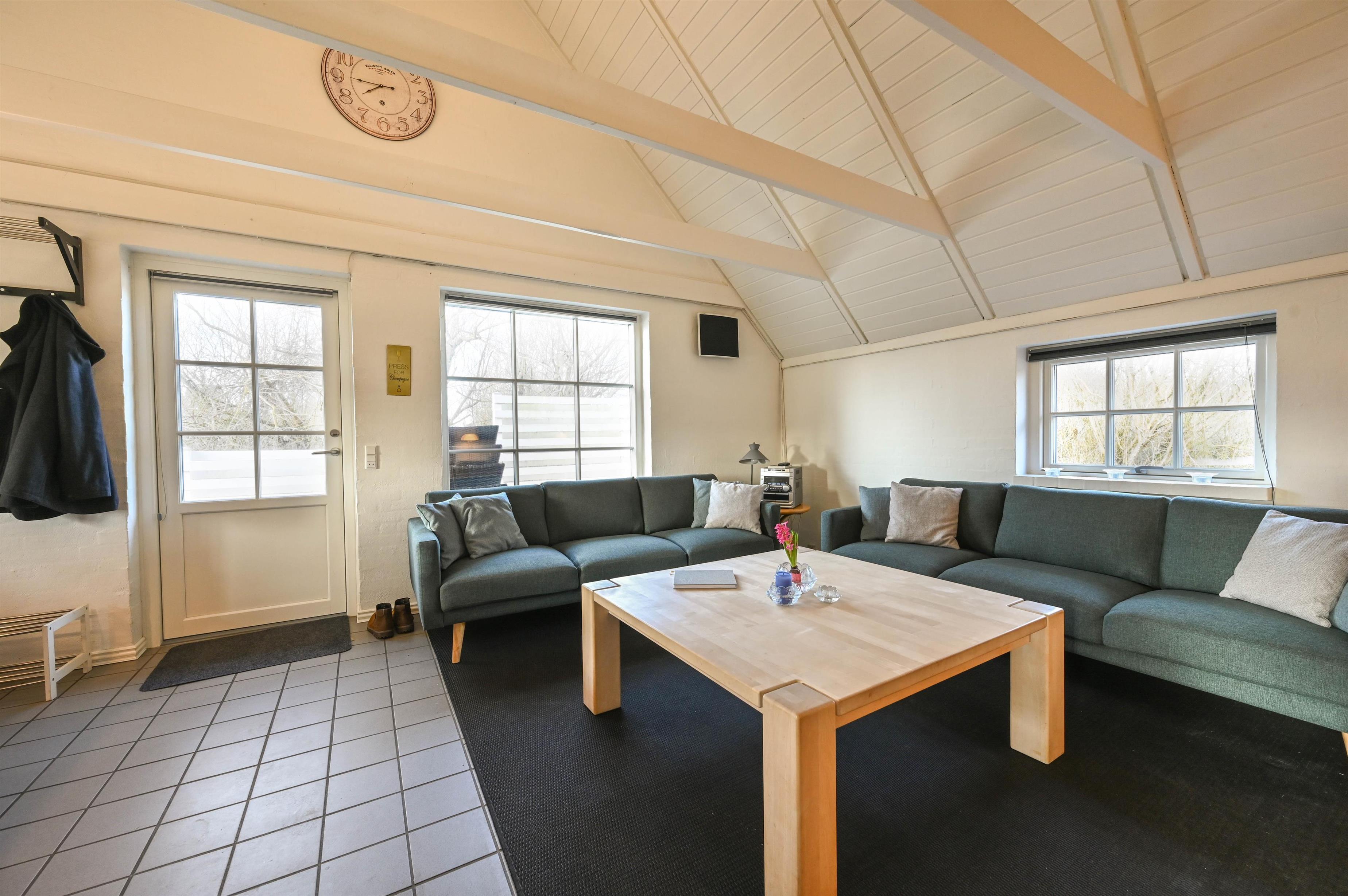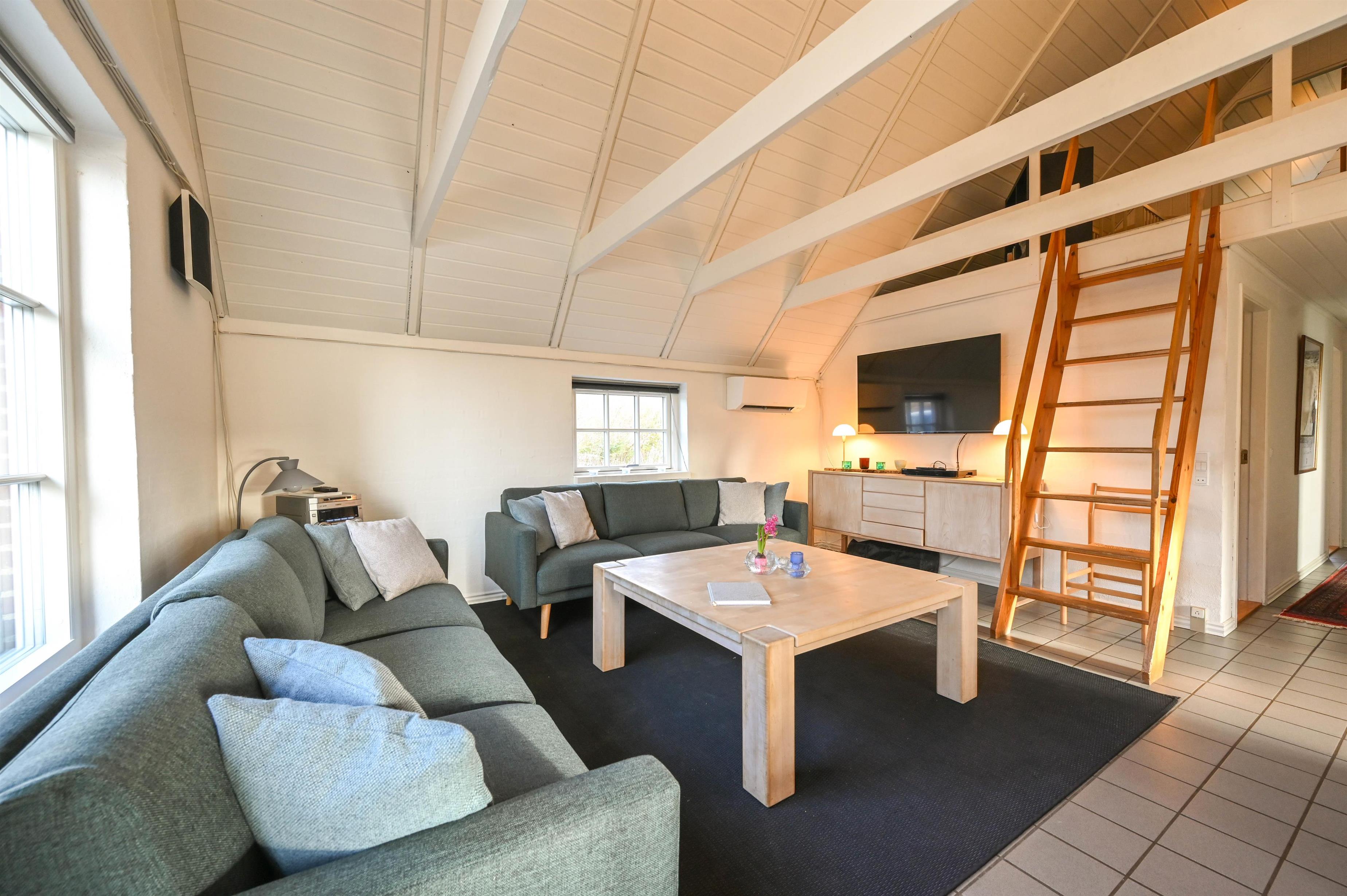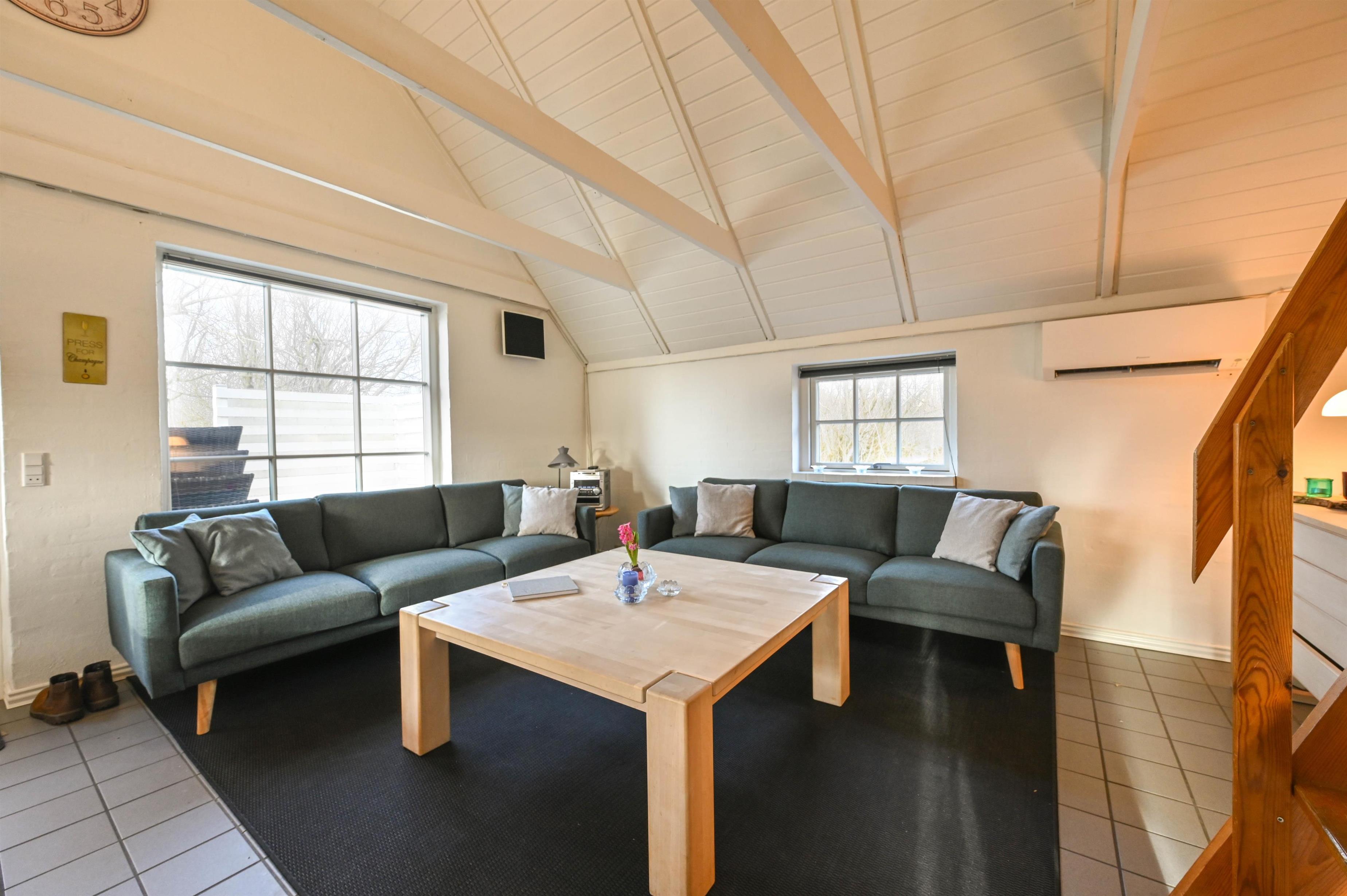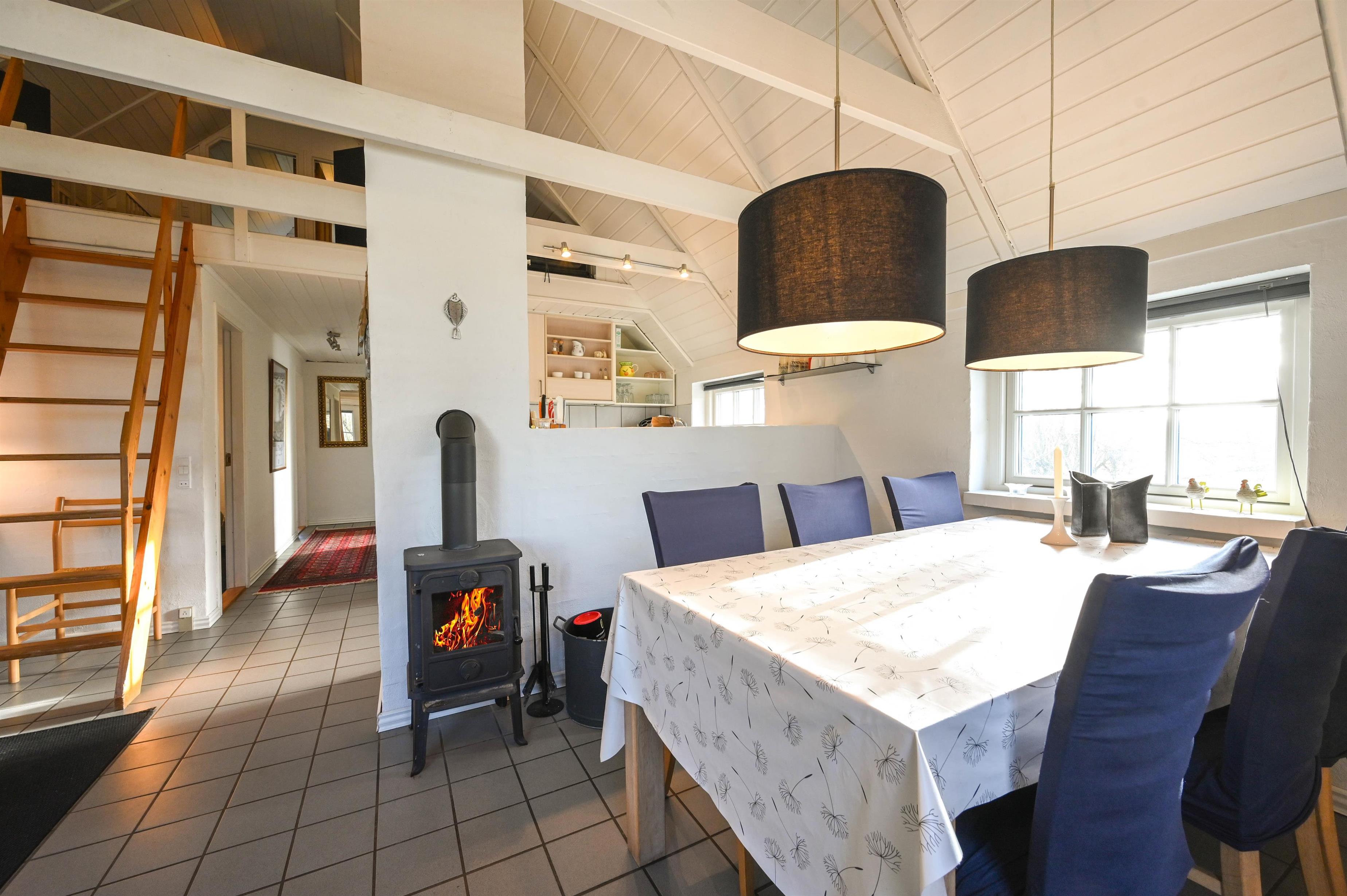 I stuen er der en hyggelig sofa, brændeovn og spiseplads – herfra er der udgang til den delvist overdækkede terrasse, hvor I kan nyde frisk luft året rundt.
