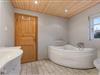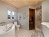 Huset har to badeværelser: ét med spa, gulvvarme og adgang til sauna, og et ekstra med bruser.