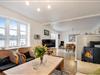 Stue med brændeovn, sofagruppe, spiseplads, TV og udgang til terrasse