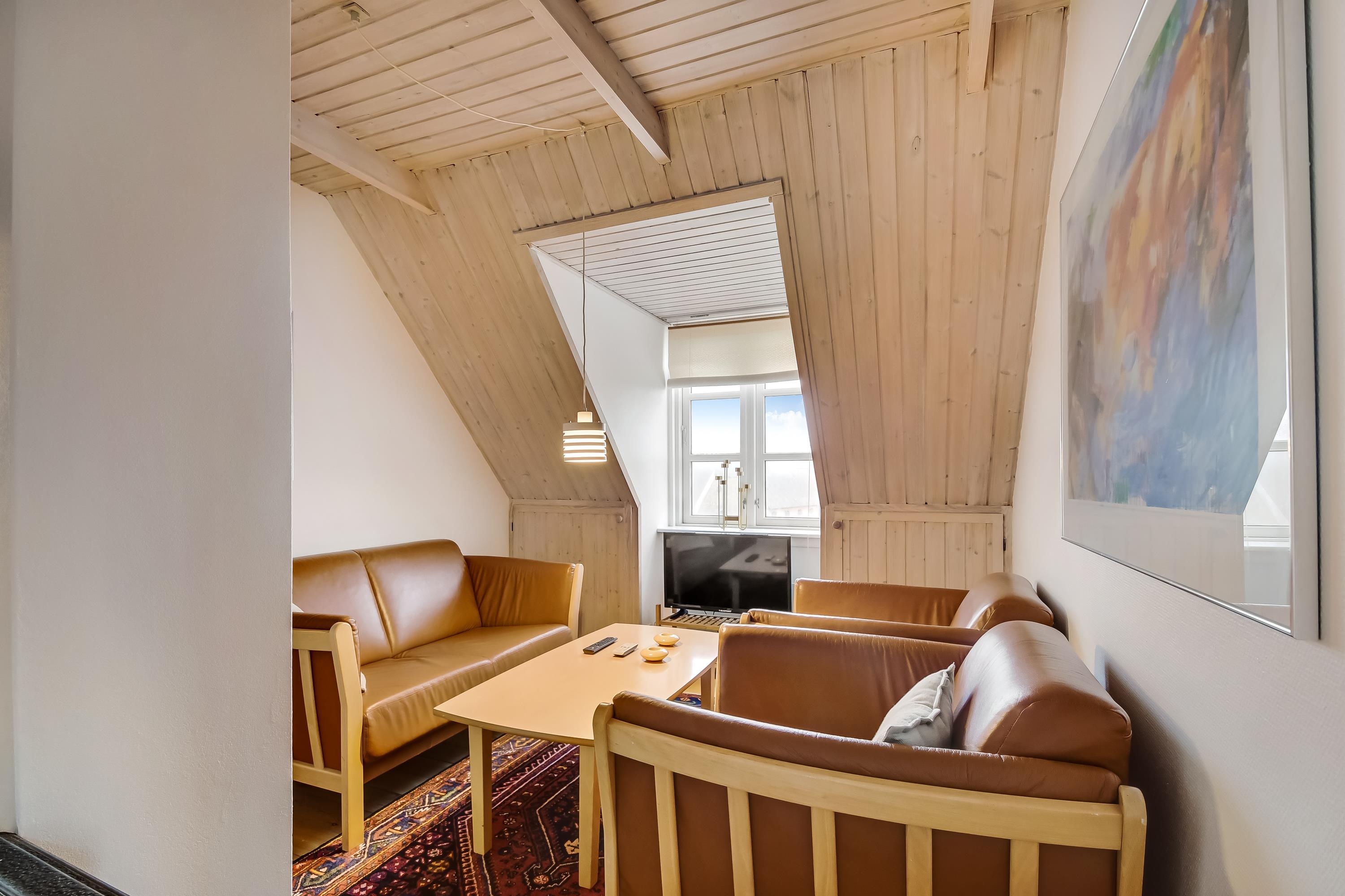 Stue med brændeovn og TV