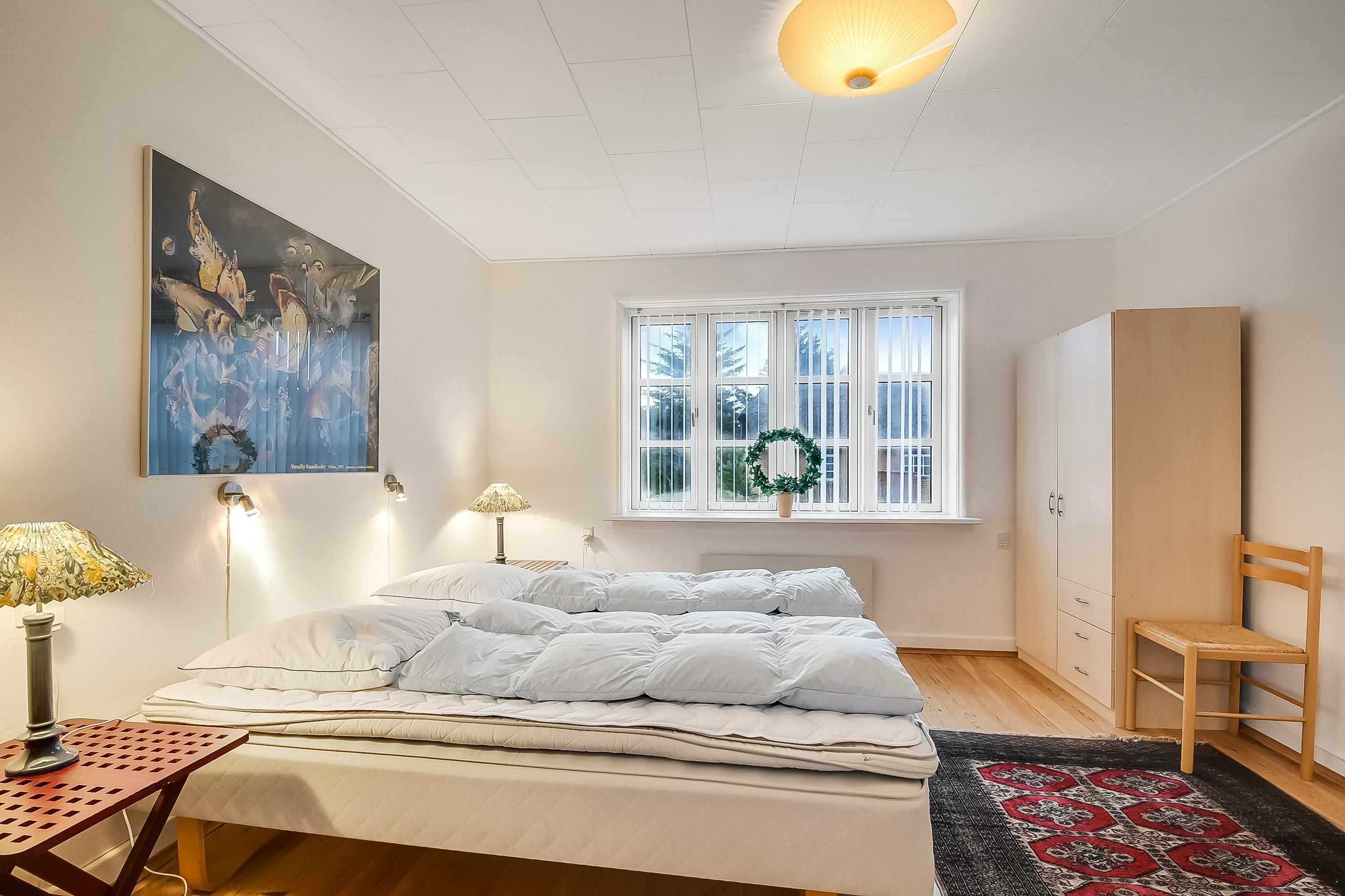 Soveværelse med stor dobbeltseng og plads til evt. barneseng