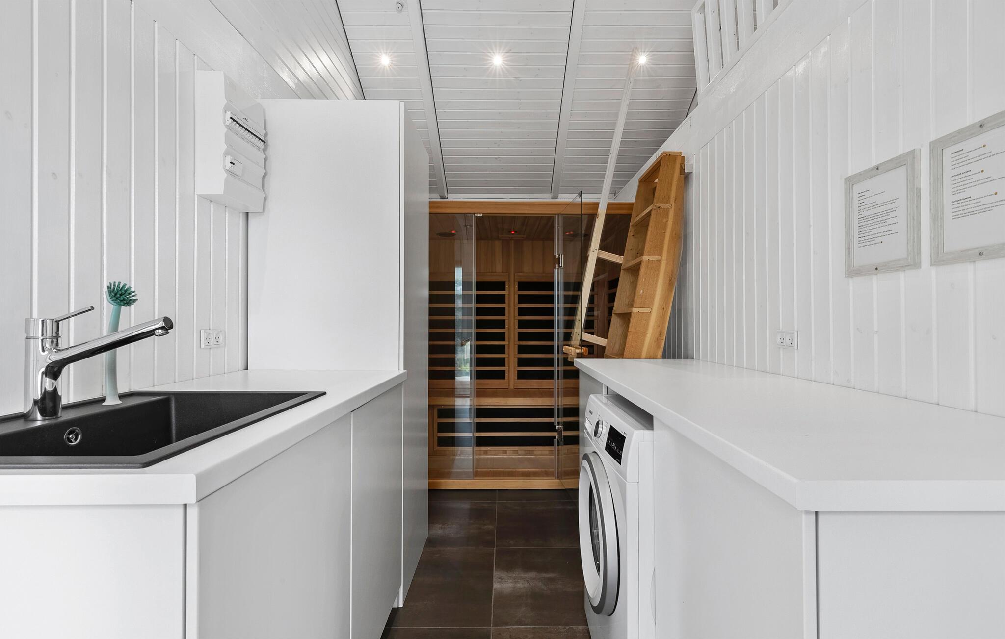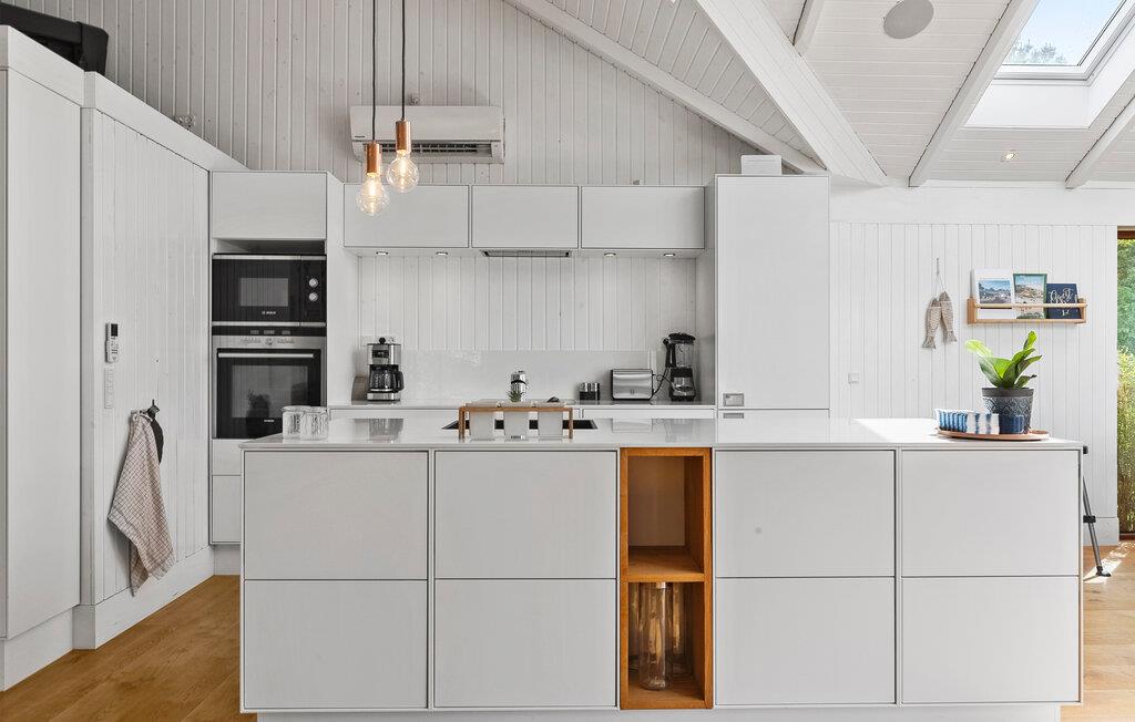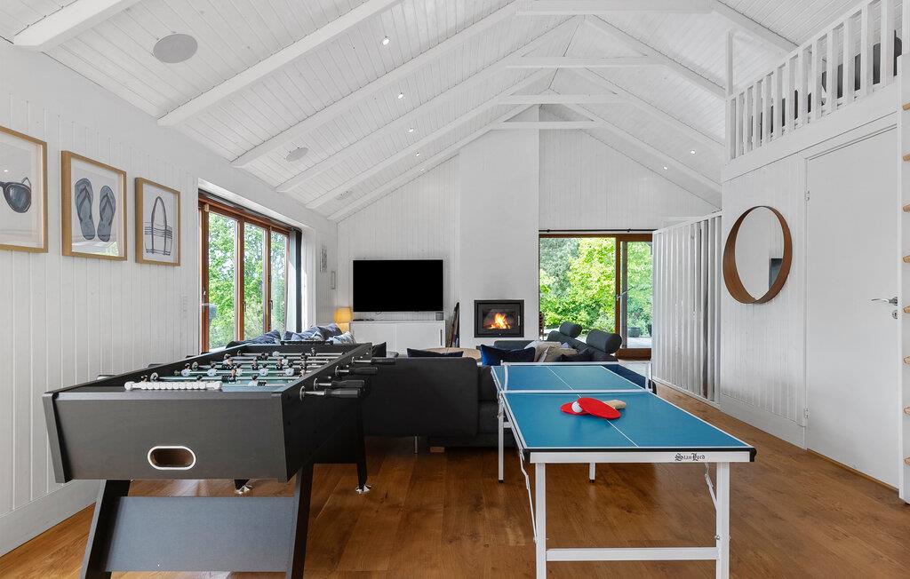 Dette moderne feriehus tilbyder en lys, åben atmosfære med lækre indretningsløsninger og masser af plads til at slappe af. Tilbring tiden i den smagfulde opholdsstue med brændeovn, et stort sofaområde og direkte adgang til terrassen. Spil bordfodbold eller minibordtennis, og brug det moderne køkken med køkkenø til at lave mad sammen. Den tilstødende spisestue med ovenlysvinduer tilbyder en lys atmosfære. Forkæl jer selv med afslappende timer i spabadet og saunaen.