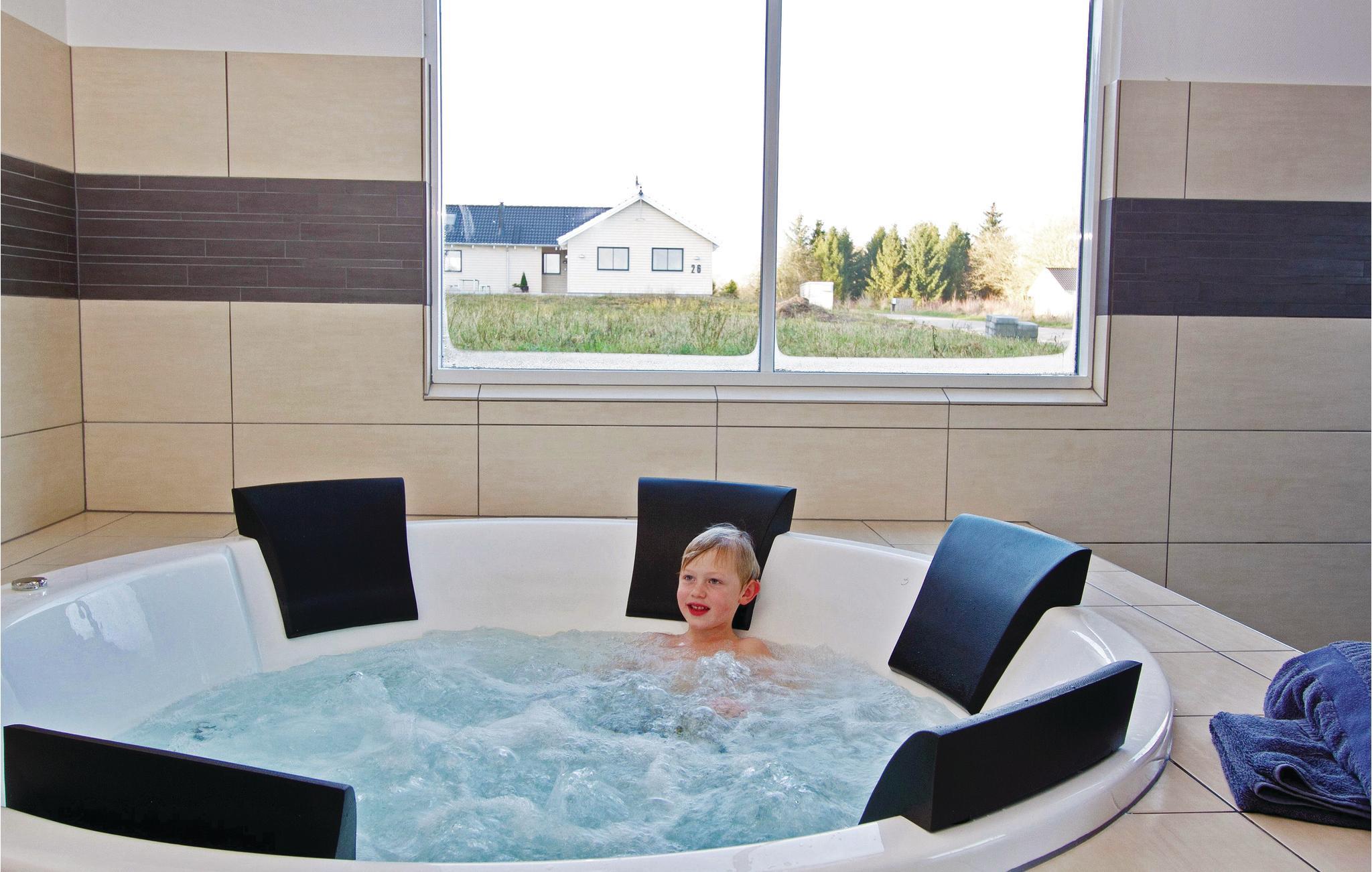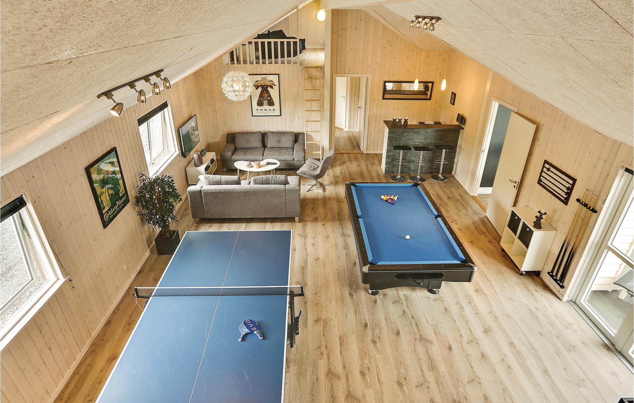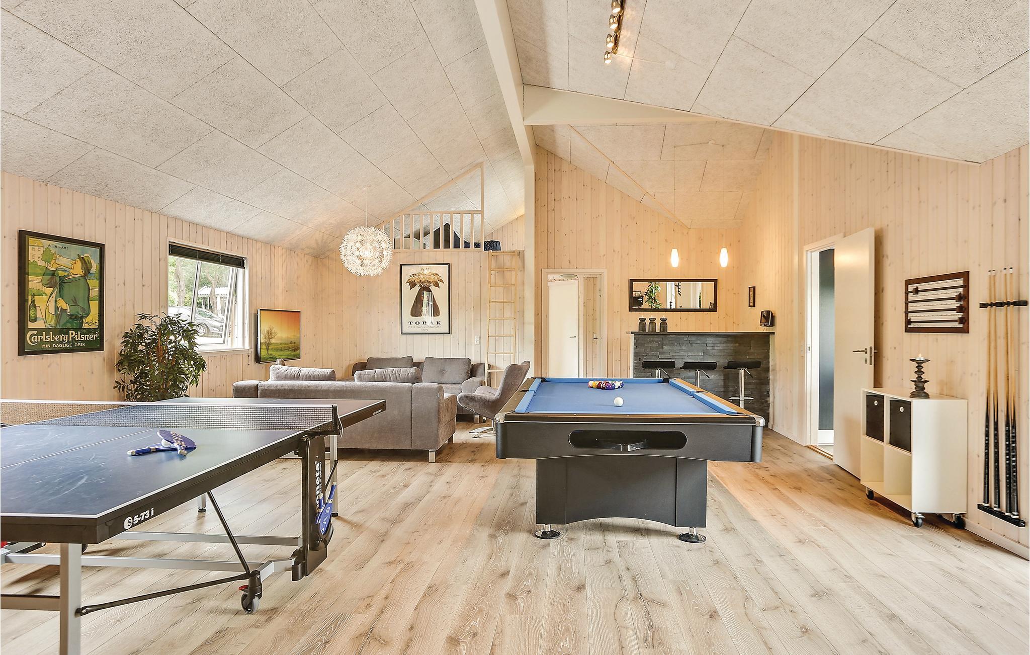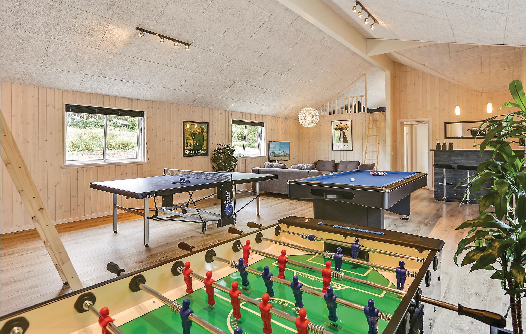 Her får I et rigtig lækkert feriehus med alt i udstyr. Det flotte køkken/alrum ligger i åben forbindelse med opholdsstuen, og vil helt sikkert blive stedet hvor I samles, og hygger jer sammen. En anden stor attraktion i huset er den skønne swimmingpool med vandrutsjebane, hvor I kan boltre jer i det forfriskende vand med efterfølgende afslappende massage i spabadet eller en tur i saunaen - det er ren wellness. Aktivitetsrummet byder på både billard, bordfodbold, bordtennis og mange andre aktiviteter. Når roen sænker sig om aftenen, kan I afslutte en dejlig dag med en drink i baren. I huset findes ni gode soveværelser samt en hems, der er specielt velegnet til børnene, hvor de vil nyde at hygge sig. Tre flotte badeværelser fuldender oplevelsen. Feriehuset er et godt udgangspunkt for udflugter, oplev Heatherhilll eller troldeskoven i Tisvildeleje, her finder I også gode restauranter, caféer og små hyggelige butikker. Depositium og rengøring afregnes ved ankomst til huset.