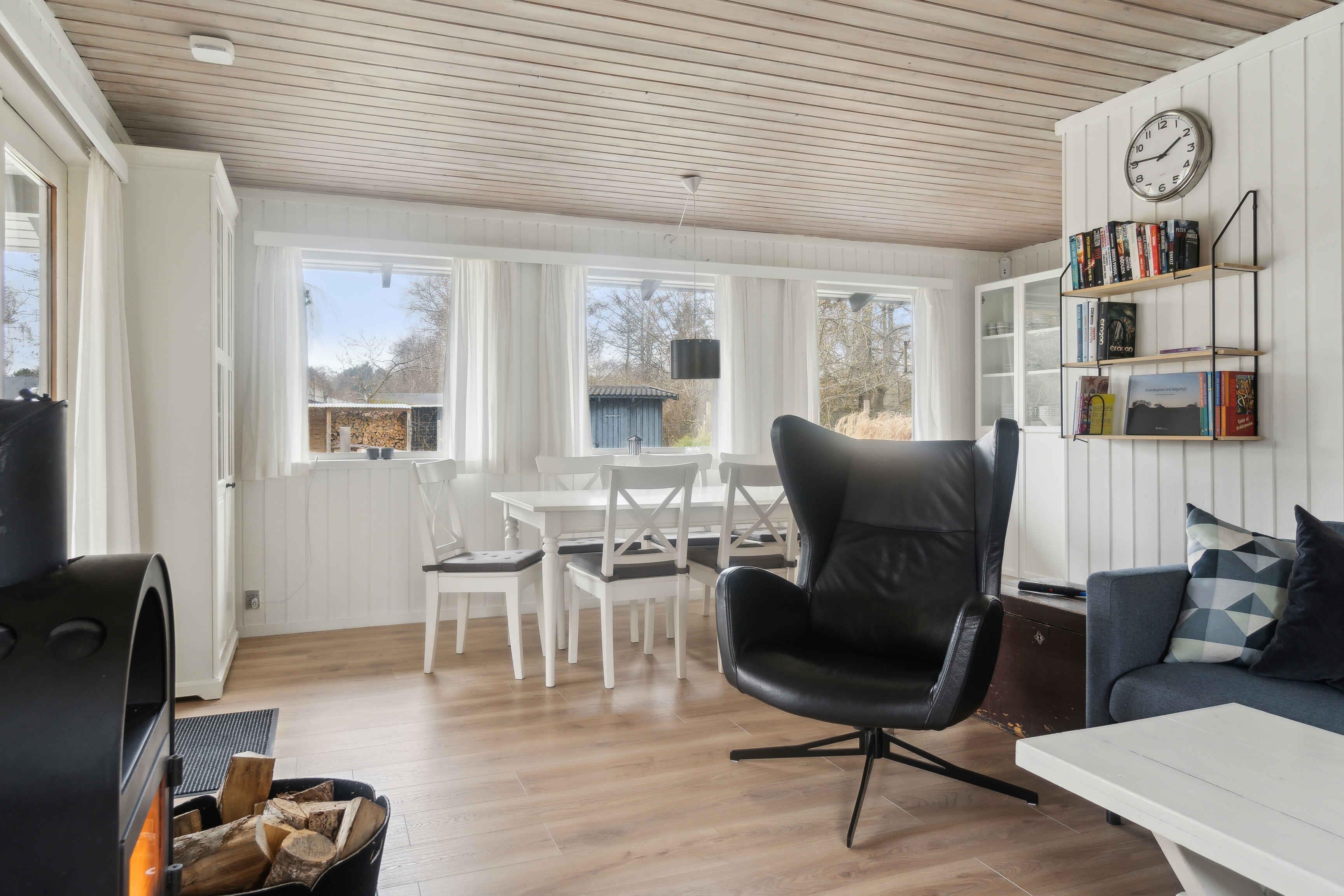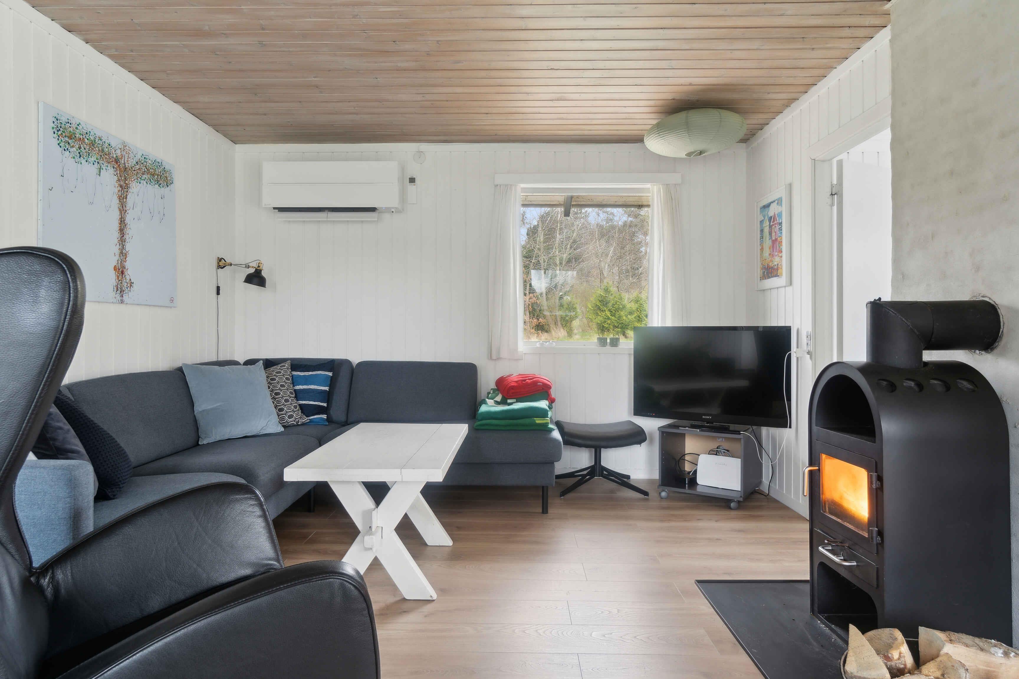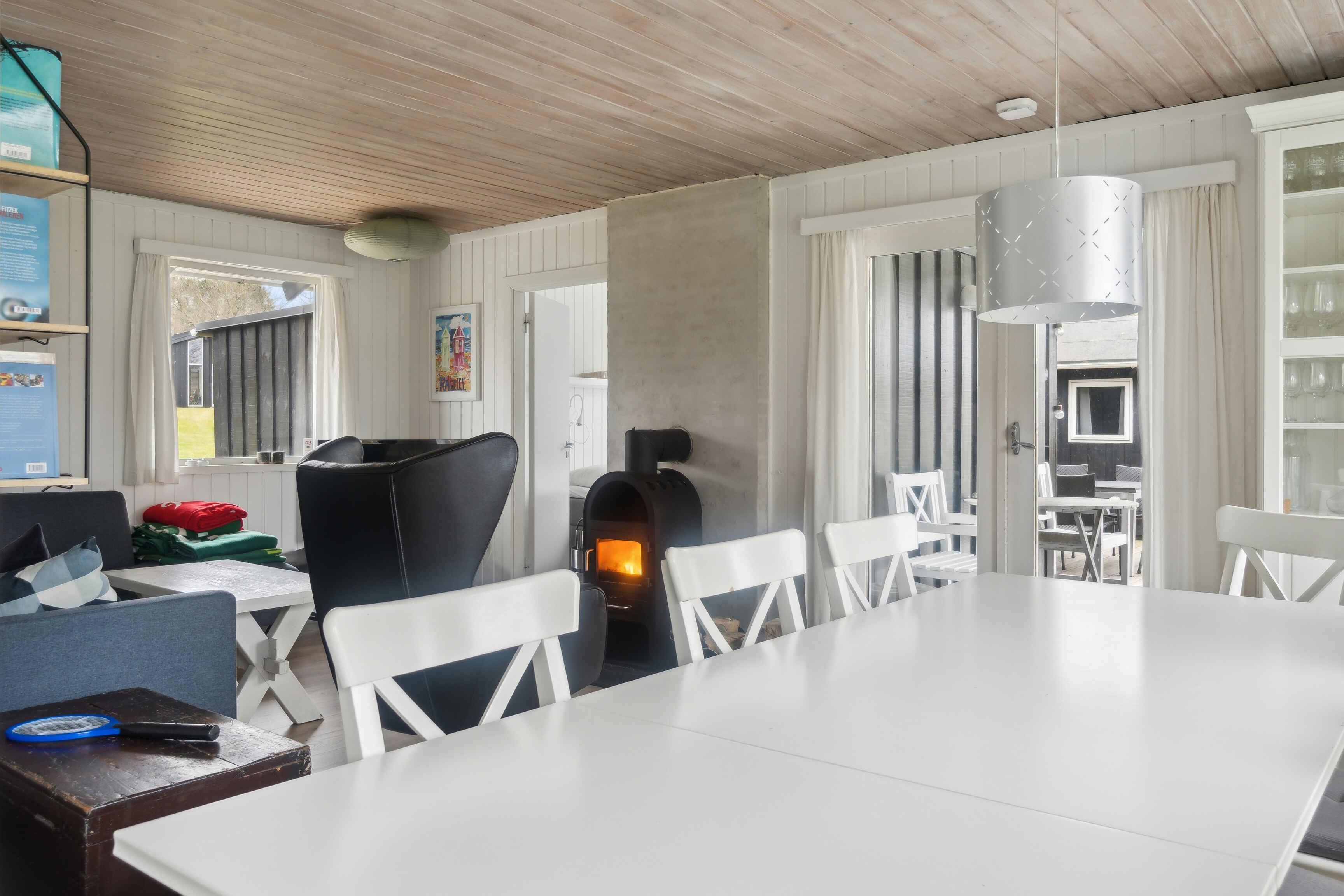 Sommerhus i rolige omgivelser, børnevenligt og tæt på strand (800m). Stor stue med brændeovn, 1 værelse med 3 sovepladser samt et soveværelse med dobbeltseng. Via træterassen er der adgang til annex med 2 enkelte sovepladser eller dobbeltseng.