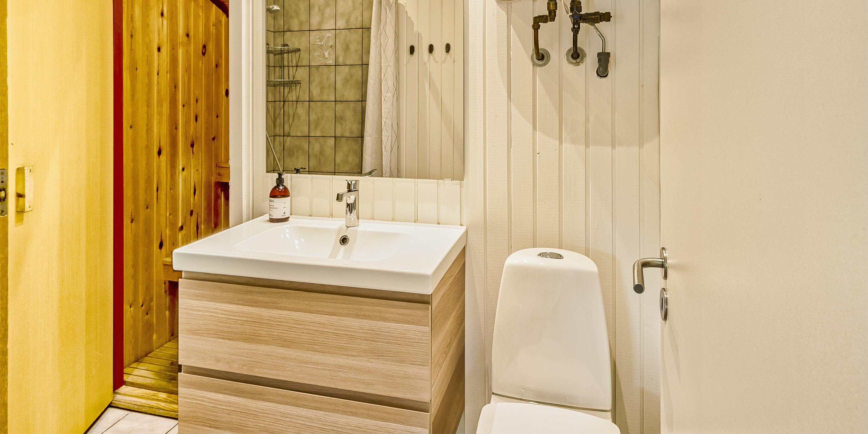 Bad med toilet, bruser og vask