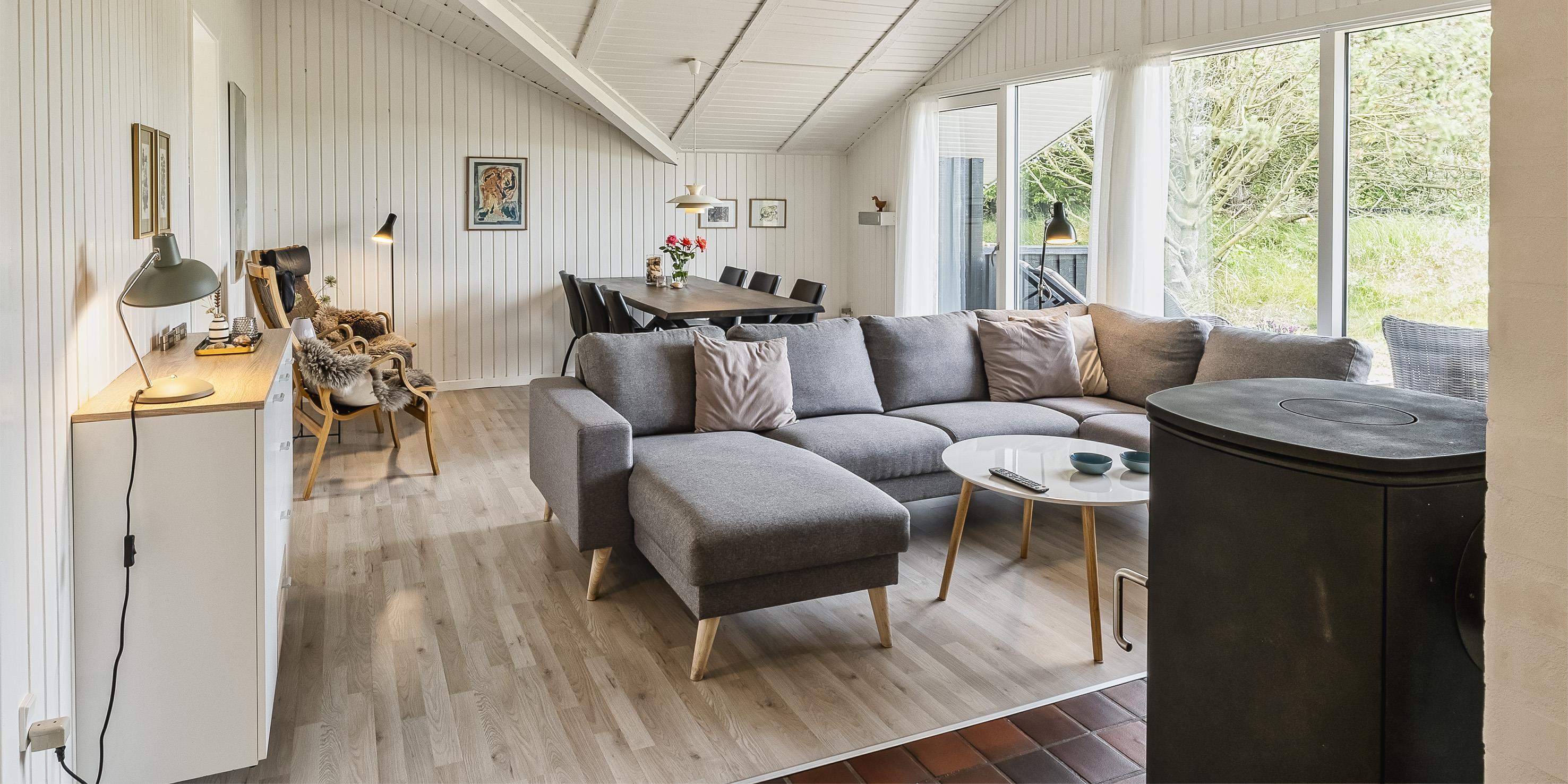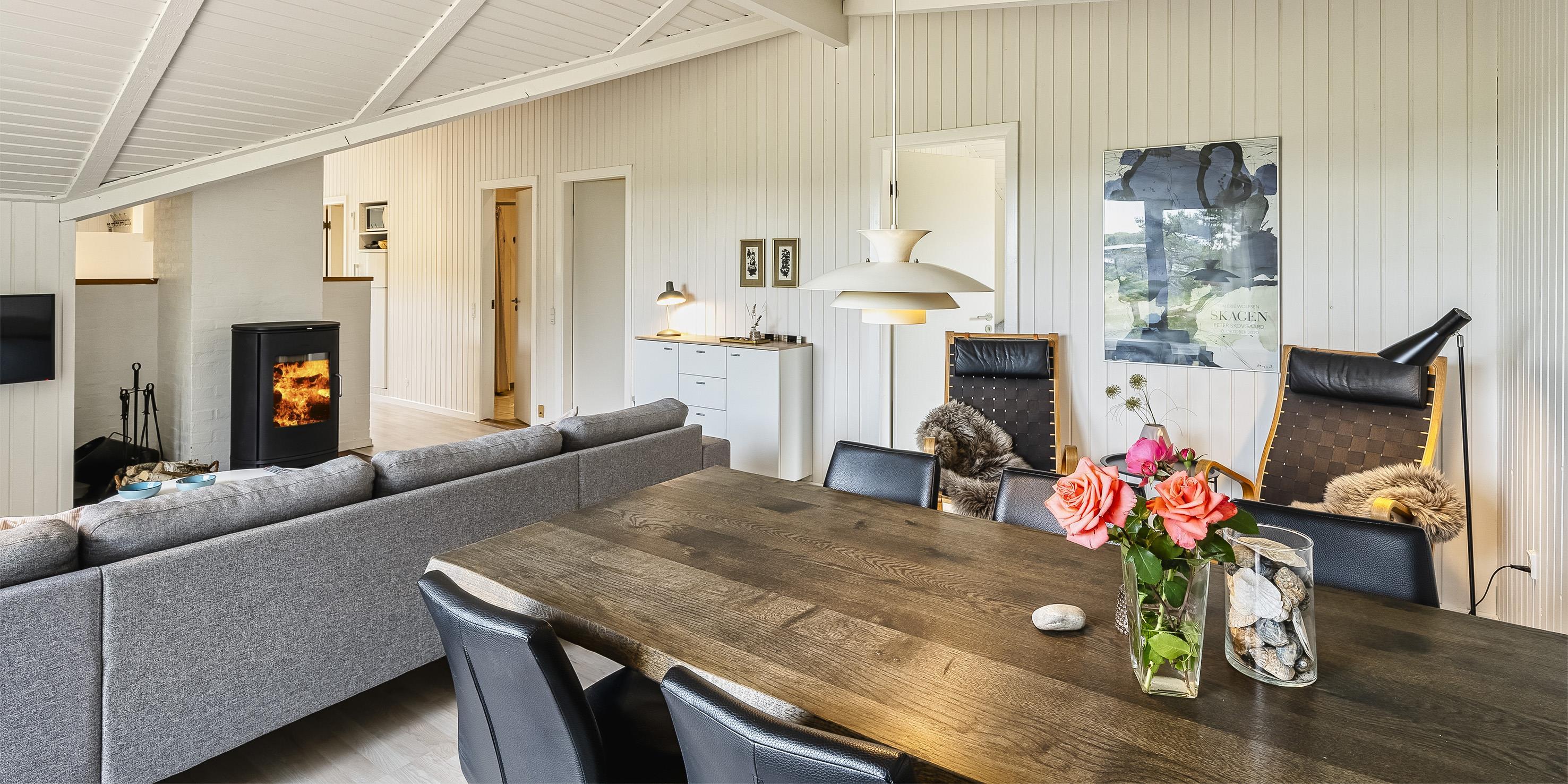 Huset indeholder: Indgangen er i åben forbindelse til huset opholdsrum. Fra indgangen kommer man ind til husets køkken. Køkkenet fremstår med køle-/fryseskab fra 2021, Helt ny bordplade med ny håndvask og armatur, opvaskemaskine samt helt ny indbygningsovn, keramisk kogeplade, emhætte fra 2024 og mikroovn. Den åbne opholdsstue byder på en dejlig sofagruppe med udsigt til terrassen og den dejlige naturgrund. Stuen fremstår med brændeovn, smart-tv med danske kanaler igennem stofa, endvidere er der parabol med udenlandske kanaler. Der er trådløs internet til benyttelse samt en varmepumpe. Stuen byder endvidere på en spiseafdeling for enden af opholdsrummet. Fra stuen er der adgang til 3 soveværelser: DS + DS + 2S. Badeværelse med bruser/wc, sauna. I forgangen forefindes en vaskemaskine og en tørretumbler. Dejlig træterrasse mod syd - delvis overdækket. Varmepumpe. Trådløs internetadgang (Fibernet 30/30). I oktober 2021 er der kommet 2 nye senge mål 180x200 cm. Byggeår 1984. Renoveret 2021/2022.