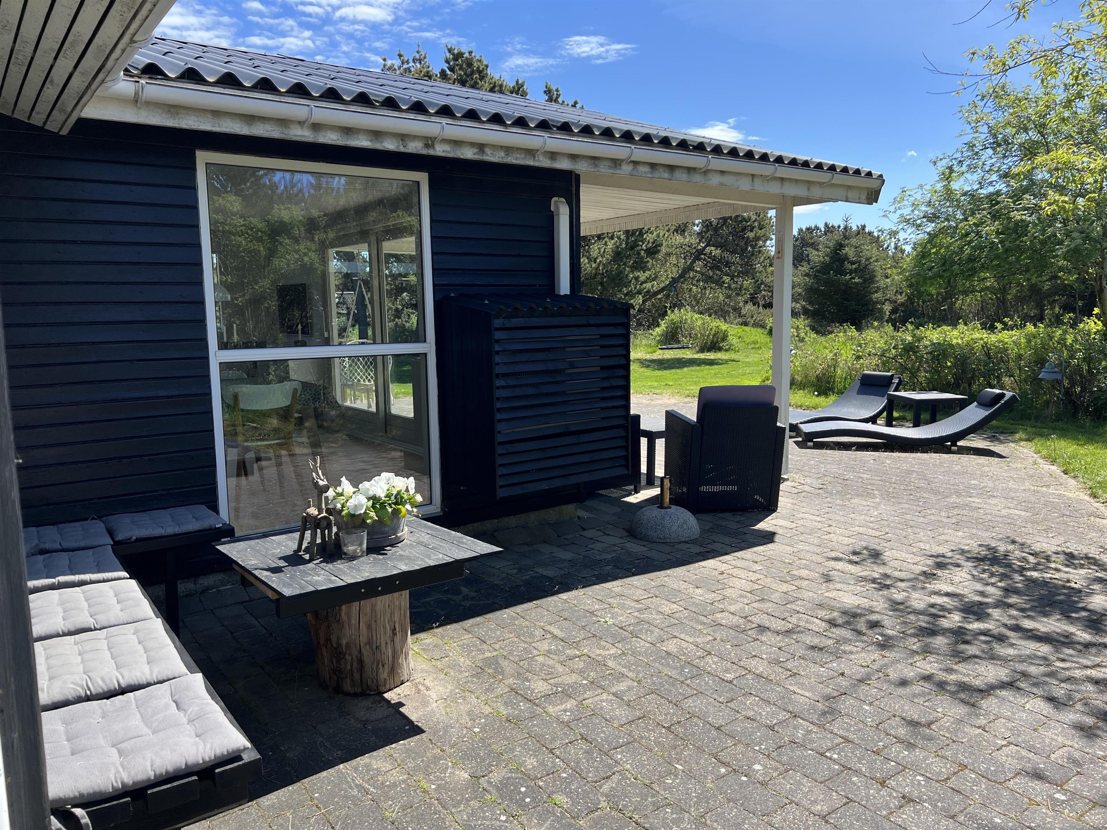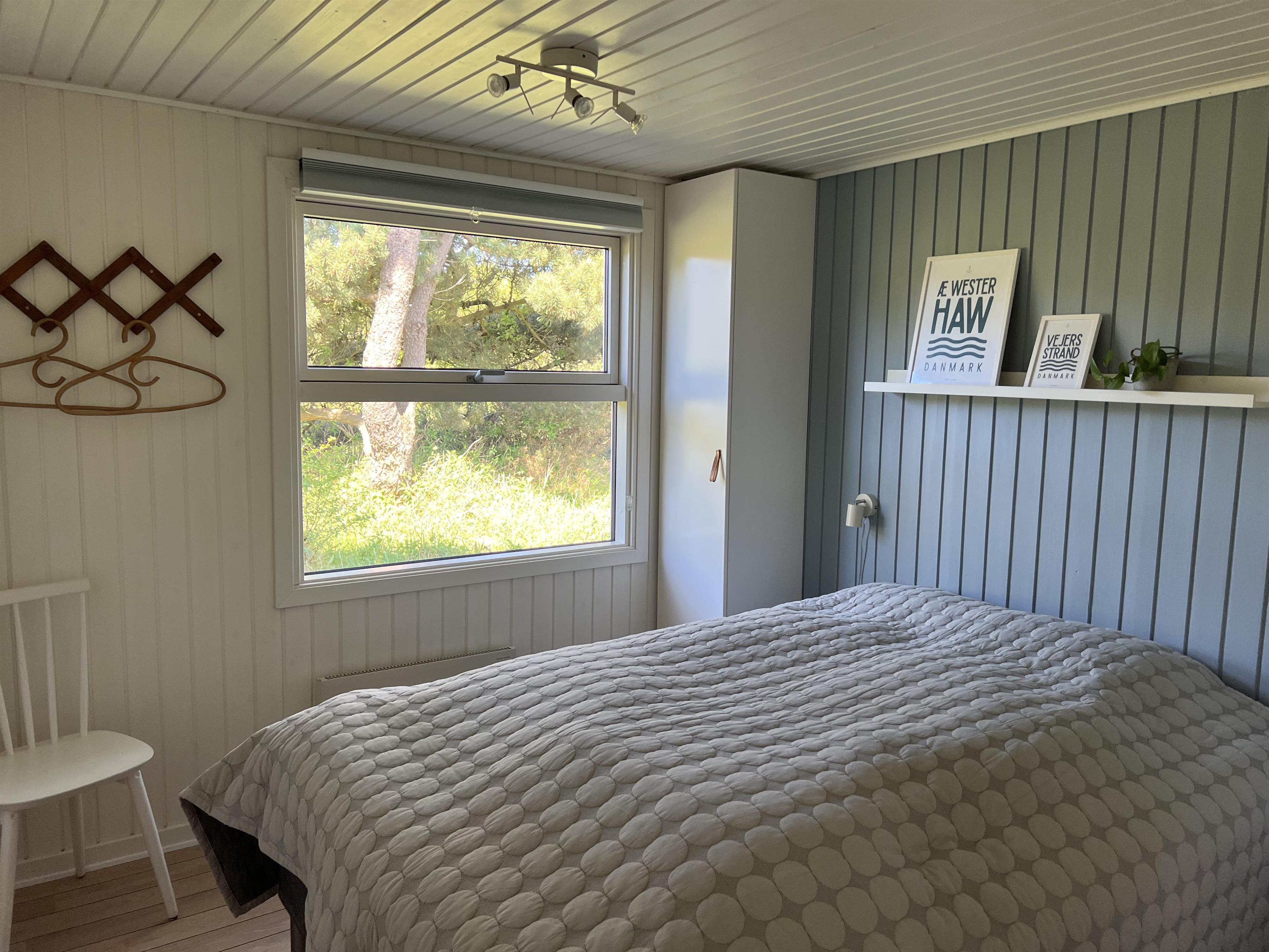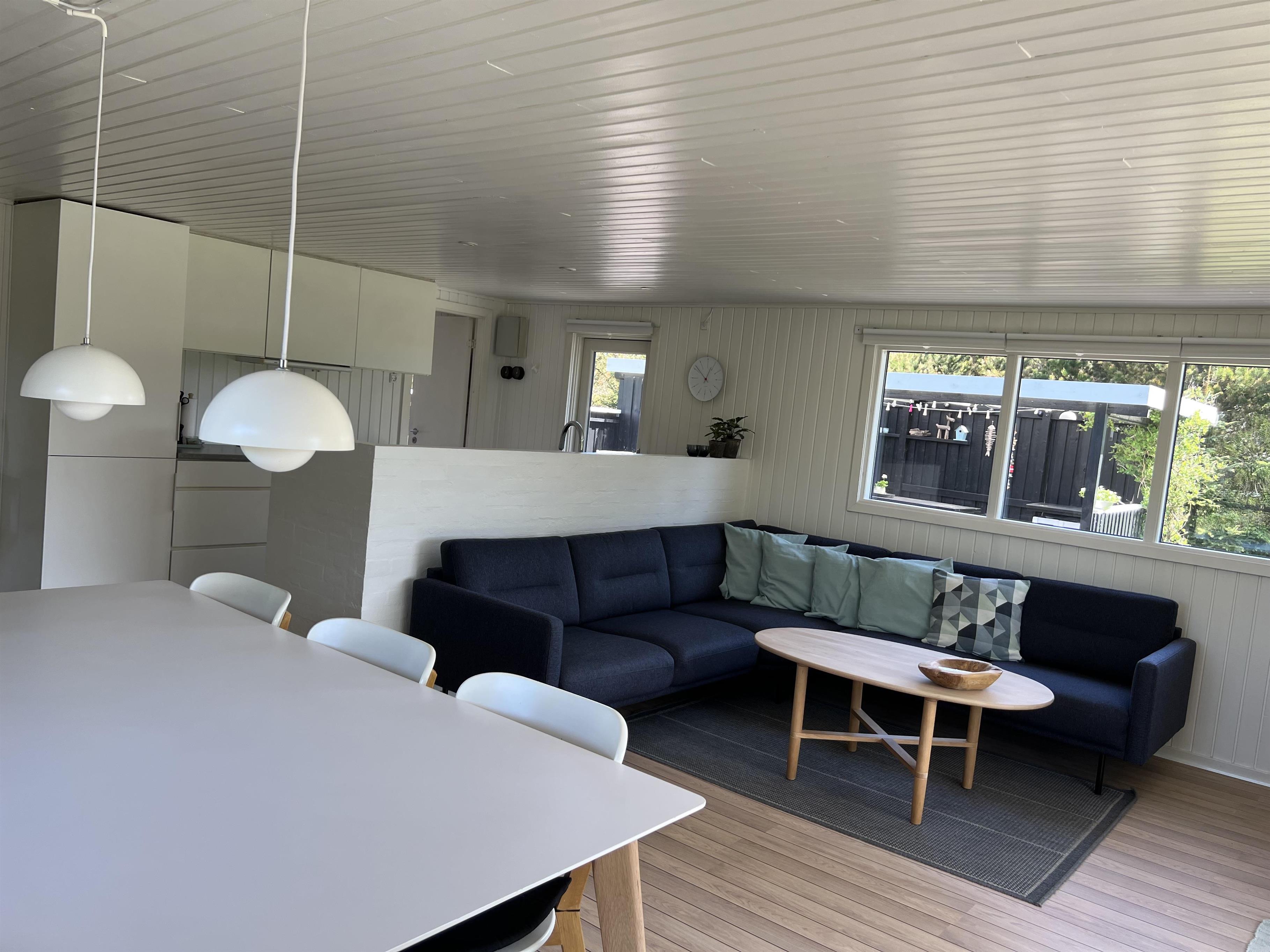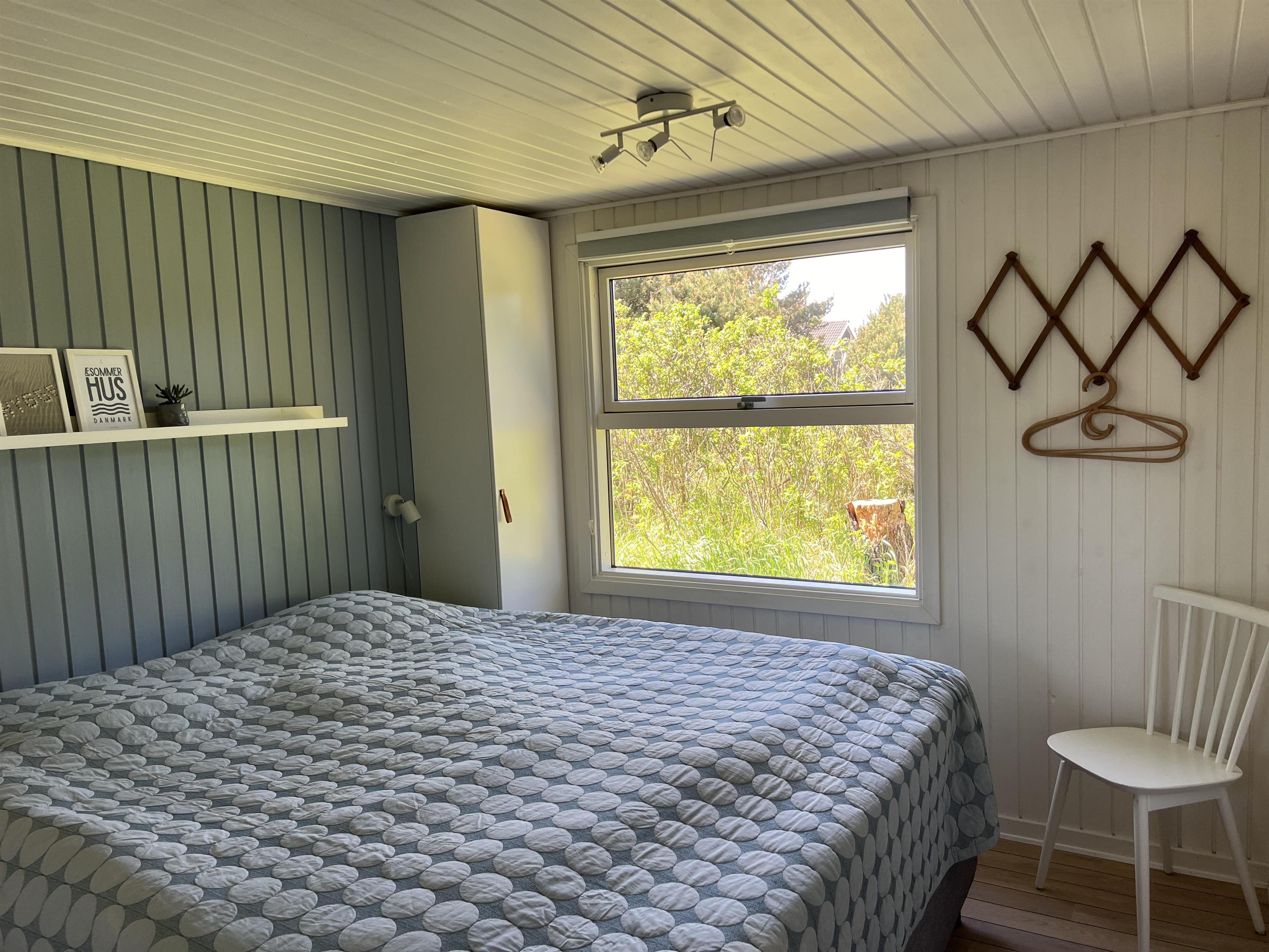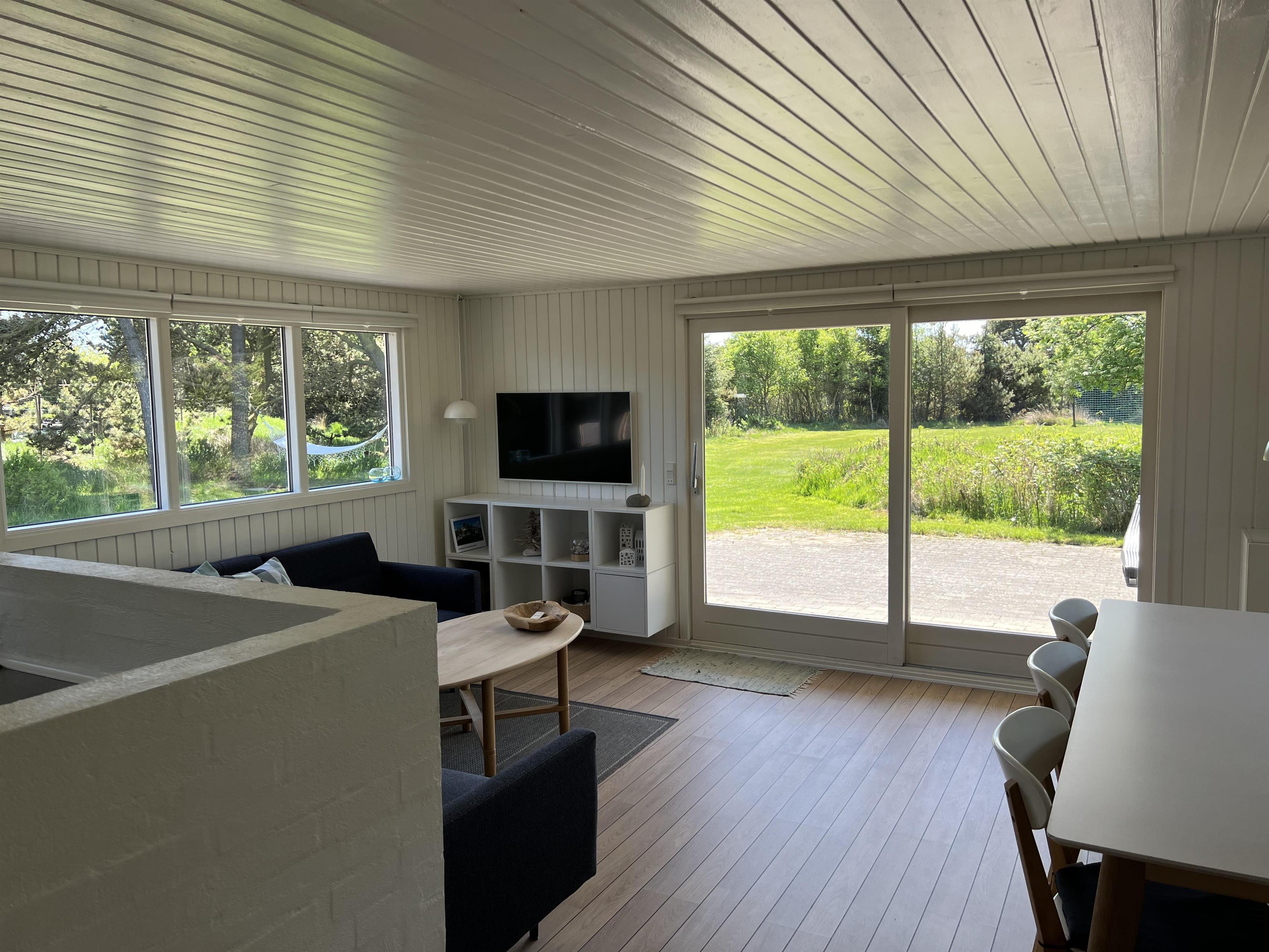 Charmerende lyst sommerhus til 6 Vejers fans, beliggende på naturskøn grund tæt ved skov og cykelsti. ca. 900 meter fra stranden. Huset indeholder: Indgang/entre med garderobeplads og lille hems til opbevaring eller hyggekrog for børn. Herfra er der indgang til badeværelse med bruseniche, vaskearrangement, toilet og vaskemaskine med tørretumbler. Fra gangen kommer man ind i et stort åbent og hyggeligt indrettet opholdsstue, der er indrettet med spisestue afdeling, brændeovn og hyggehjørne med hjørnesofa, Radio med bluetooth og DAB og fjernsyn (Stofa Tv og netflix hvortil man skal benytte egen kode). Varmepumpe. Opholdsstuen er ydermere i åben forbindelse med køkkenet. 3 soveværelser: DS + DS + 2S.
