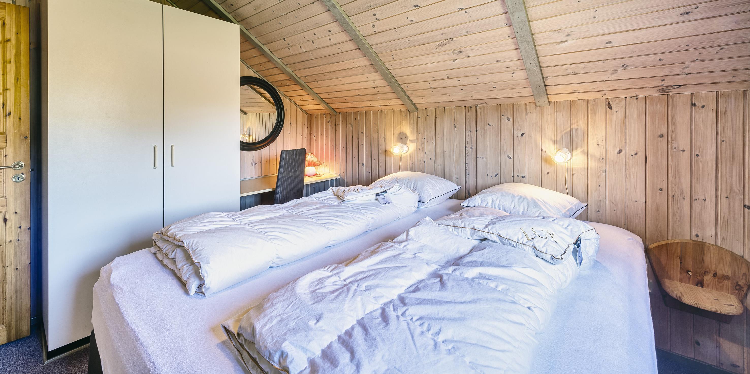 2 soveværelser med dobbeltseng 180x200 cm. 1 med 2 enkeltsenge (á 90x200 cm)