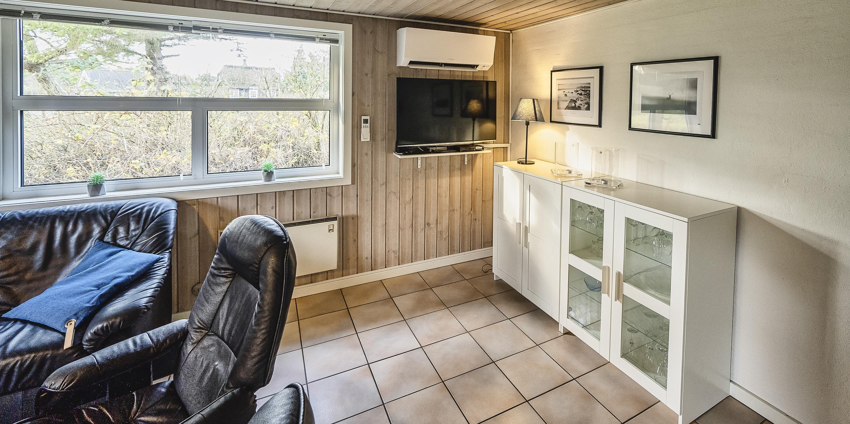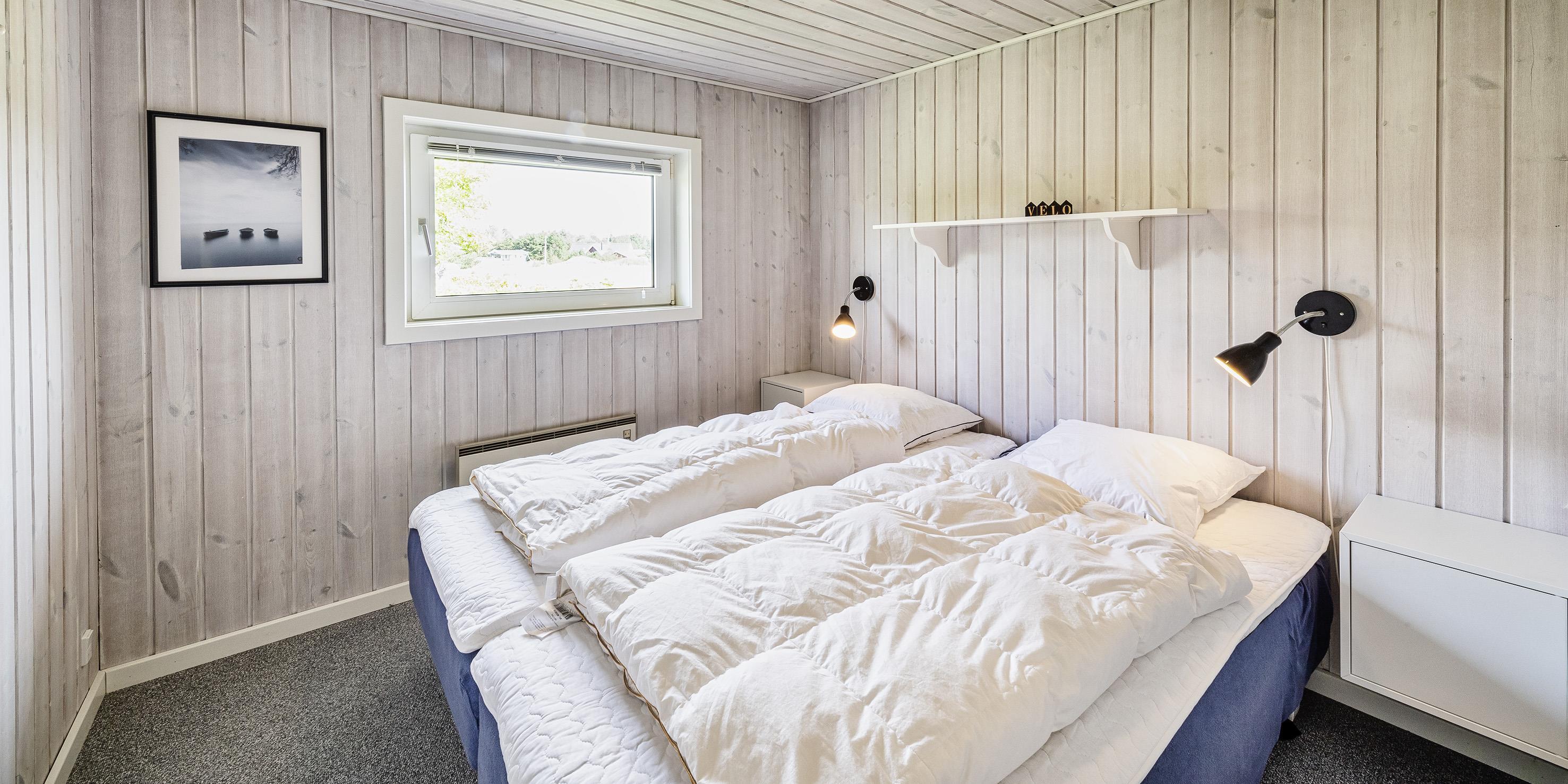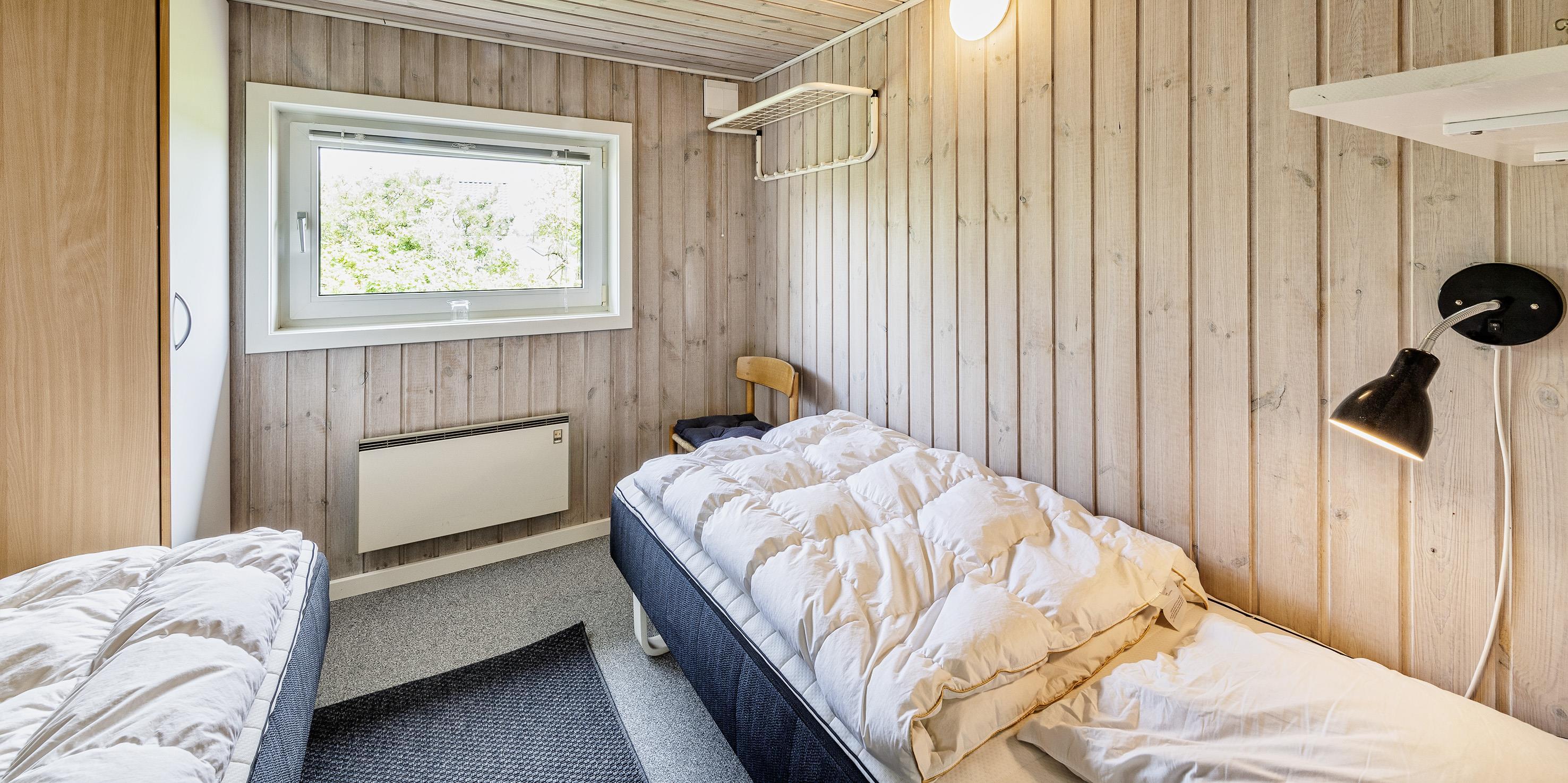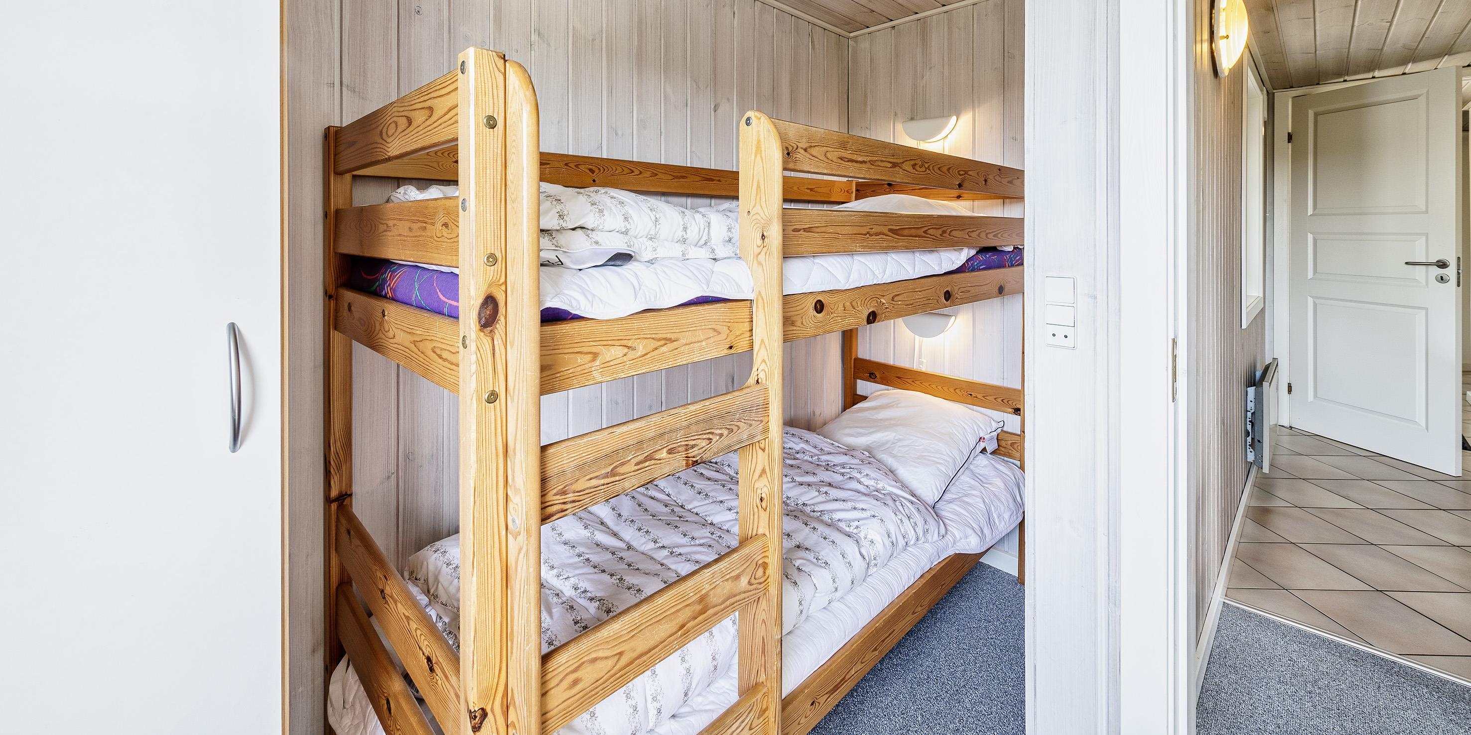3 soveværelser. 1 med dobbeltseng 180x200 cm. 1 med 2 enkeltsenge (á 90x200 cm). 1 med køjeseng.