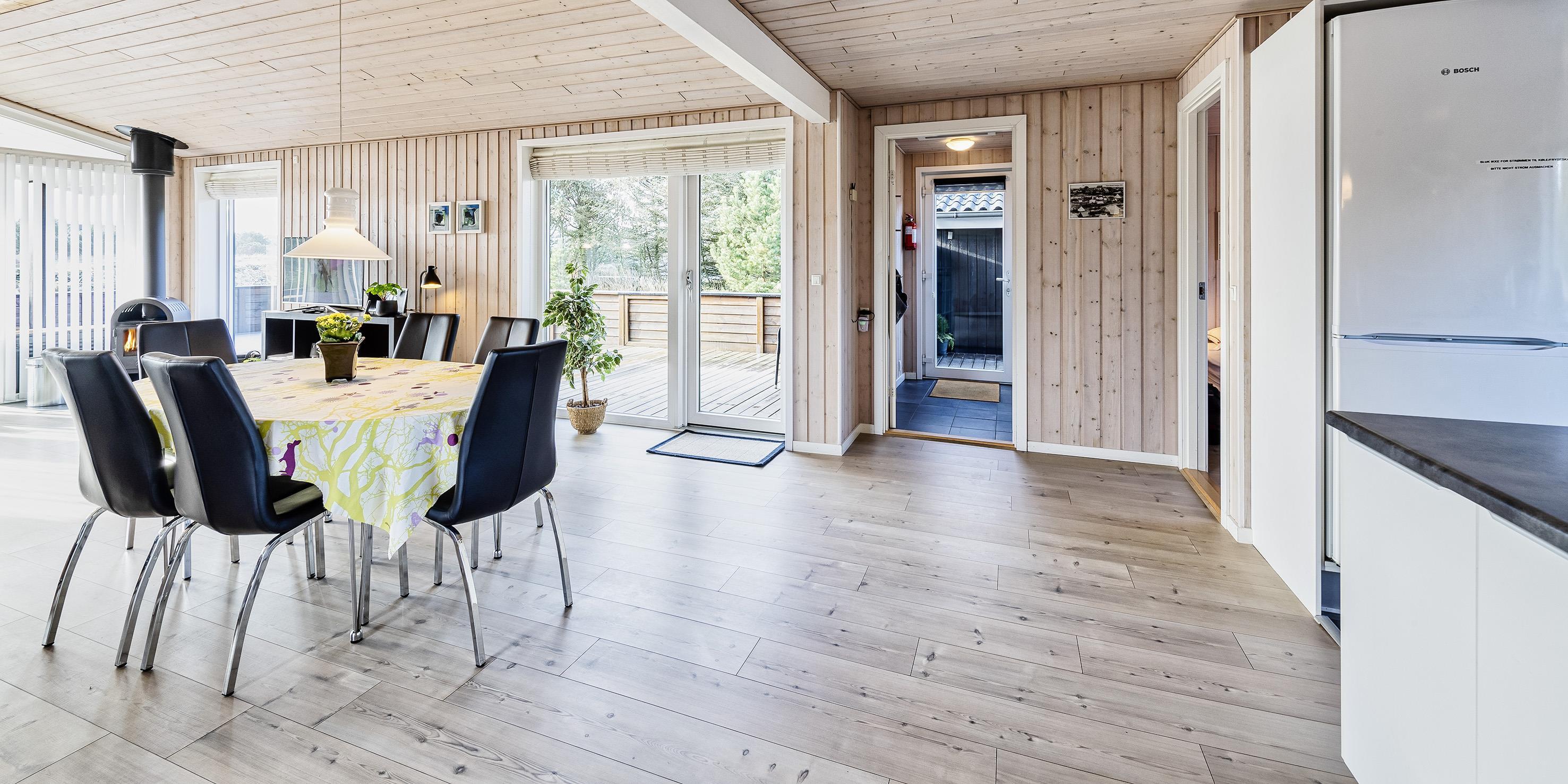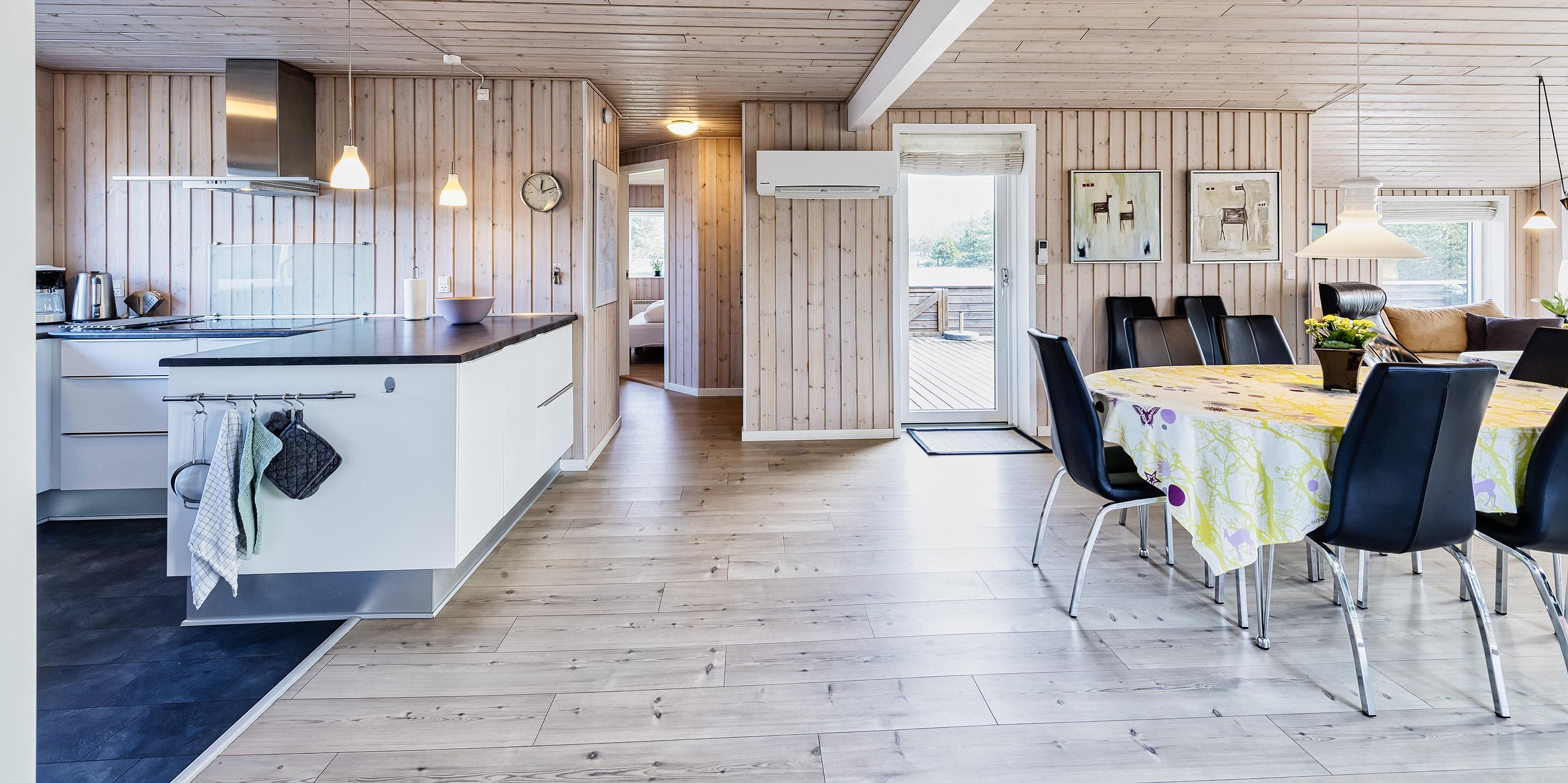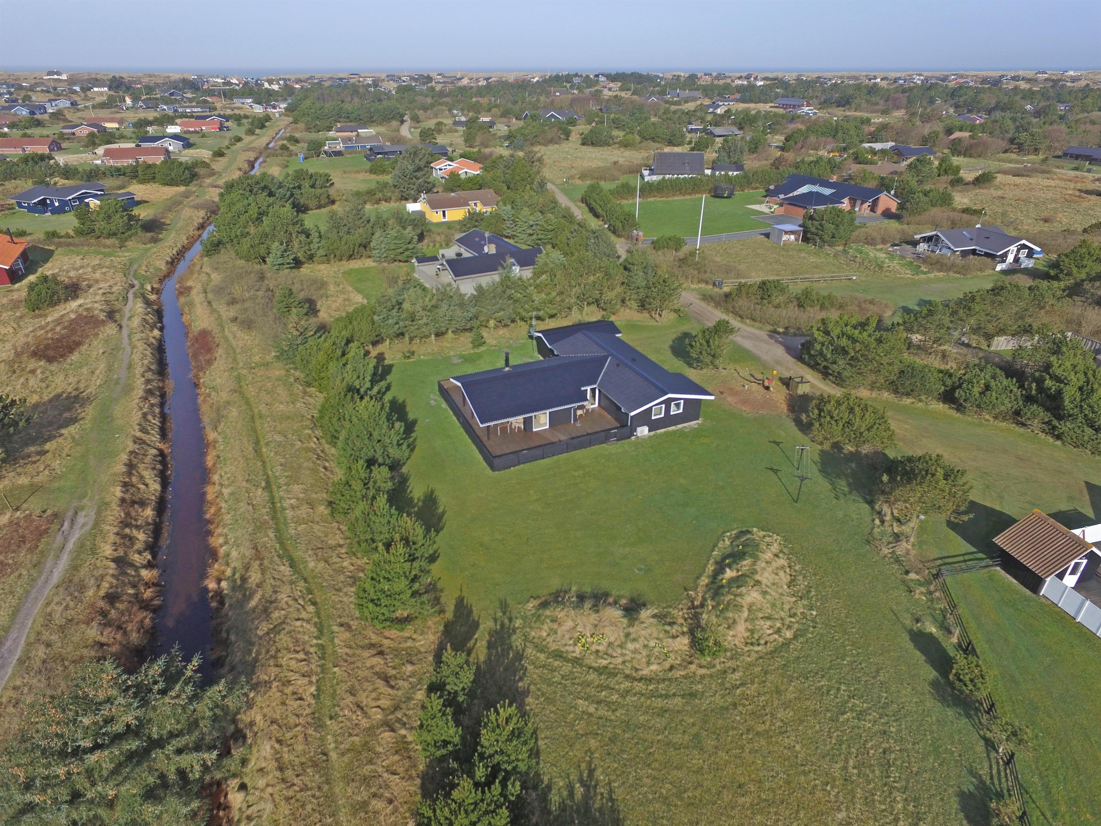 Hyggeligt og velplejet sommerhus til 6 Vejers fans, beliggende på naturskøn grund tæt ved skov og cykelsti. ca. 1000 meter fra stranden. Huset indeholder: Indgang/entre med garderobeplads, vaskemaskine og tørretumbler. Fra gangen kommer man ind i et stort åbent og hyggeligt indrettet opholdsstue, der er indrettet med spisestue afdeling, brændeovn og velindrettet sofahjørne med fjernsyn (DR programmer) og Chrome Cast. Klimaanlæg. Opholdsstuen er ydermere i åben forbindelse med køkkenet. Det velsorterede køkken råder over et køle-/fryseskab, varmluft ovn, keramisk kogeplade (Induktion), emhætte, mikroovn og opvaskemaskine. Fra den hyggeligt indrettede stue, er der udgang til en delvis overdækket lukket terrasse, hvor aften kan forlænges i det tidlige forår som efterår. Fra stuen er der indgang til 1 soveværelse med 1 dobbelt seng (2 x (90 x 200 cm)) og klædeskabe. Fordelingsgang med indgang til endnu 2 soveværelser med hver 1 dobbelt seng (2 x (90 x 200 cm)) 1 Badeværelse med bruser/wc. 3 soveværelser: DS + DS + DS. De udvendige forhold byder på en fantastisk lukket træterrasse samt en stor have, hvor børnene nemt kan udfolde sig på den store græsplæne der indbyder til boldspil. Rygning er ikke tilladt. Byggeår 1984. Ombygget 2010.