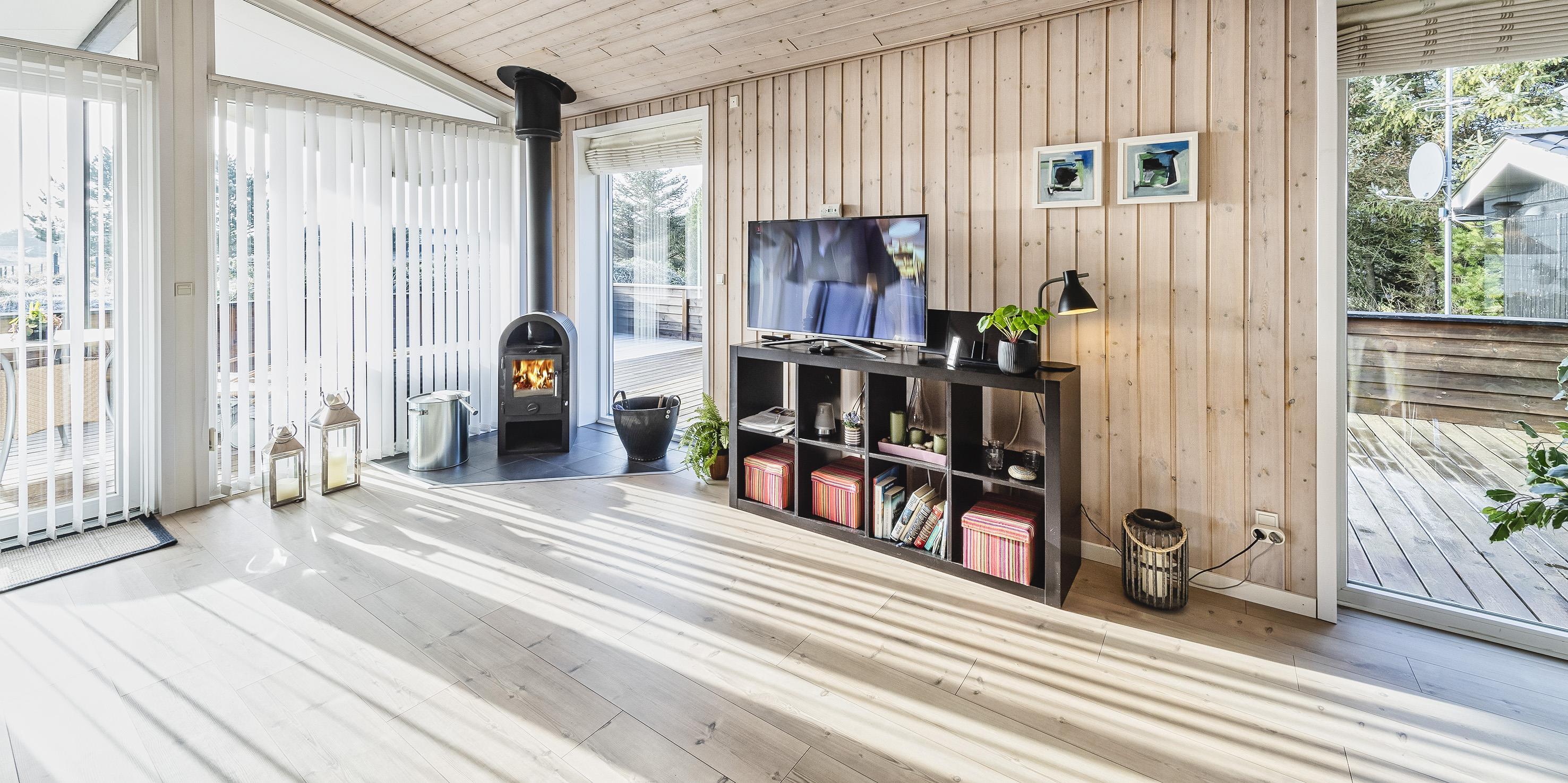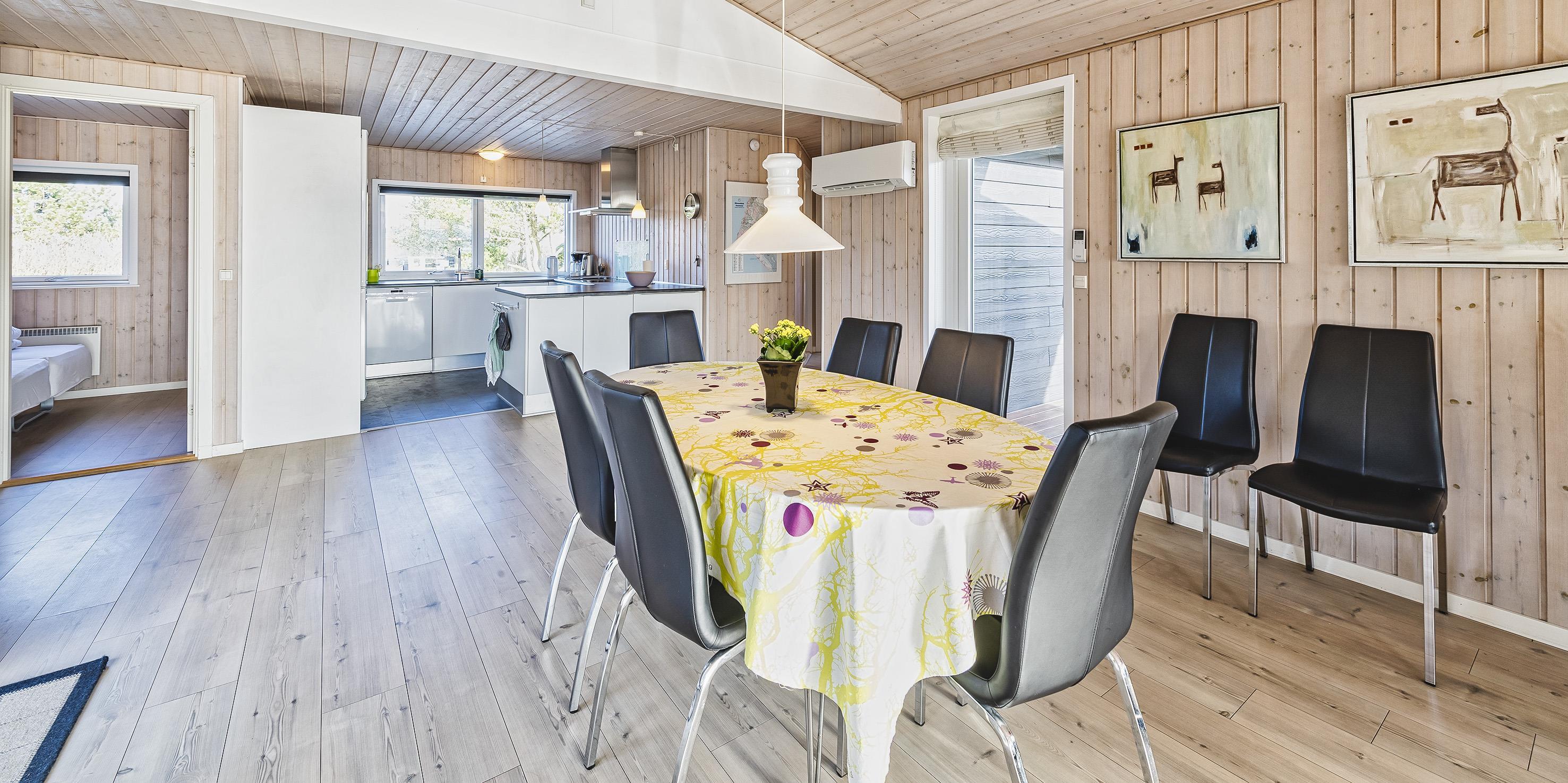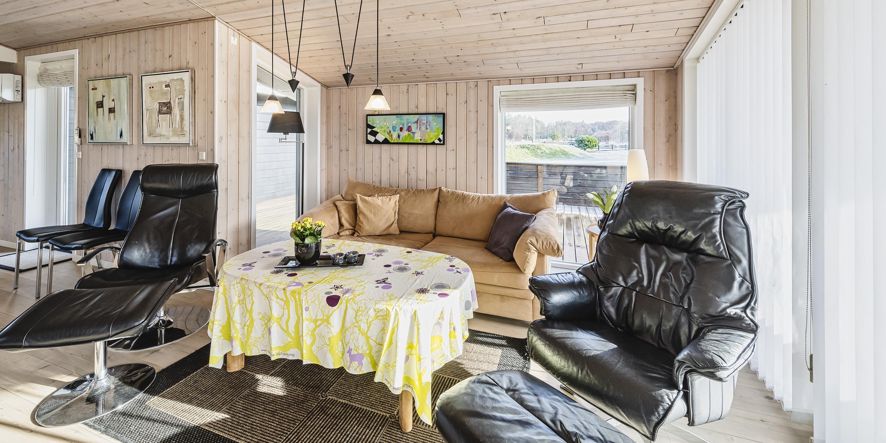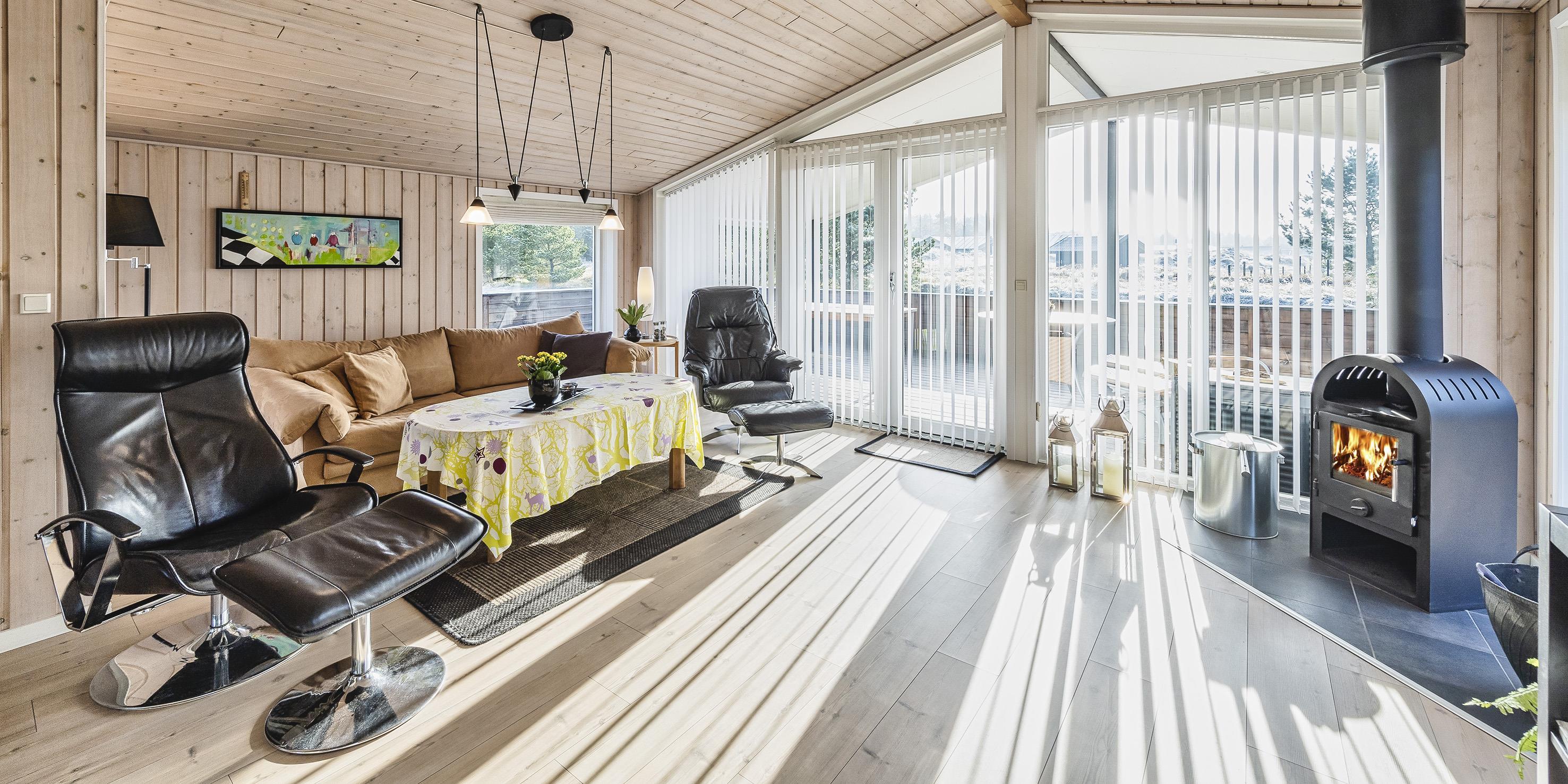 Hyggeligt og velplejet sommerhus til 6 Vejers fans, beliggende på naturskøn grund tæt ved skov og cykelsti. ca. 1000 meter fra stranden. Huset indeholder: Indgang/entre med garderobeplads, vaskemaskine og tørretumbler. Fra gangen kommer man ind i et stort åbent og hyggeligt indrettet opholdsstue, der er indrettet med spisestue afdeling, brændeovn og velindrettet sofahjørne med fjernsyn (DR programmer) og Chrome Cast. Klimaanlæg. Opholdsstuen er ydermere i åben forbindelse med køkkenet. Det velsorterede køkken råder over et køle-/fryseskab, varmluft ovn, keramisk kogeplade (Induktion), emhætte, mikroovn og opvaskemaskine. Fra den hyggeligt indrettede stue, er der udgang til en delvis overdækket lukket terrasse, hvor aften kan forlænges i det tidlige forår som efterår. Fra stuen er der indgang til 1 soveværelse med 1 dobbelt seng (2 x (90 x 200 cm)) og klædeskabe. Fordelingsgang med indgang til endnu 2 soveværelser med hver 1 dobbelt seng (2 x (90 x 200 cm)) 1 Badeværelse med bruser/wc. 3 soveværelser: DS + DS + DS. De udvendige forhold byder på en fantastisk lukket træterrasse samt en stor have, hvor børnene nemt kan udfolde sig på den store græsplæne der indbyder til boldspil. Rygning er ikke tilladt. Byggeår 1984. Ombygget 2010.