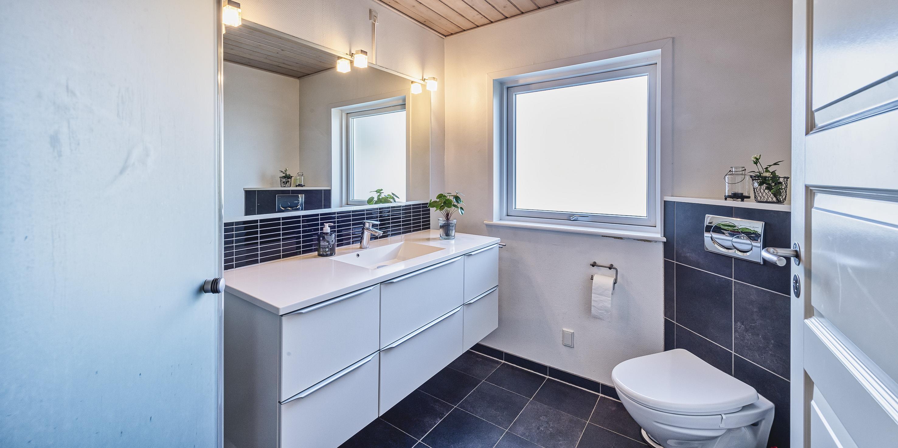 Bad med toilet, bruser og vask