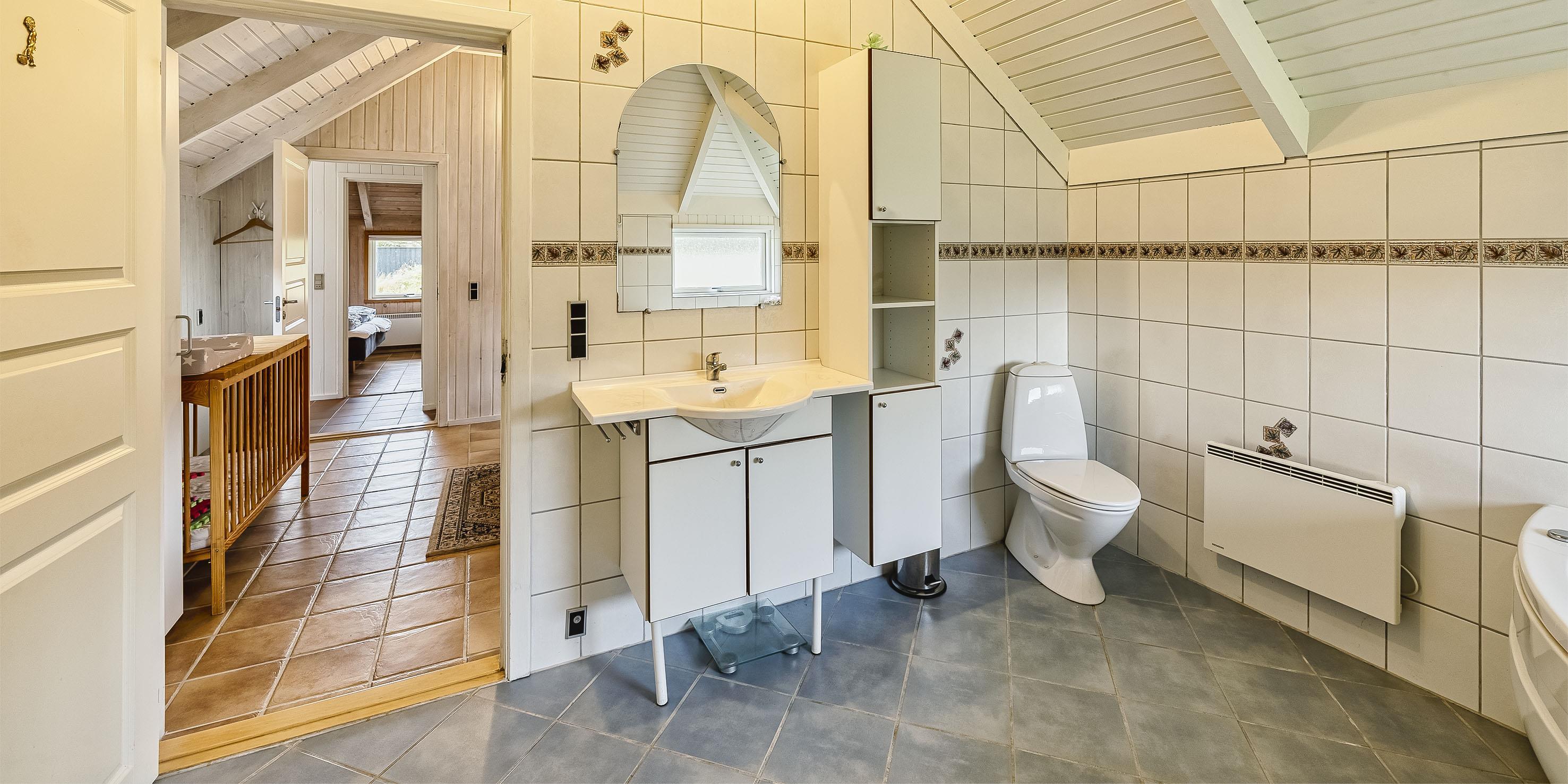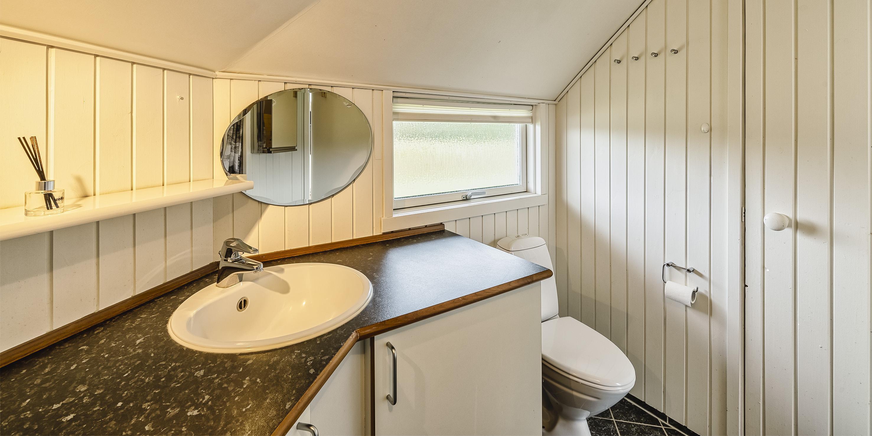 Bad med toilet, bruser og vask