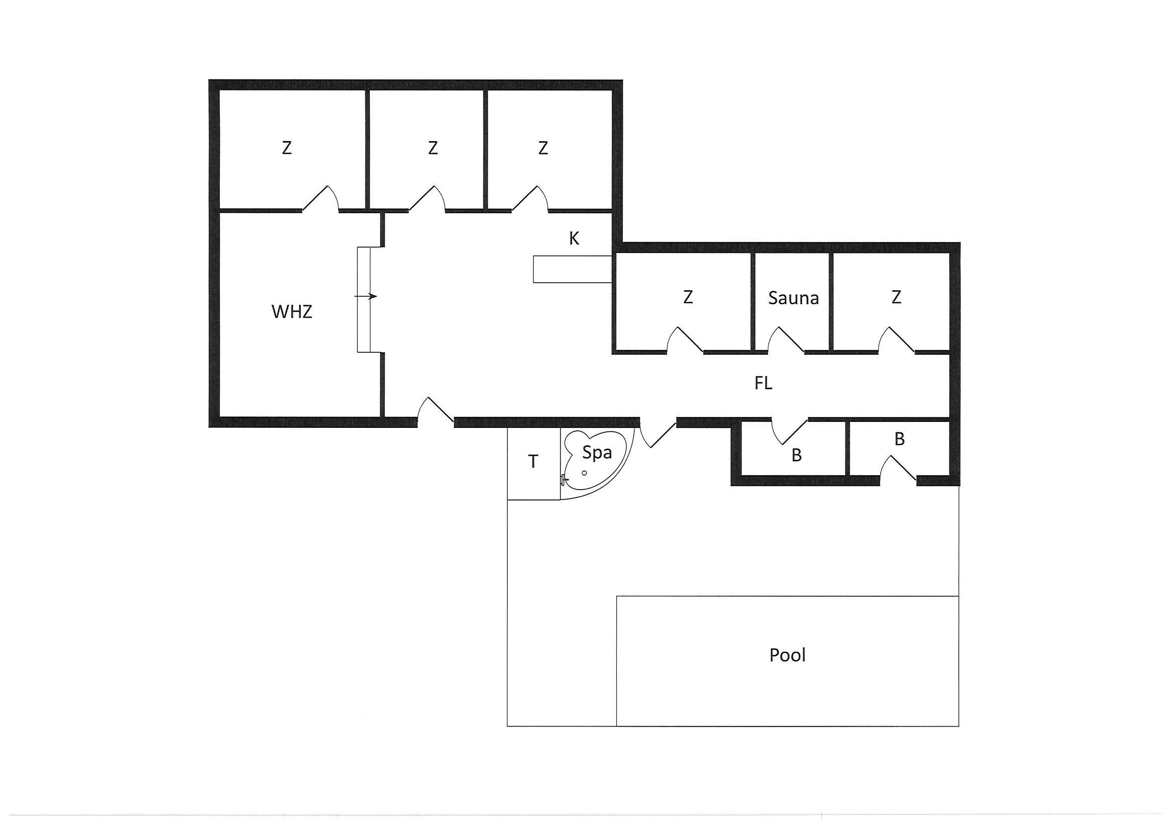 Sommerhuset: Huset råder over 2 dejlige badeværelser med gulvvarme. Huset har tørretumbler, vaskemaskine, sauna og spa med plads til 4 personer der ligger i forbindelse med poolrummet. Køkken i åben forbindelse med spiseplads og en hyggelig pejsestue, hvor der er et trin ned. Rummene er lyse og har et godt lysindfald. Indgangen til poolområdet er fra fordelingsgangen. Køkkenet byder på god komfort såsom opvaskemaskine, mikroovn, kogeplade, emhætte i loftet og køleskab med fryser. Dejlig pejsestue med brændeovn, fjernsyn og trådløs internetadgang. Poolrum med lounge sæt, Spa, poolen har en størrelse ca. 7 x 4 meter og dybden er ca. 1,50 meter . Huset har i alt 5 soverum. Alle 5 soveværelser råder over 1 dobbeltseng. Fra stuen er der adgang til en hems, hvor der ligeledes er en dobbeltseng. Huset er børnevenligt. Delvis lukket terrasse, som er flisebelagt. Grill forefindes i sommerhalvåret.