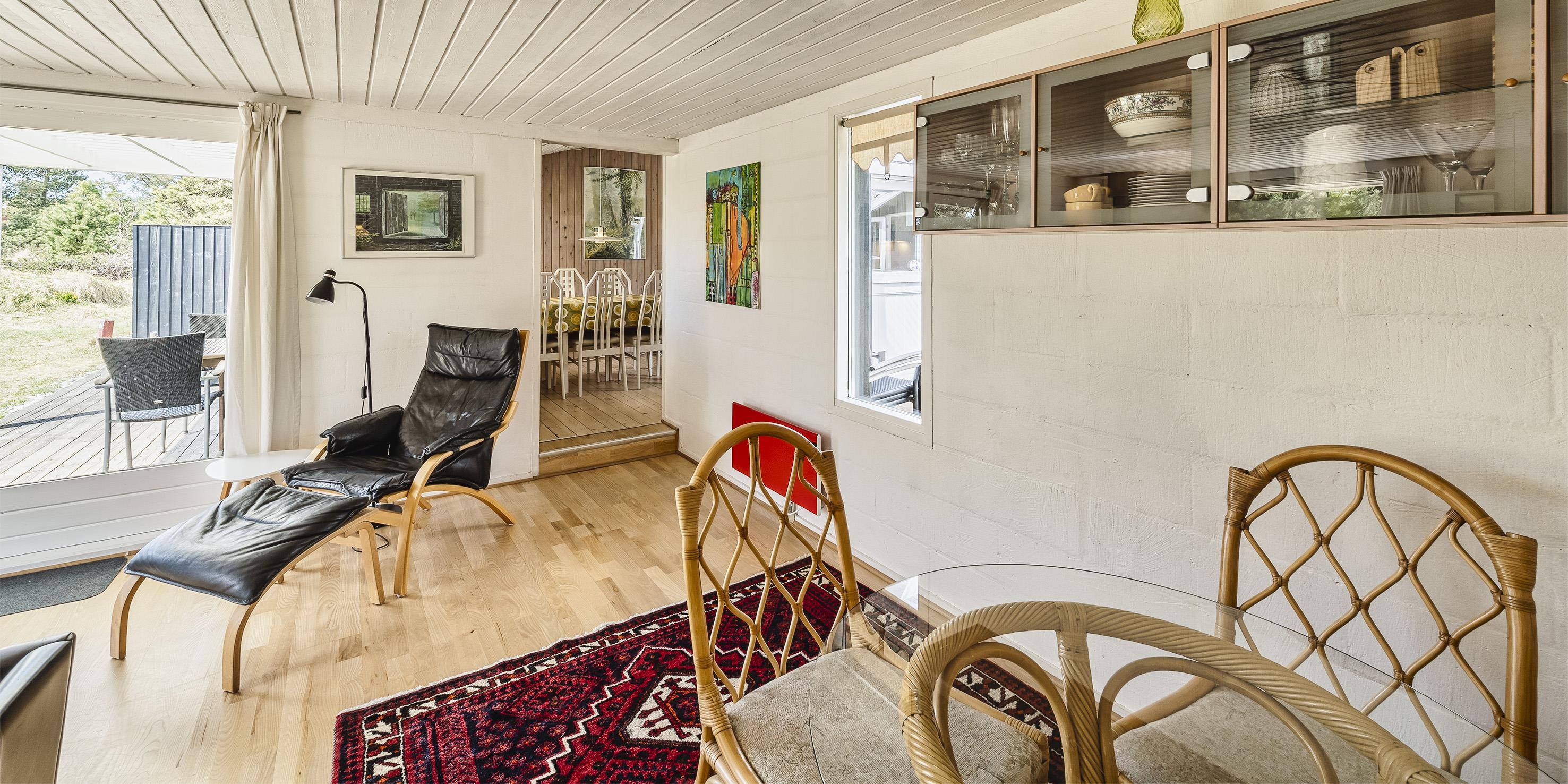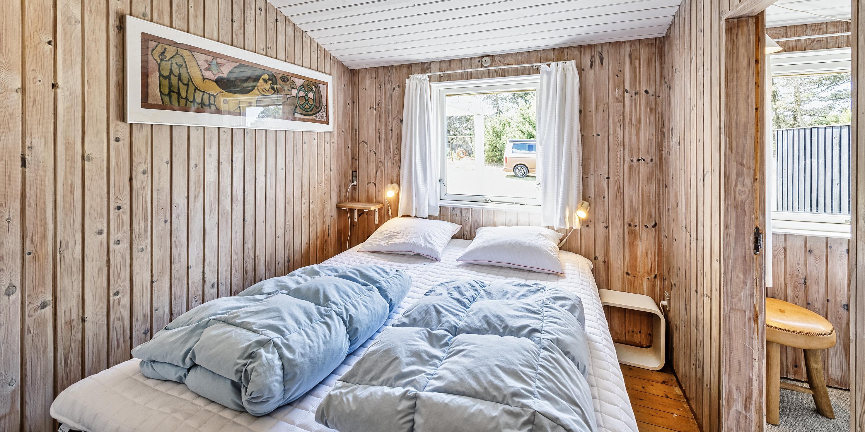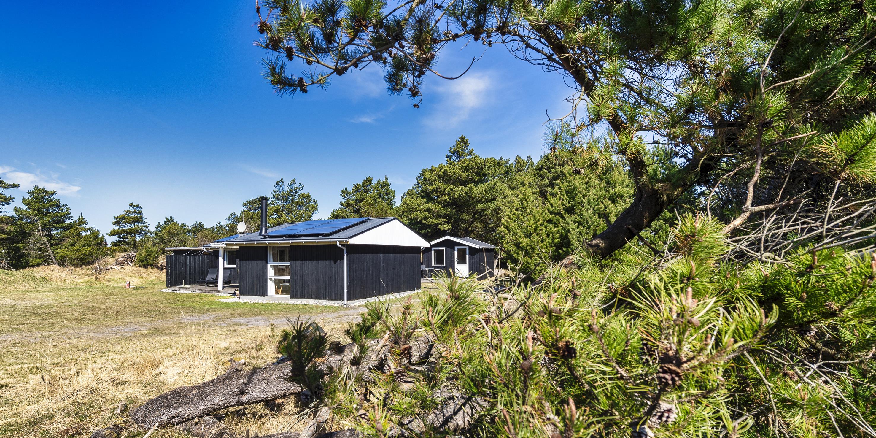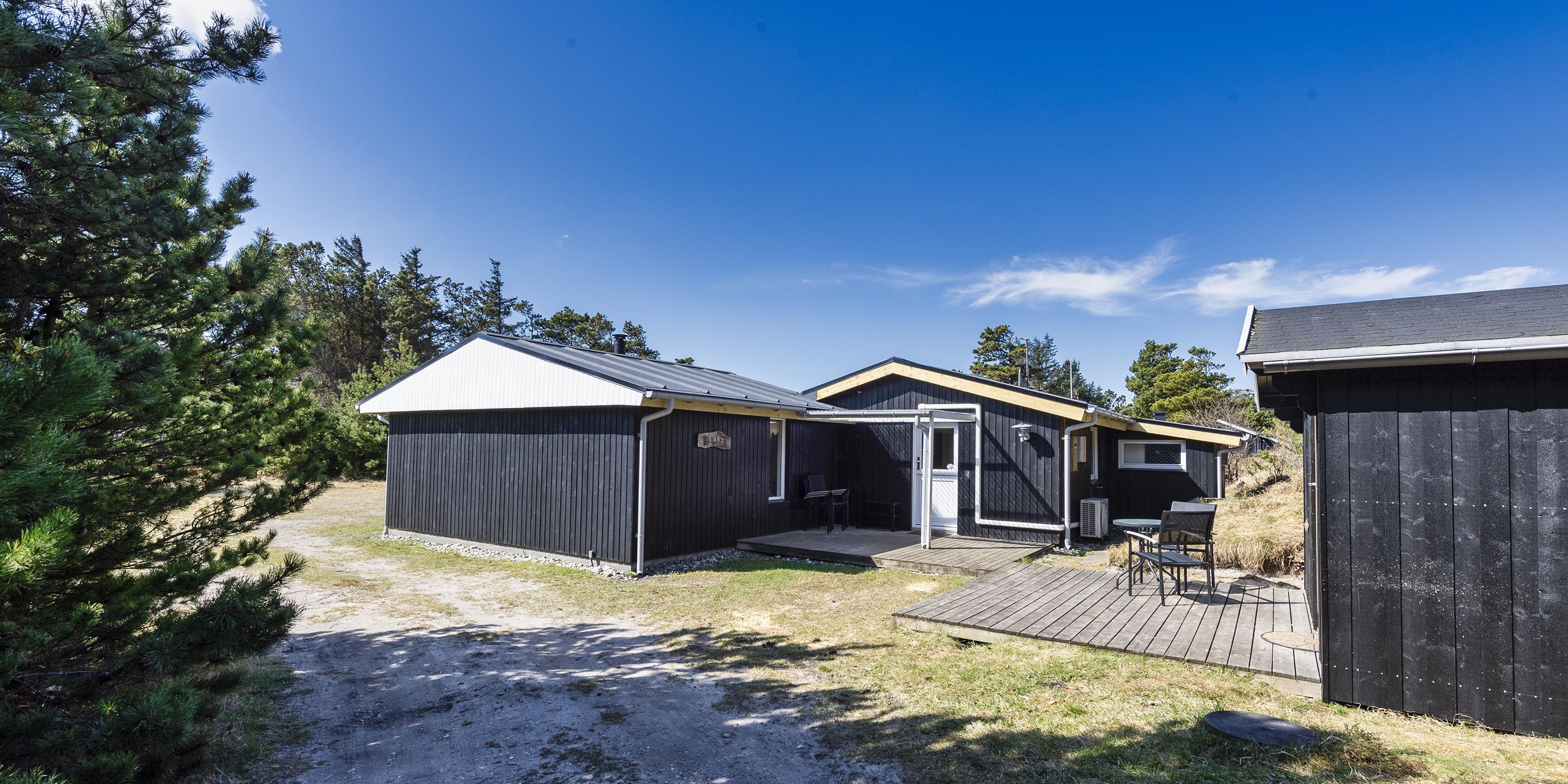 Nydeligt sommerhus til 5 personer, beliggende på en stor naturgrund på rolig sidevej, ca. 800 meter fra stranden. Huset indeholder: Indgang til huset er direkte indtil køkken-alrum. Køkken-alrummet er indrettet i en vinkel med et langt køkkenarbejdsbord med opvaskemaskine, komfur med keramisk kogeplader, emhætte, køleskab med lille fryser fra 2020 og mikroovn. Spiseafdelingen er i åben forbindelse med køkkenet og med kig til haven. Fra spisestuen kommer man ned til opholdsstuen over 1 trin, stuen er indrettet med et sofaområde med fjernsyn med DR-programmer, parabol, soundbar, chromecast og brændeovn. Endvidere har soundbaren også bluetooth, så man kan spille radio og musik fra en mobiltelefon. Trådløs Internetadgang. Endvidere er stuen indrettet med et rund spisebord der indbyder til spil og leg. Fra køkkenet er der en fordelingsgang hvorfra der er indgang til 3 soveværelser: DS + DS + S + 2S. 1 soveværelse med en 3/4 seng (120 x 200) og et klædeskab. 1 mastersoveværelse med 1 nyere dobbeltseng og et klædeskab, fra mastersoveværelset er der indgang til endnu 1 soveværelse med 1 enkeltseng og et klædeskab. Gæsthus med 2 ekstra sende til rådighed. Badeværelset fremstår med bruseniche, wc, vaskearrangement og vaskemaskine. Badeværelset har skrå loft (max loft højde fra 195 cm og ned til 165 cm). Varmpepumpe. Der er kun tilladt én lille hund. Rygning som kat er ikke tilladt! Ekstra udgift for vandforbrug! Stor træterrasse mod syd samt en delvis overdækket træterrasse på østsiden af huset. Til huset høre et gæstehus på 10 kvm, med 1 enkeltseng samt en sovebriks, der kan benyttes til overnattende gæster, der er endvidere rig mulighed for opbevaring i gæstehuset. Den naturskønne grund på 2440 m2, indbyder til boldspil og er omkranset af fyrtræer. Byggeår 1959, Tilbygget i 1978 og herefter løbende vedligeholdt.