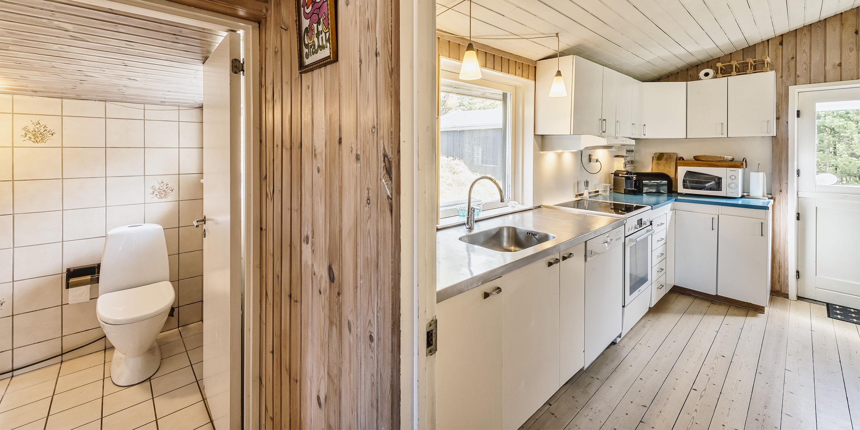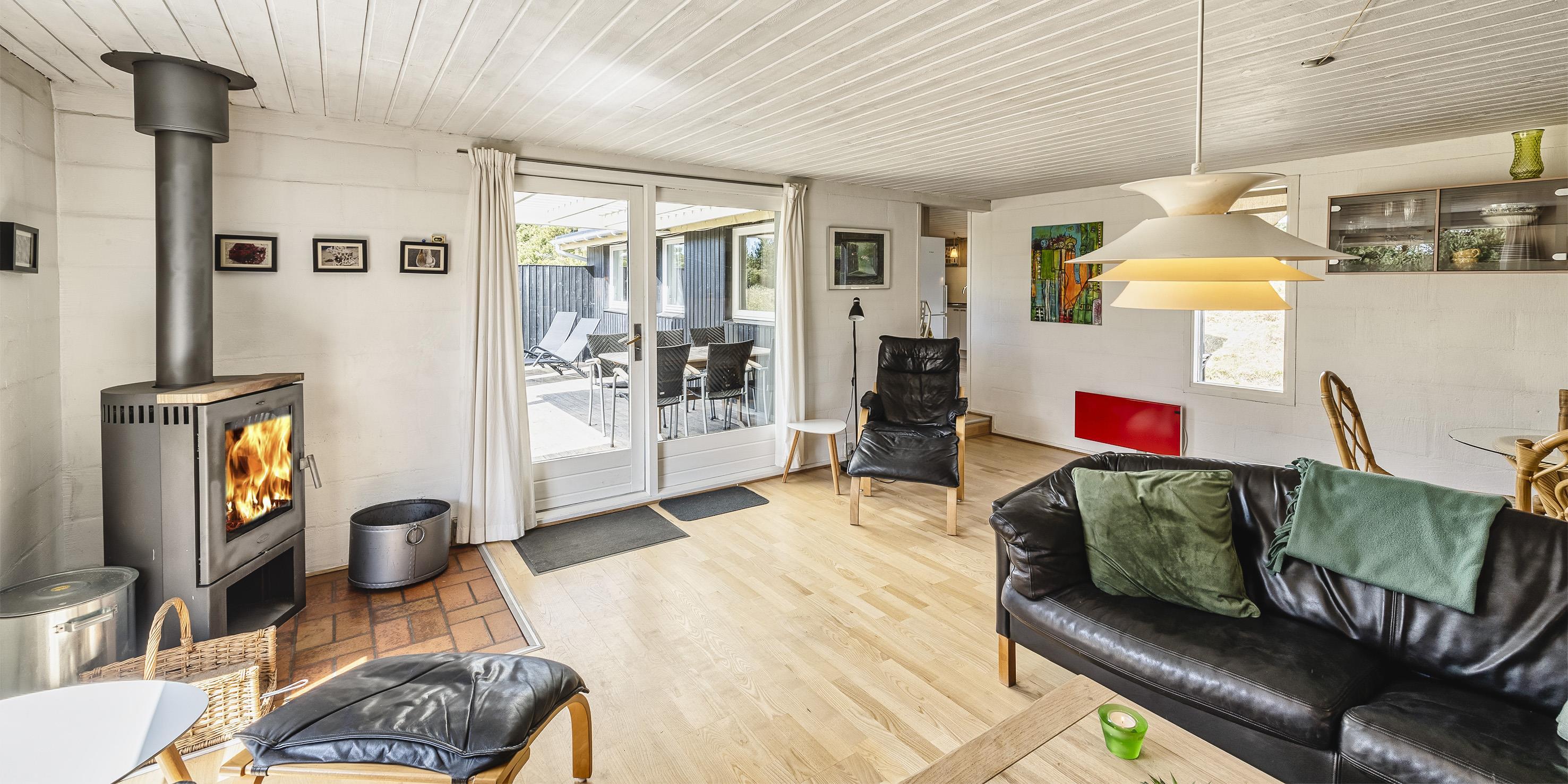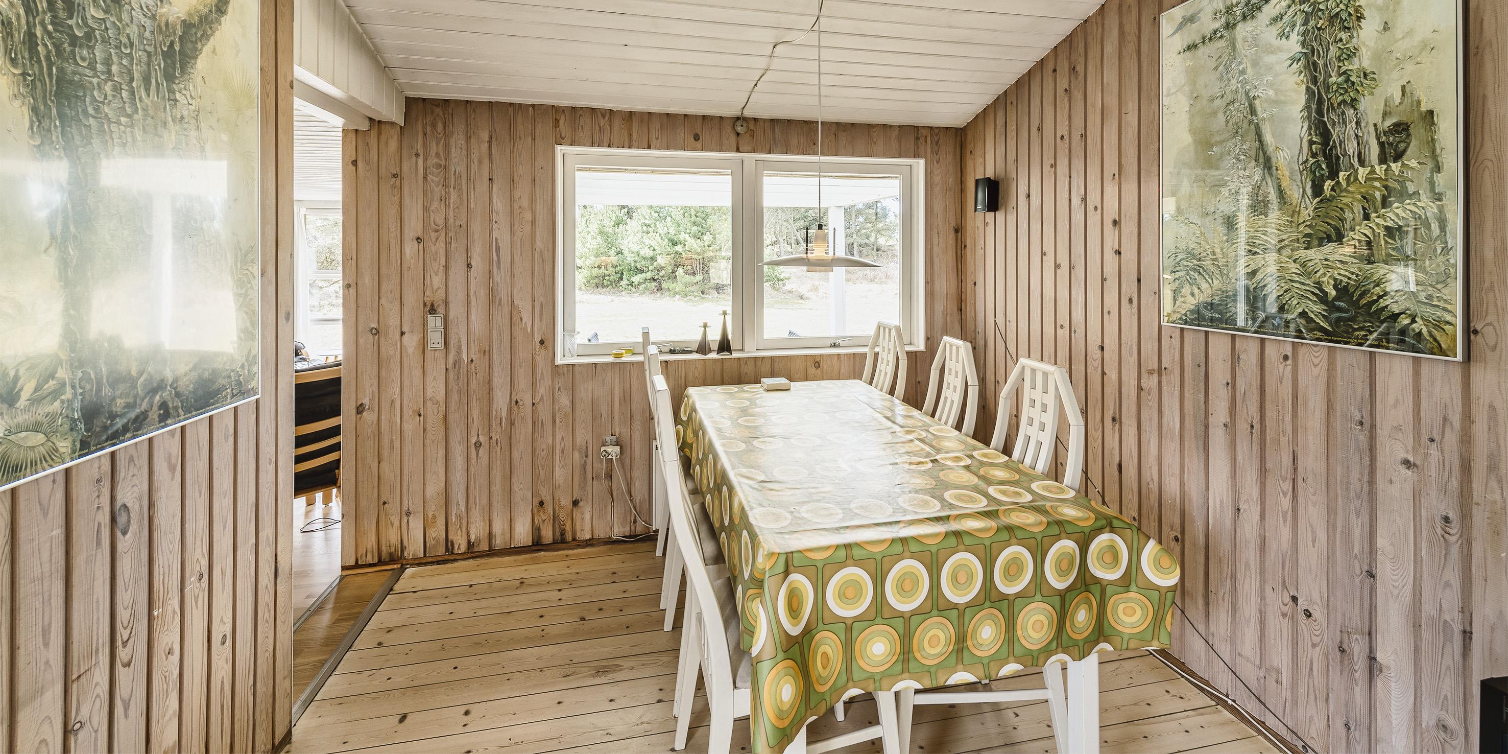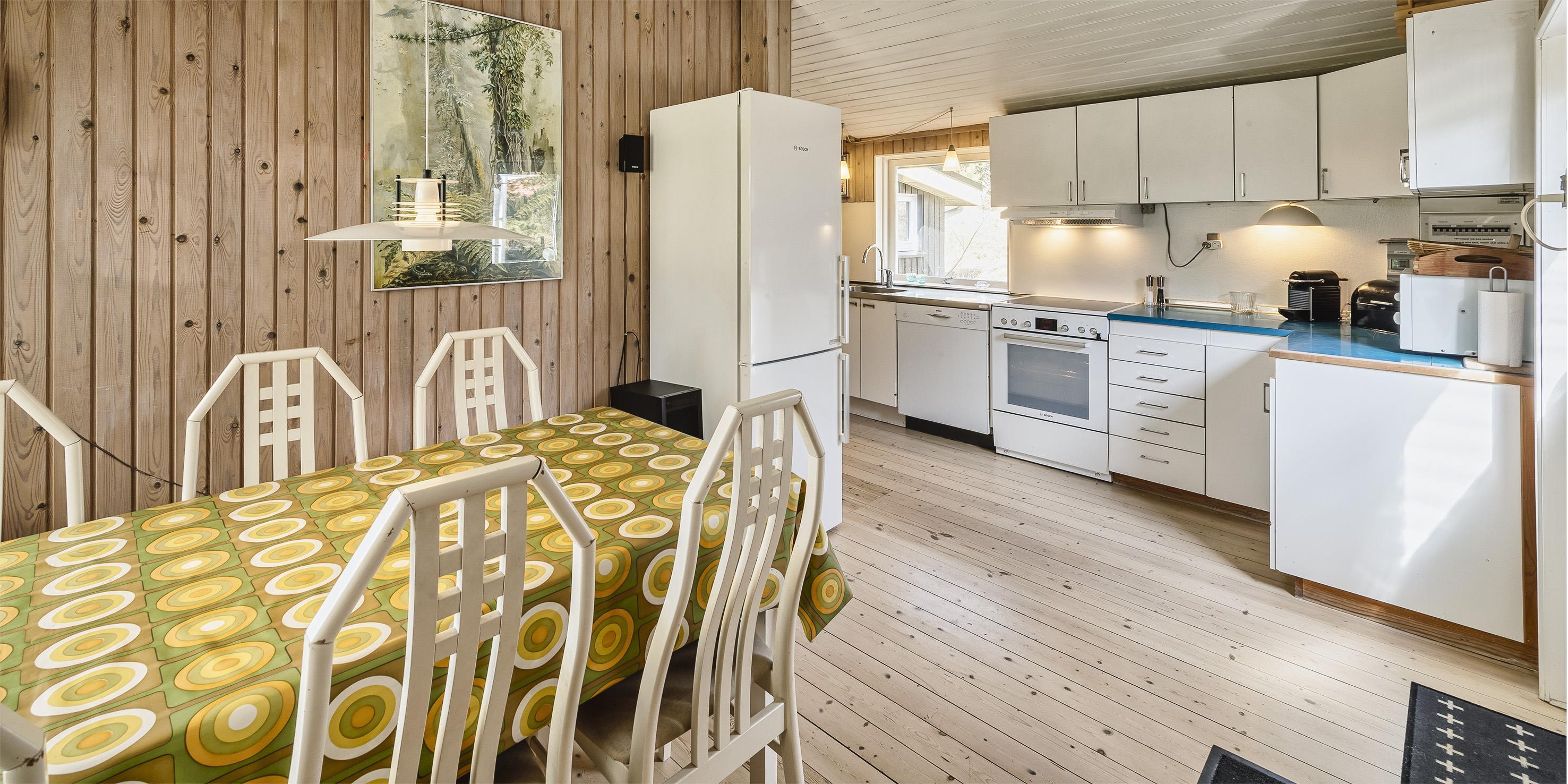 Nydeligt sommerhus til 5 personer, beliggende på en stor naturgrund på rolig sidevej, ca. 800 meter fra stranden. Huset indeholder: Indgang til huset er direkte indtil køkken-alrum. Køkken-alrummet er indrettet i en vinkel med et langt køkkenarbejdsbord med opvaskemaskine, komfur med keramisk kogeplader, emhætte, køleskab med lille fryser fra 2020 og mikroovn. Spiseafdelingen er i åben forbindelse med køkkenet og med kig til haven. Fra spisestuen kommer man ned til opholdsstuen over 1 trin, stuen er indrettet med et sofaområde med fjernsyn med DR-programmer, parabol, soundbar, chromecast og brændeovn. Endvidere har soundbaren også bluetooth, så man kan spille radio og musik fra en mobiltelefon. Trådløs Internetadgang. Endvidere er stuen indrettet med et rund spisebord der indbyder til spil og leg. Fra køkkenet er der en fordelingsgang hvorfra der er indgang til 3 soveværelser: DS + DS + S + 2S. 1 soveværelse med en 3/4 seng (120 x 200) og et klædeskab. 1 mastersoveværelse med 1 nyere dobbeltseng og et klædeskab, fra mastersoveværelset er der indgang til endnu 1 soveværelse med 1 enkeltseng og et klædeskab. Gæsthus med 2 ekstra sende til rådighed. Badeværelset fremstår med bruseniche, wc, vaskearrangement og vaskemaskine. Badeværelset har skrå loft (max loft højde fra 195 cm og ned til 165 cm). Varmpepumpe. Der er kun tilladt én lille hund. Rygning som kat er ikke tilladt! Ekstra udgift for vandforbrug! Stor træterrasse mod syd samt en delvis overdækket træterrasse på østsiden af huset. Til huset høre et gæstehus på 10 kvm, med 1 enkeltseng samt en sovebriks, der kan benyttes til overnattende gæster, der er endvidere rig mulighed for opbevaring i gæstehuset. Den naturskønne grund på 2440 m2, indbyder til boldspil og er omkranset af fyrtræer. Byggeår 1959, Tilbygget i 1978 og herefter løbende vedligeholdt.