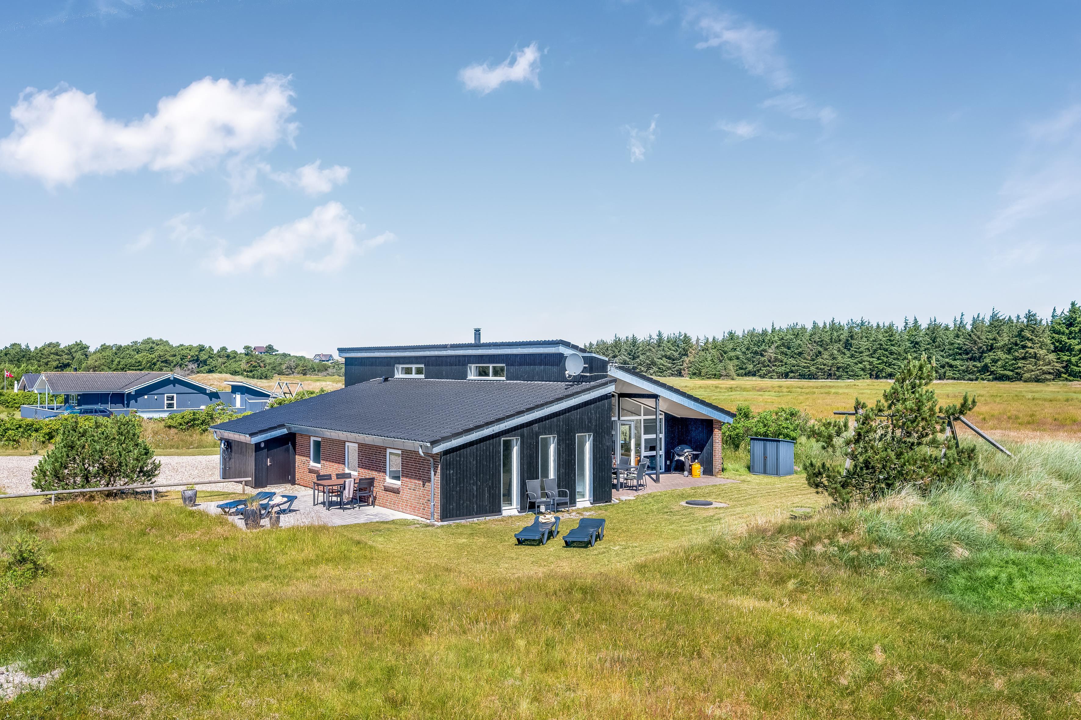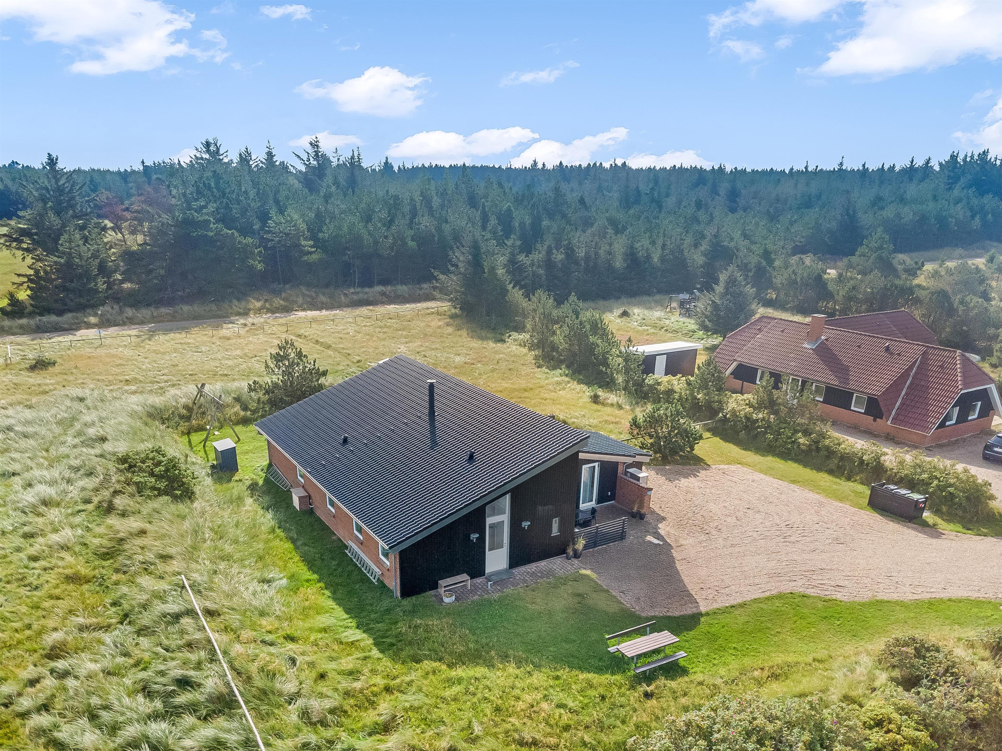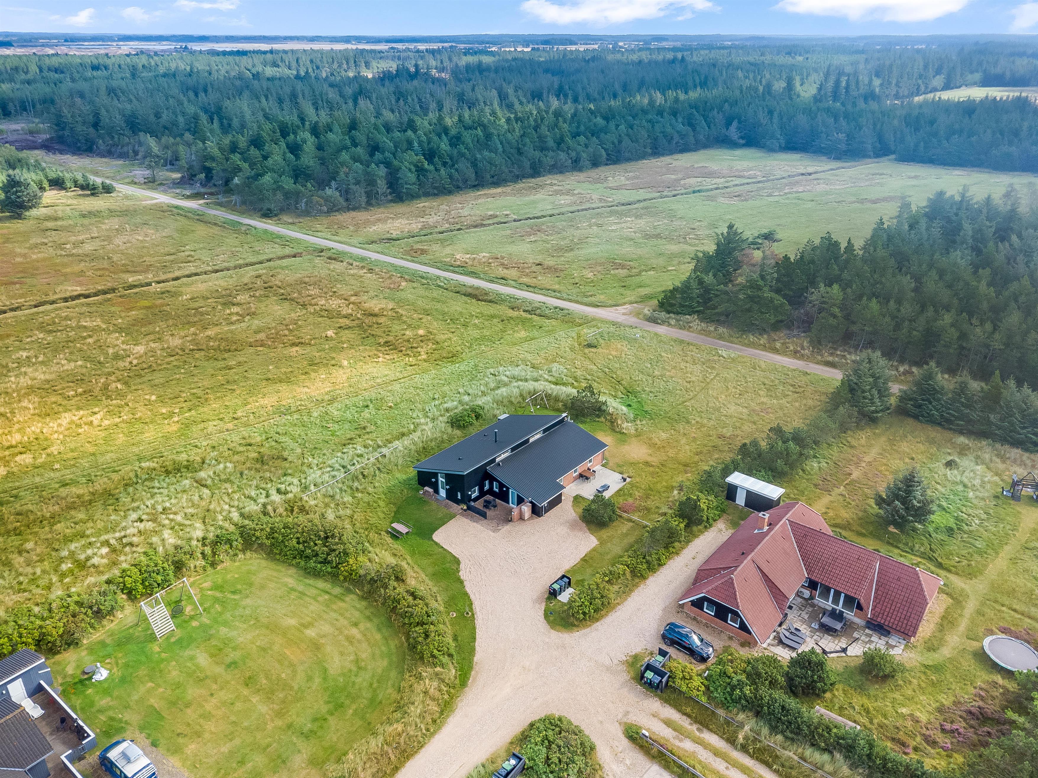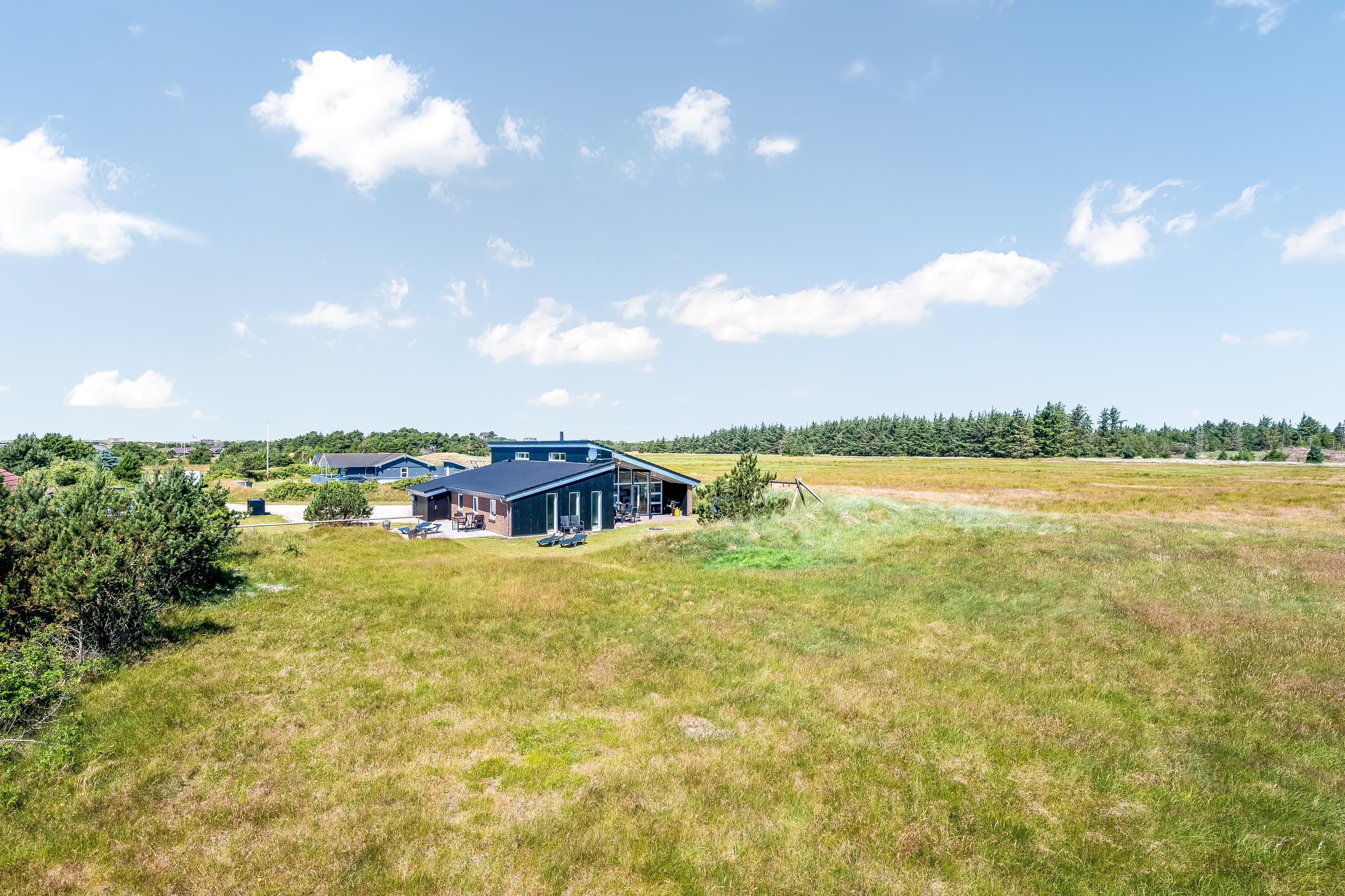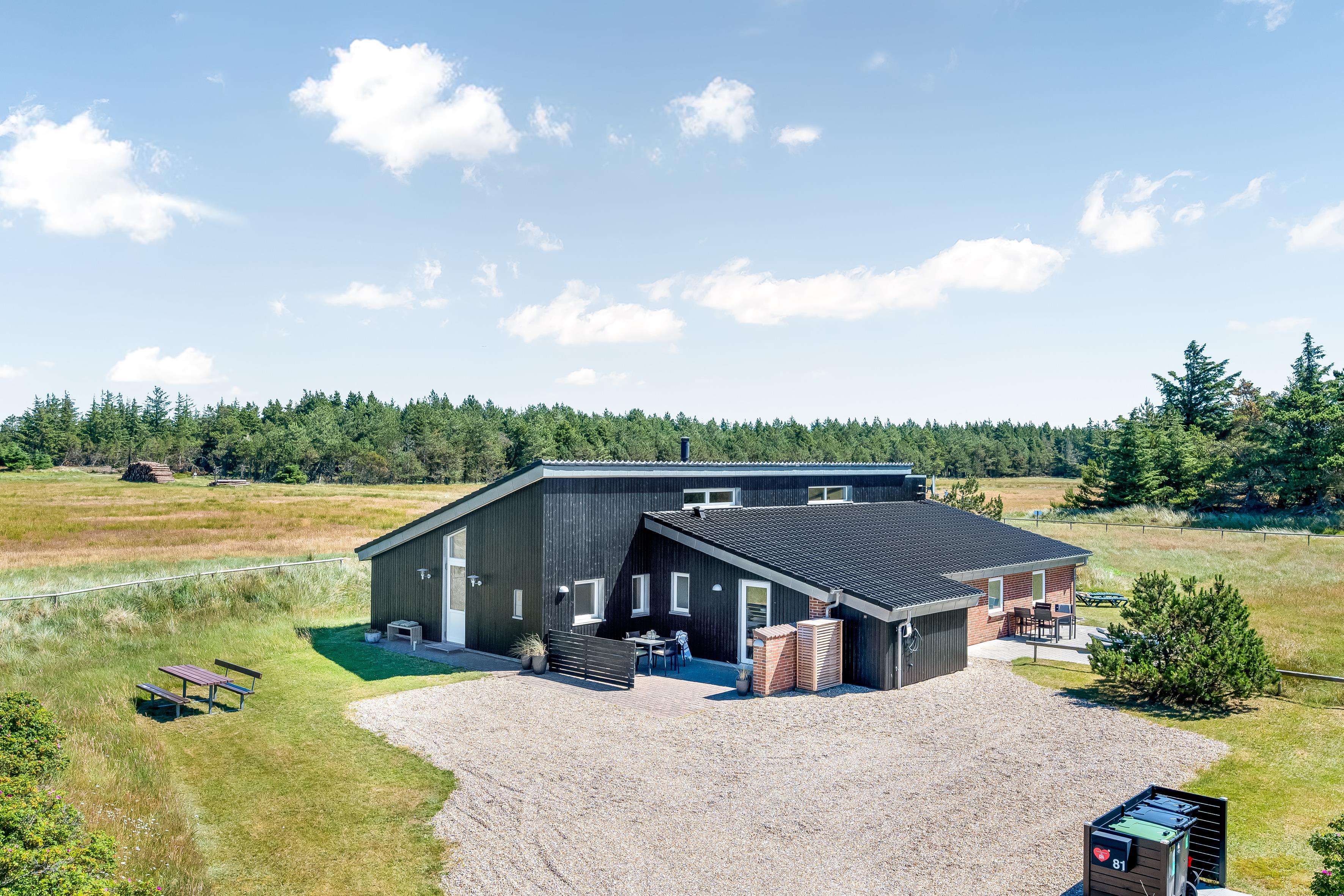 Lyst renoveret poolhus til 10 personer, beliggende i en lomme på en blind vej. Sommerhuset er placeret på en 2310 m2 stor naturgrund med ca. 1200 meter fra stranden. Grunden er op grænsende til skoven og cykelsti mod Filsø og Henne Strand. Bagved huset er der en stor græsmark hvor kronvildtet ofte græsser.
