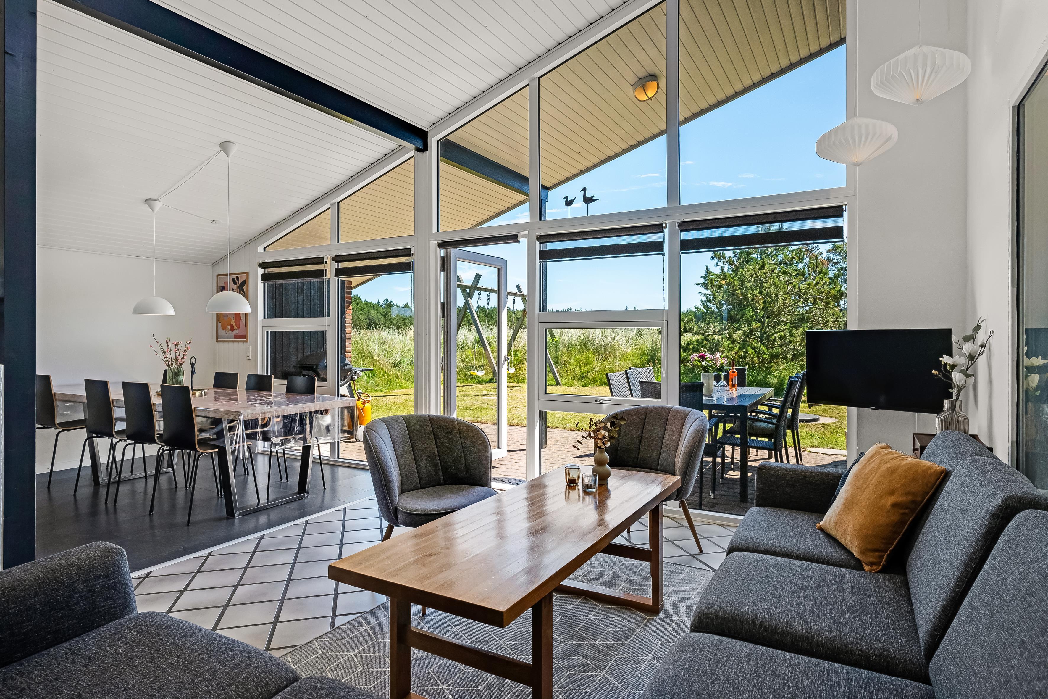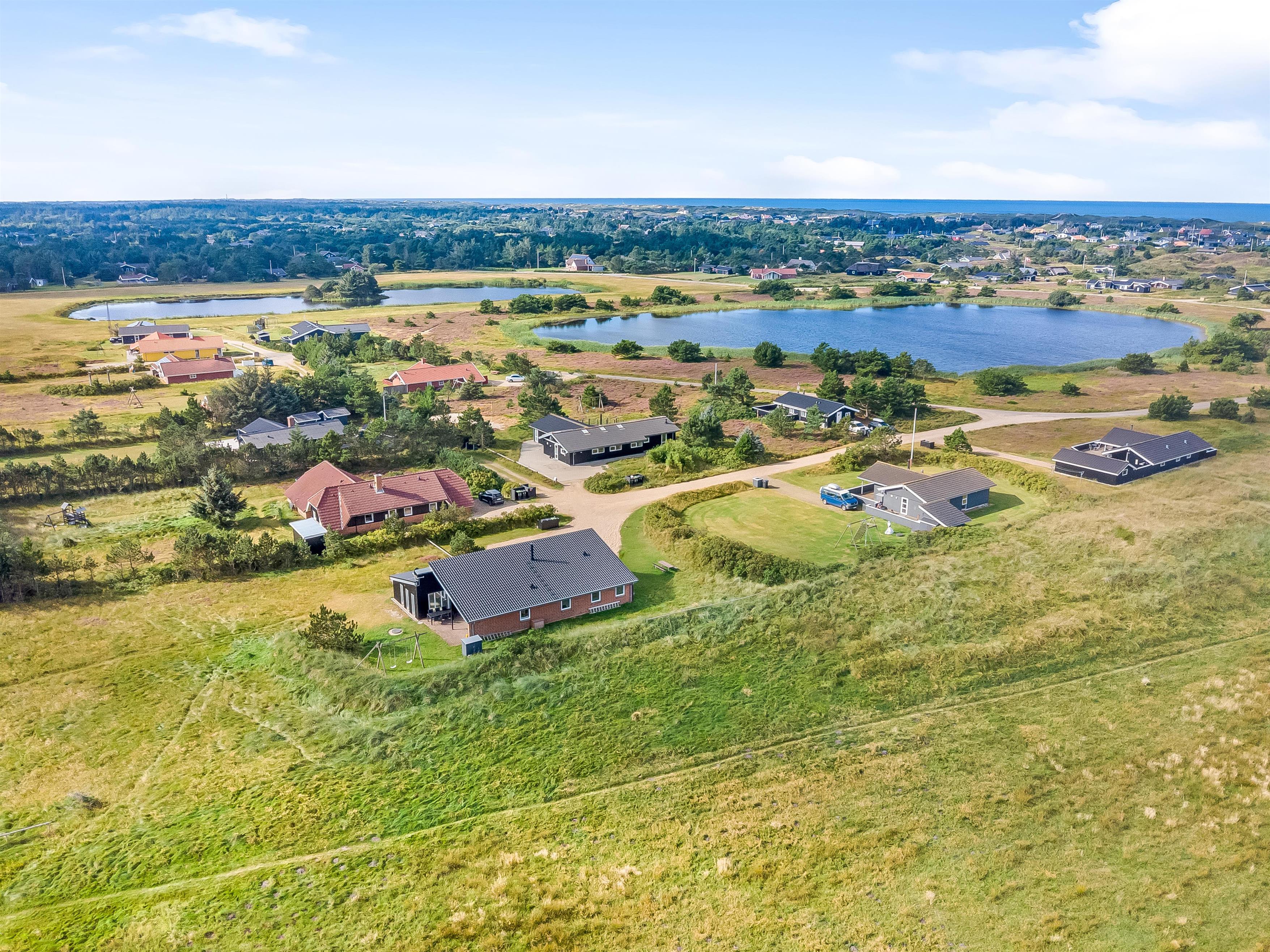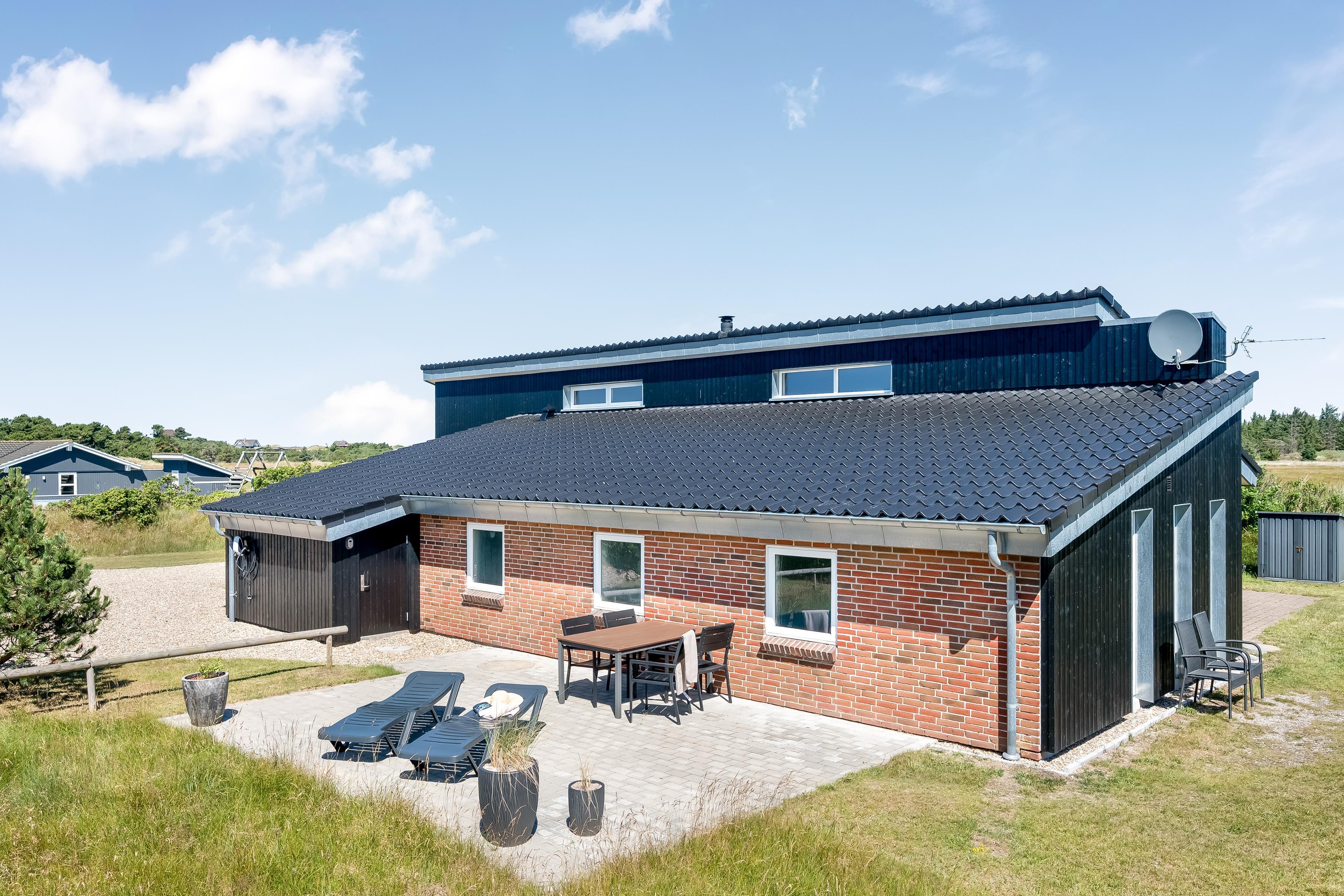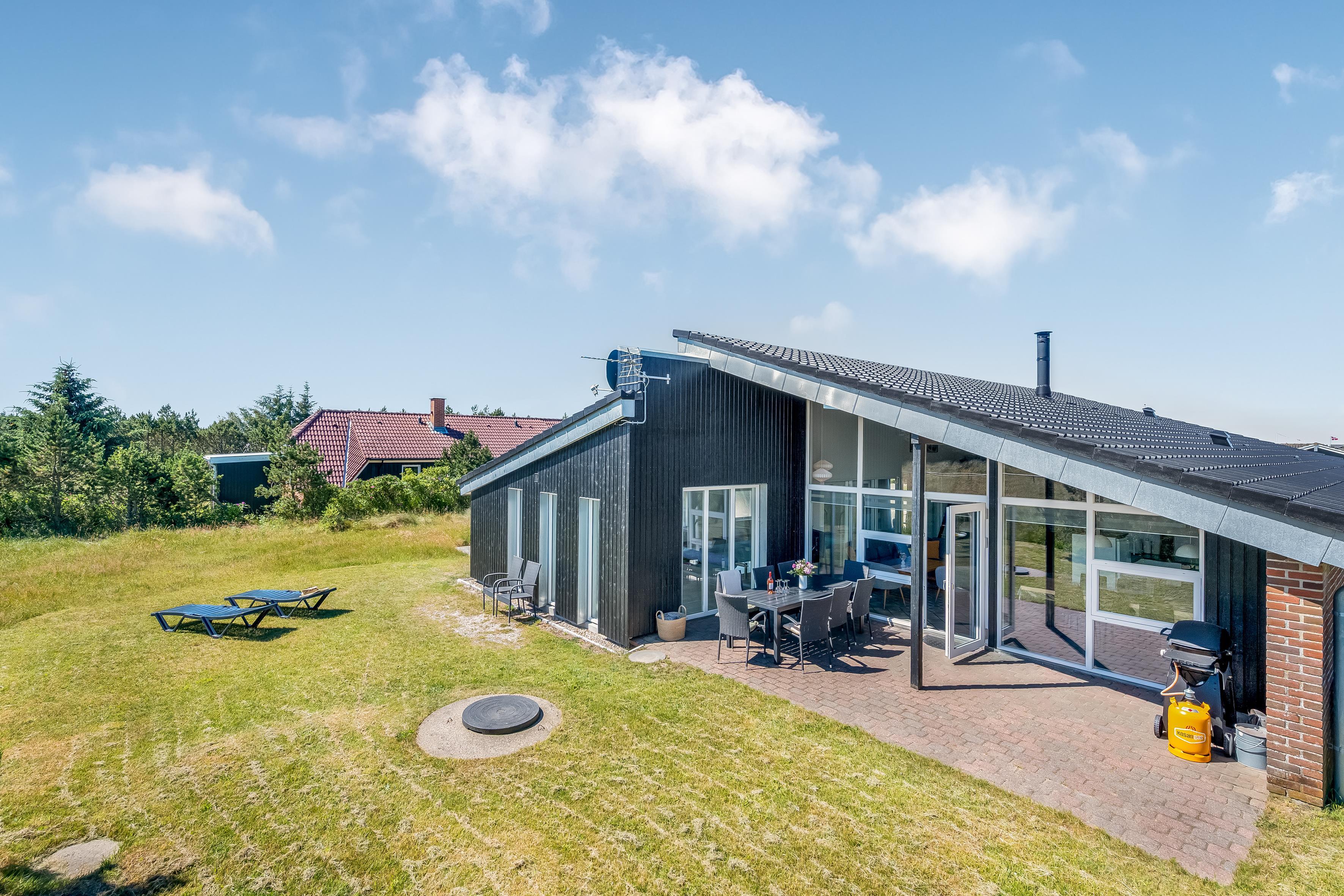 Lyst renoveret poolhus til 10 personer, beliggende i en lomme på en blind vej. Sommerhuset er placeret på en 2310 m2 stor naturgrund med ca. 1200 meter fra stranden. Grunden er op grænsende til skoven og cykelsti mod Filsø og Henne Strand. Bagved huset er der en stor græsmark hvor kronvildtet ofte græsser.