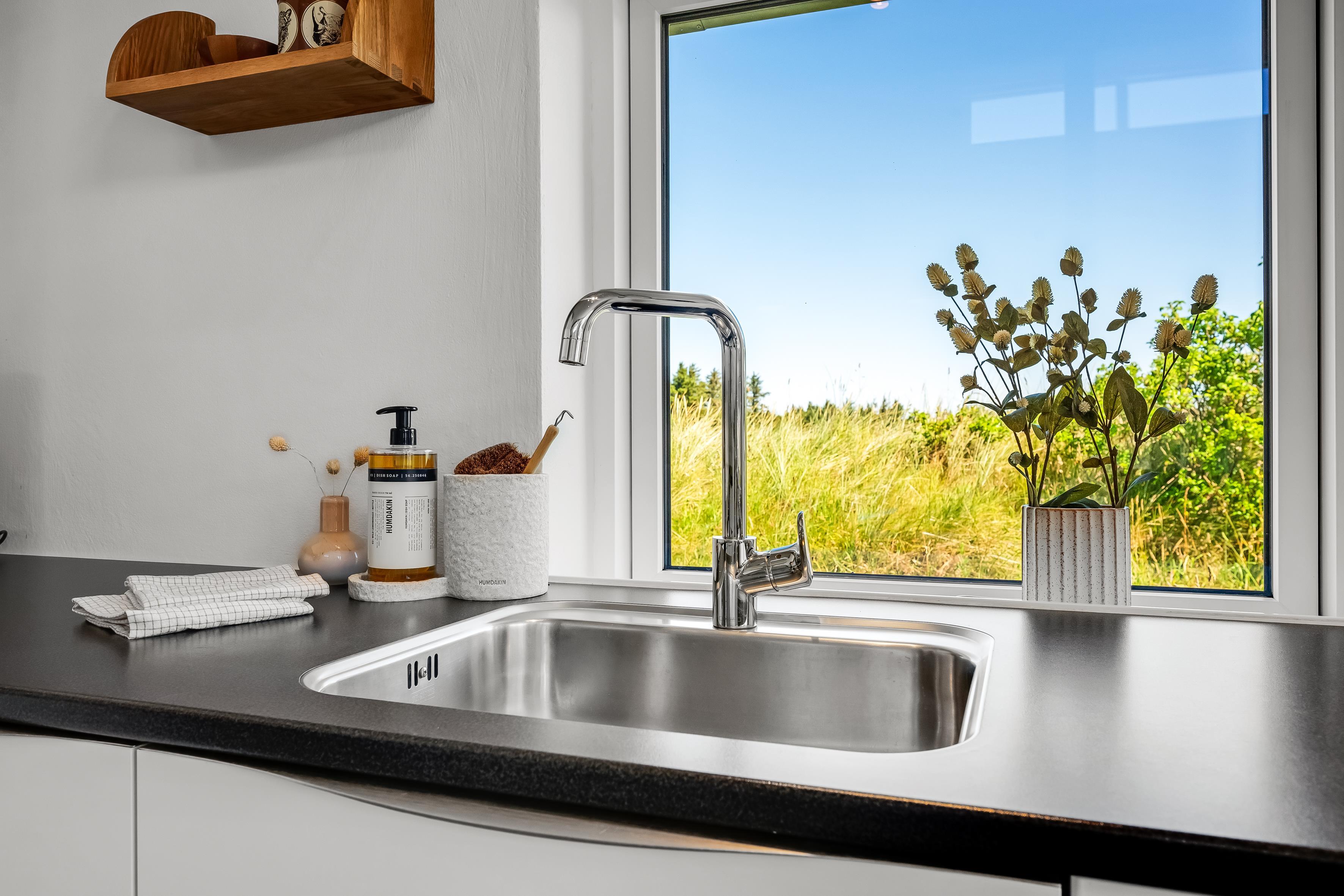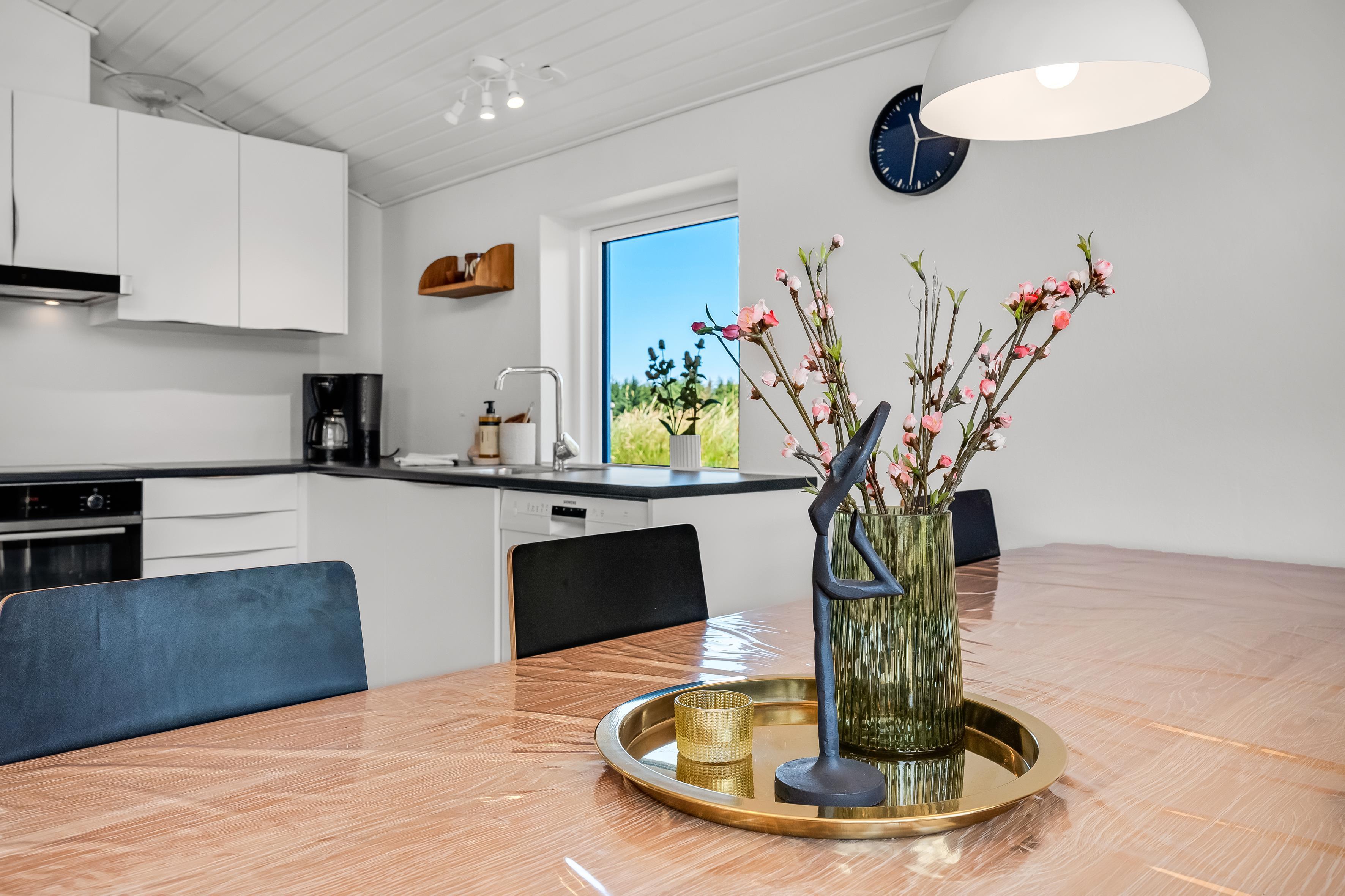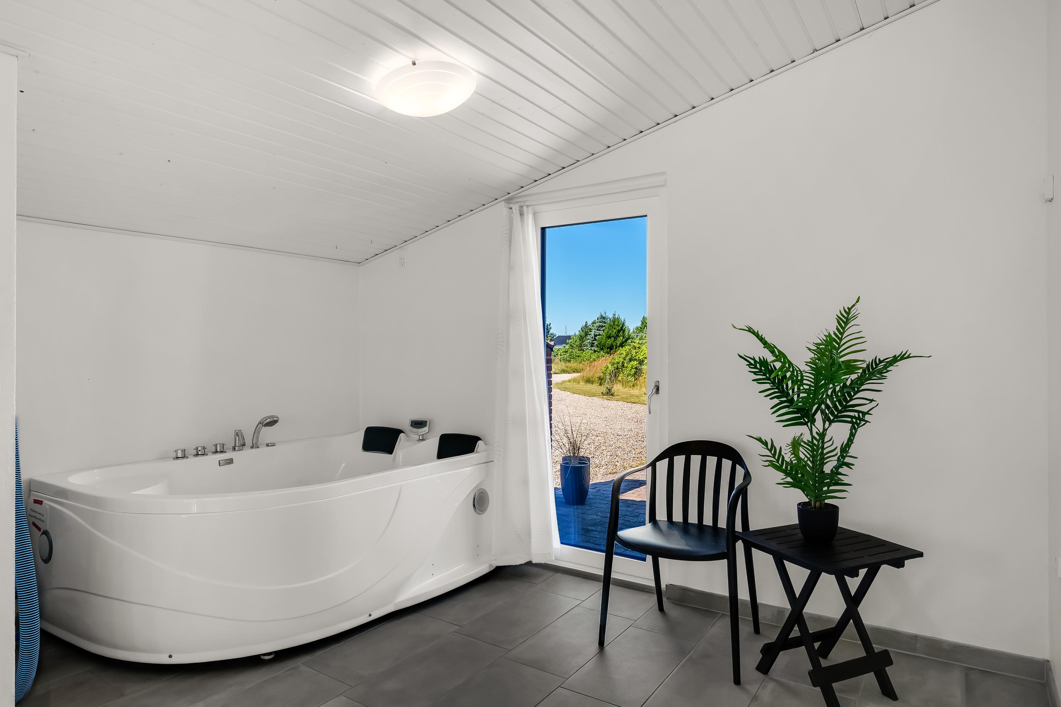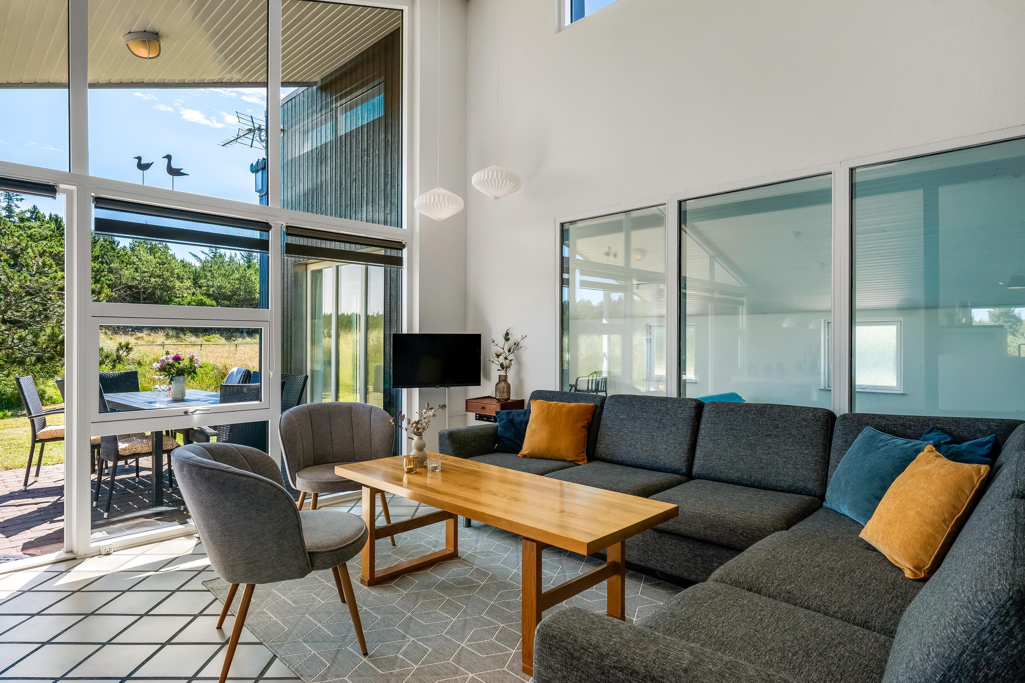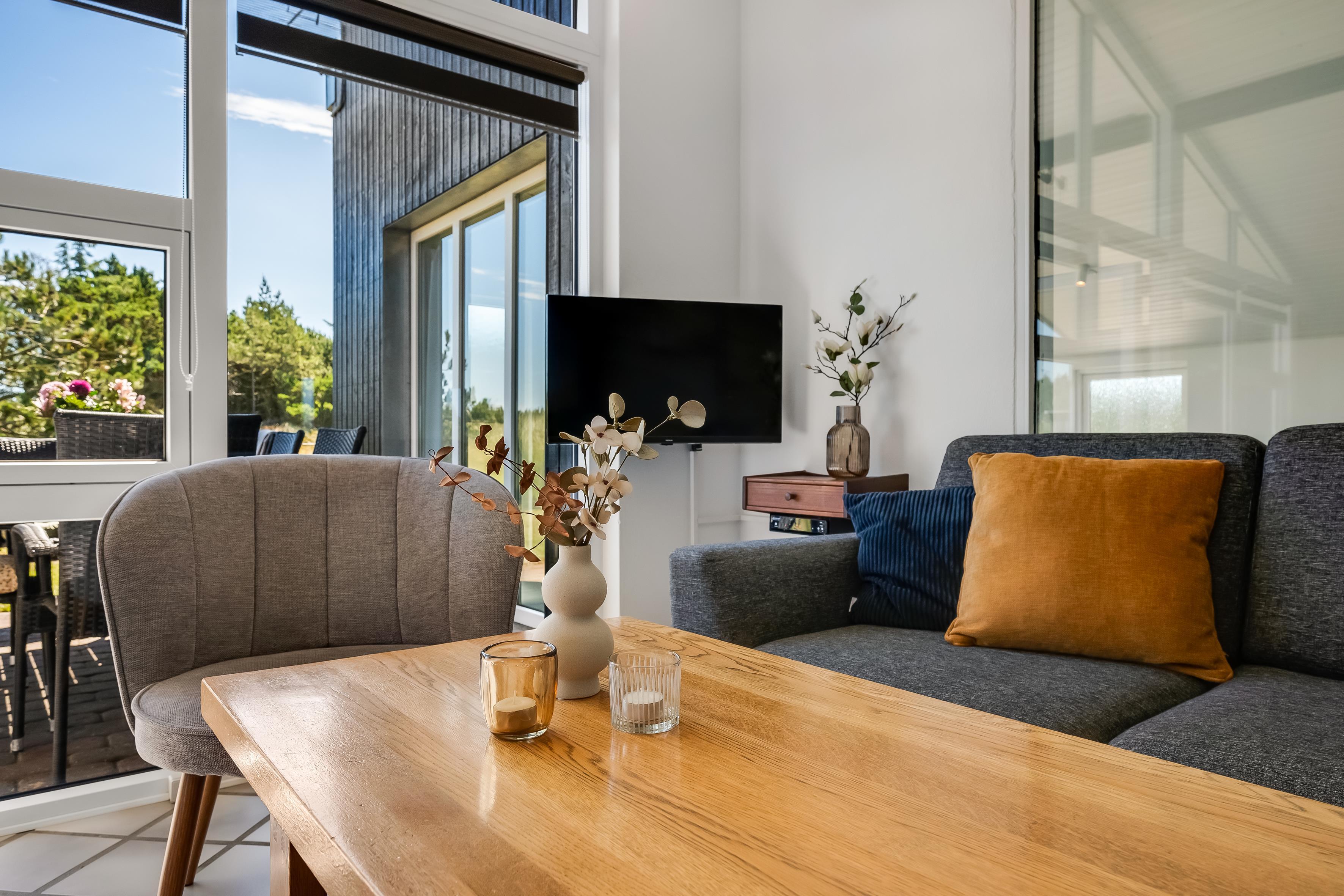 Lyst renoveret poolhus til 10 personer, beliggende i en lomme på en blind vej. Sommerhuset er placeret på en 2310 m2 stor naturgrund med ca. 1200 meter fra stranden. Grunden er op grænsende til skoven og cykelsti mod Filsø og Henne Strand. Bagved huset er der en stor græsmark hvor kronvildtet ofte græsser.