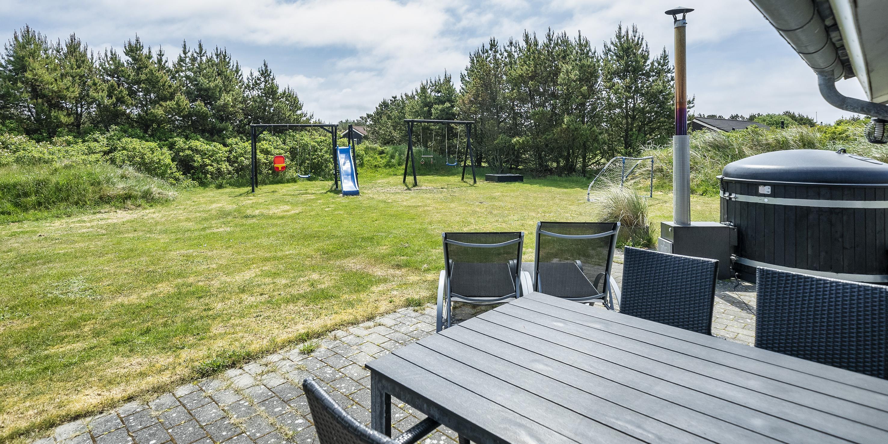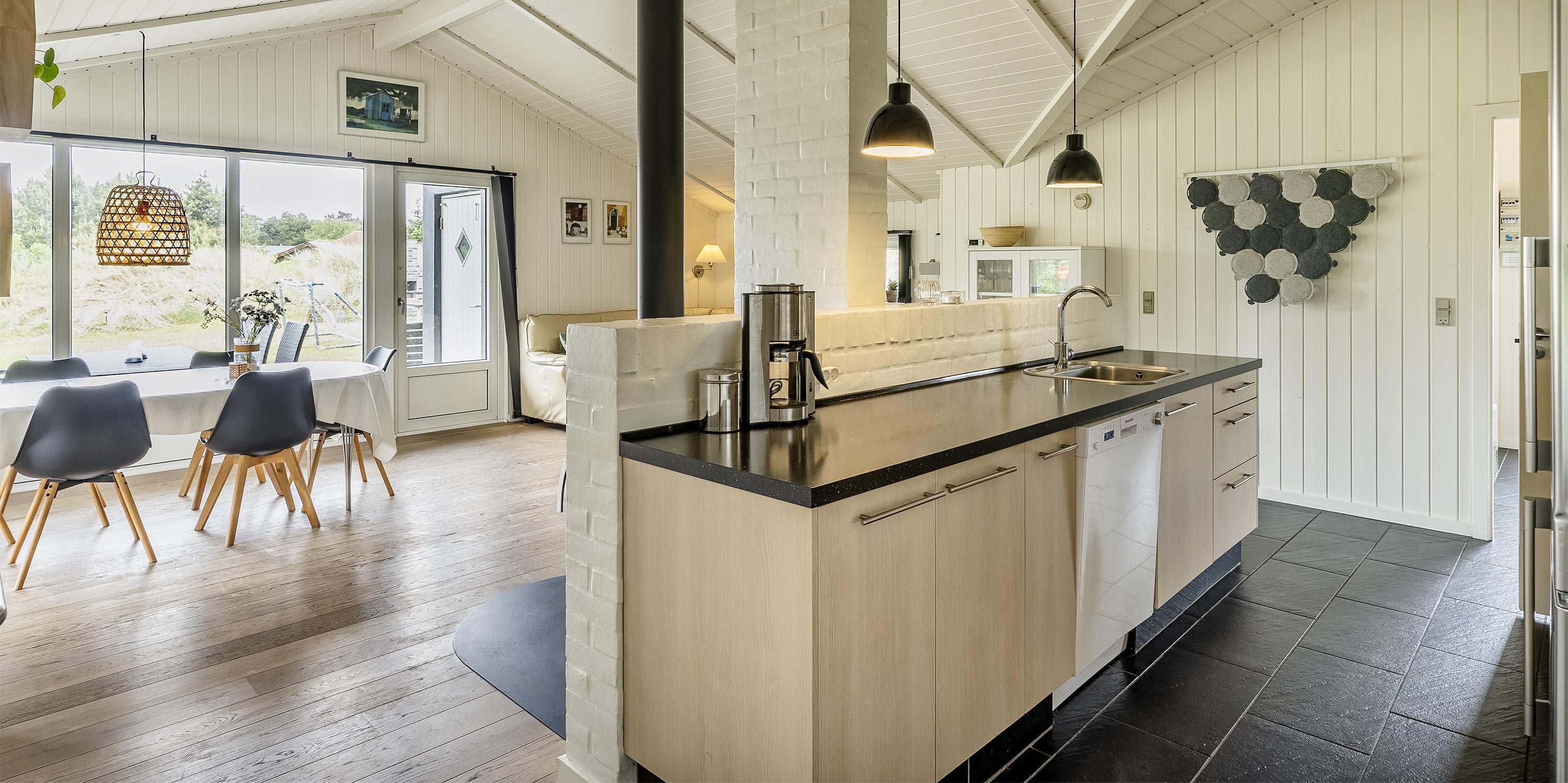 Sommerhuset: Entre med plads til garderoben. Huset råder over 2 dejlige badeværelser med gulvvarme. Det ene badeværelse med sauna og spa. Stort køkkenalrum og stue ud i et samt god spiseplads. Rummet er lyst og dejligt med gode vinduespartier og udgang til terrassen. Terrassen er delvis overdækket og med vildmarksbad. Køkkenet fremstår med alt komfort såsom opvaskemaskine, mikroovn, kogeplade, emhætte og køle-/frysekombination. Dejlig opholdsstue med brændeovn, DVD-afspiller, fjernsyn, radio og trådløs internetadgang. De danske programmer kan streames via Google Chrome Cast. Huset har i alt 3 soverum: DS + 2S + 2S. 2 soveværelser med hver 2 enkeltsenge og 1 soveværelse med 1 dobbeltseng. Vaskemaskine og tørretumbler befinder sig ved garderoben. Dejlig terrasse-miljø med havemøbler, grill og vildmarksbad. På terrassen kan dagene nydes fra morgen til aften. Carport, hvor bilen kan parkeres.