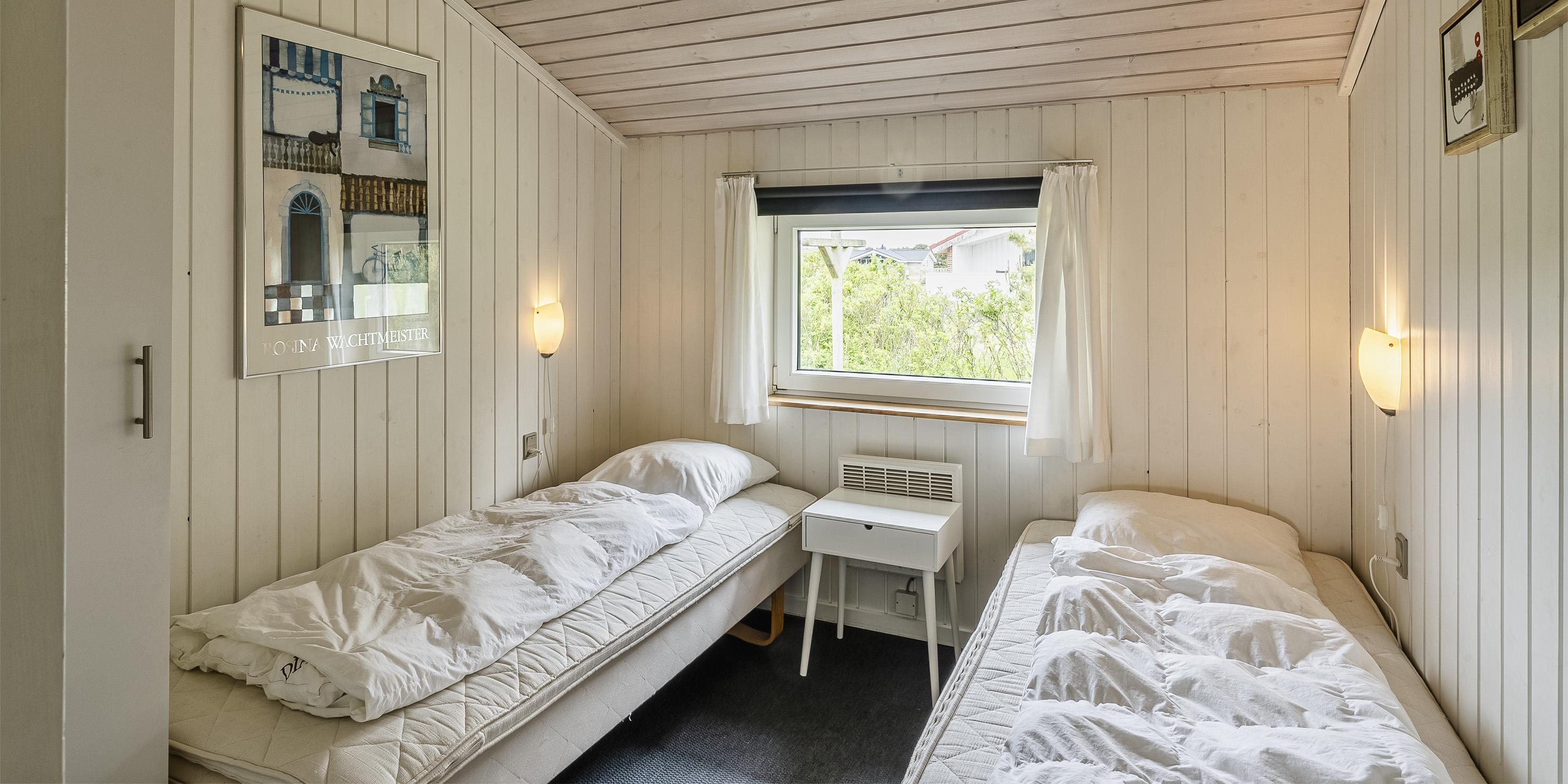 3 soveværelser. 1 med dobbeltseng 180x200 cm. 2 med 2 enkeltsenge (á 90x200 cm)