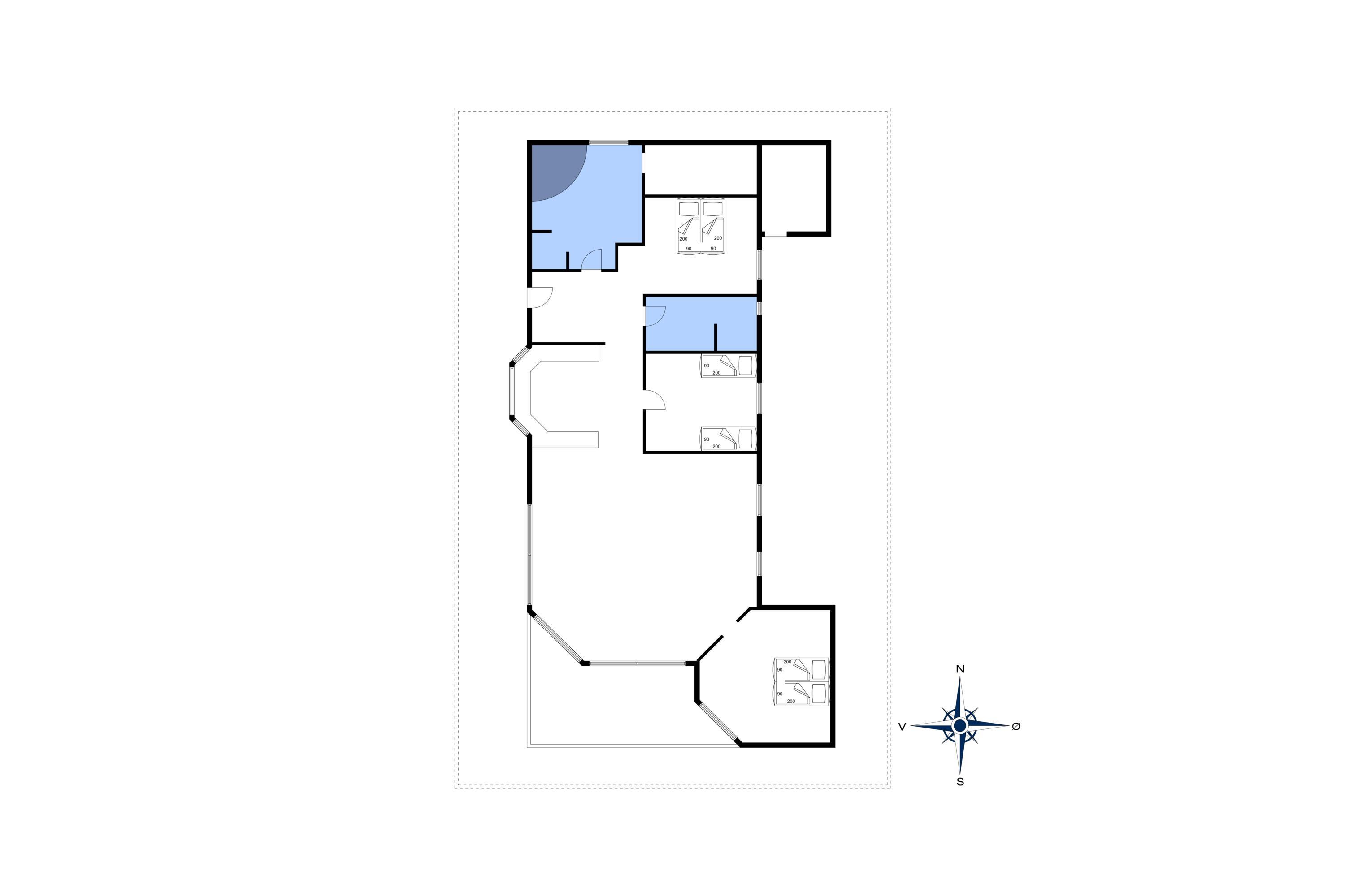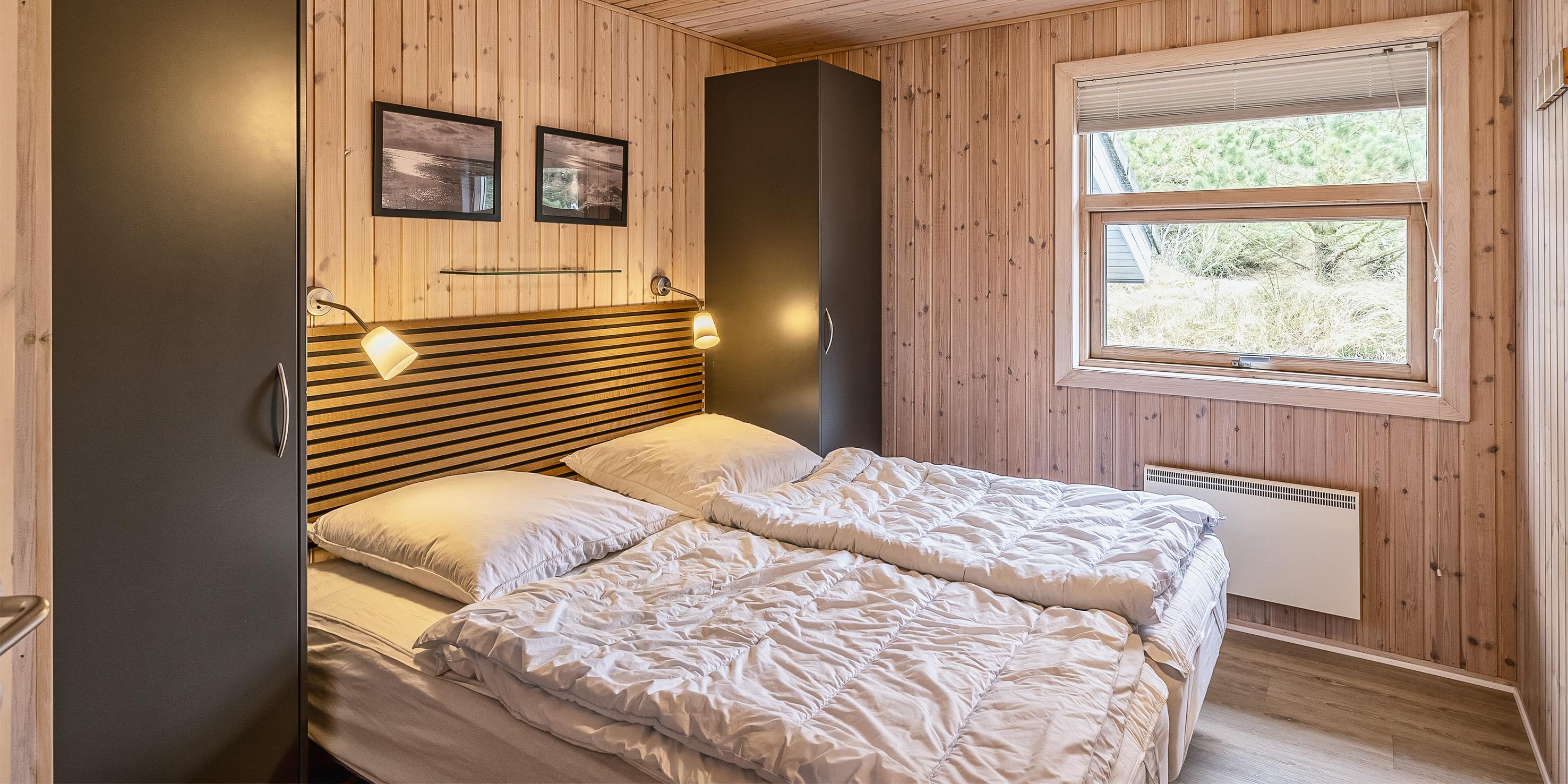 3 soveværelser. 2 med dobbeltseng 180x200 cm. 1 med 2 enkeltsenge (á 90x200 cm)
