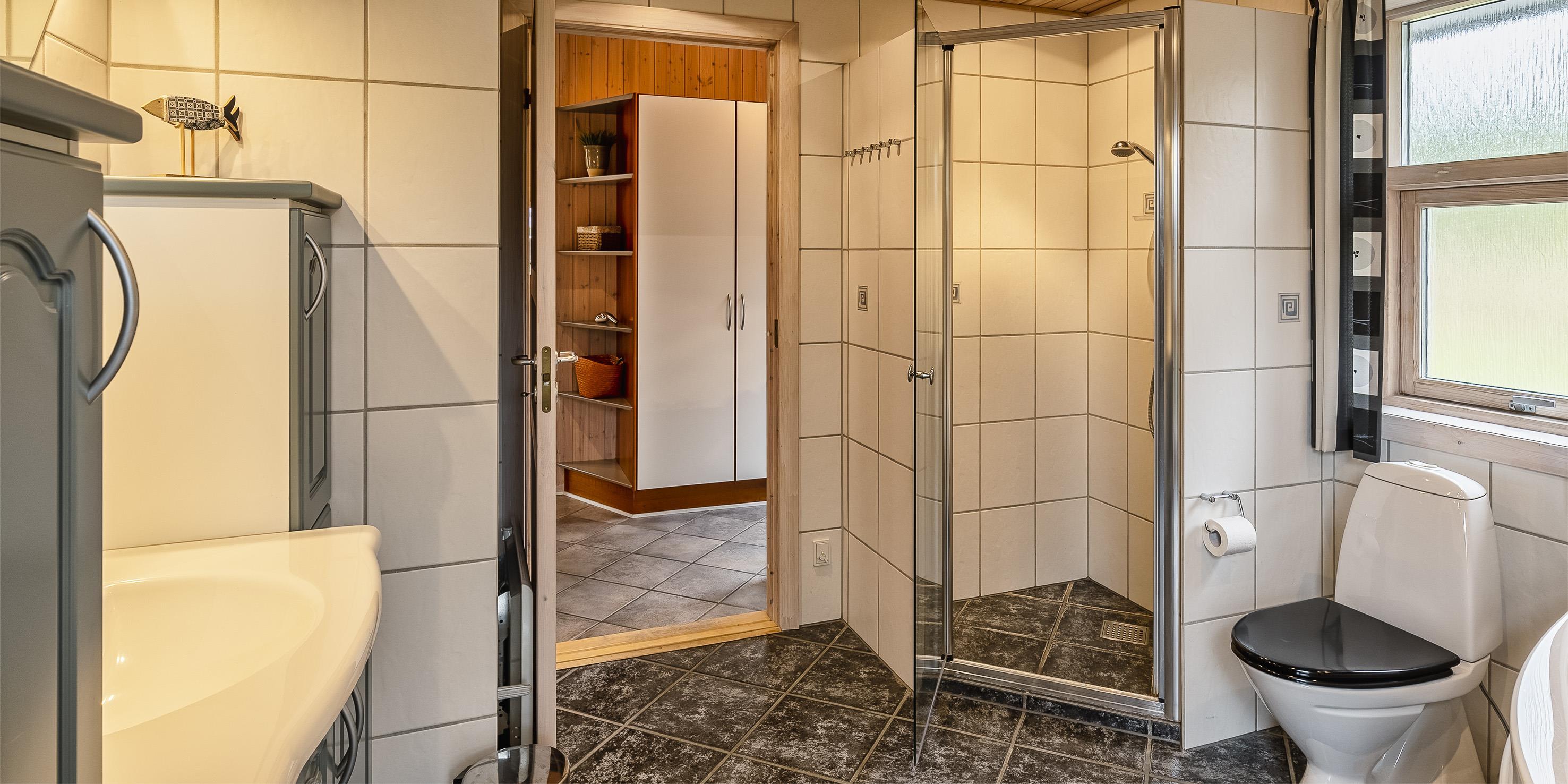 Bad med toilet, bruser og vask