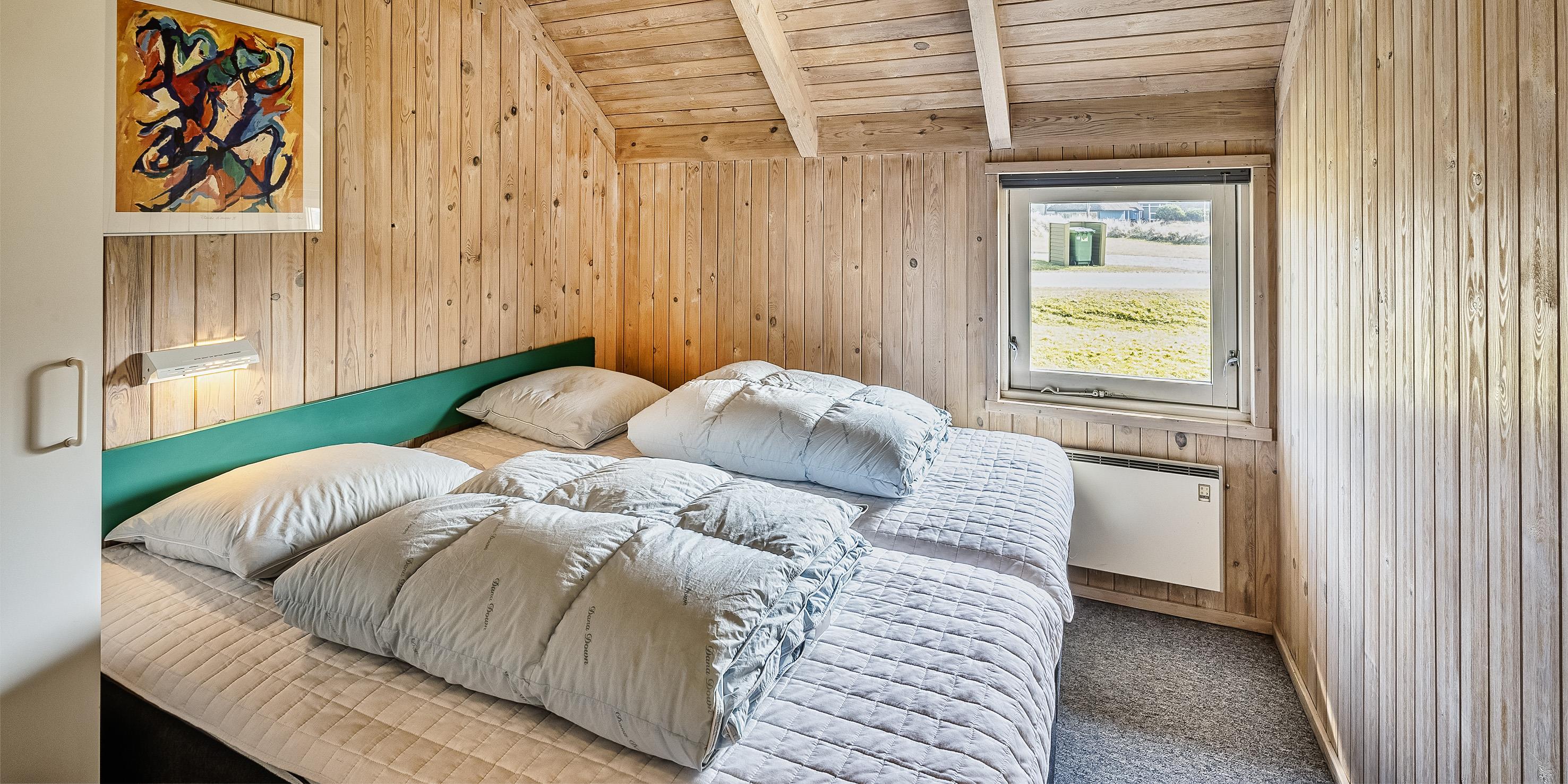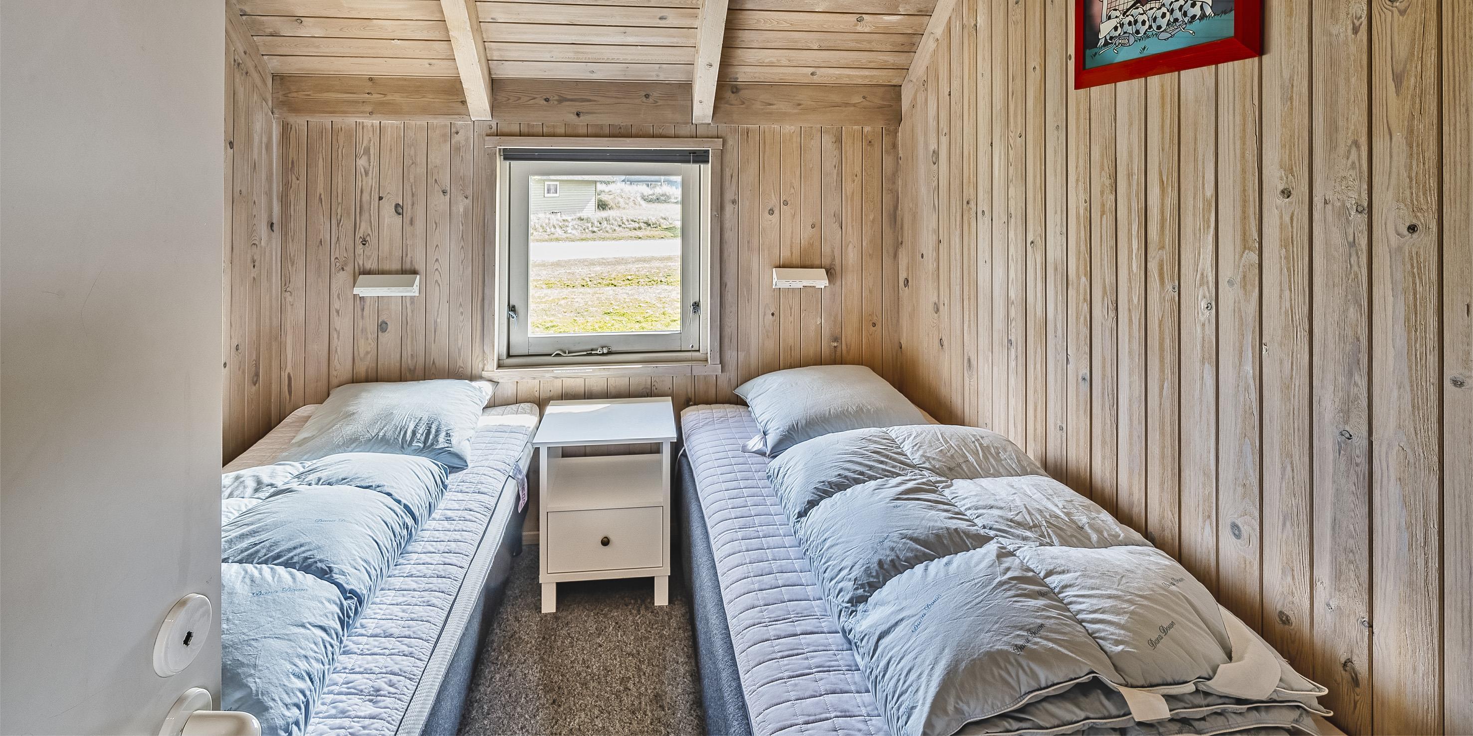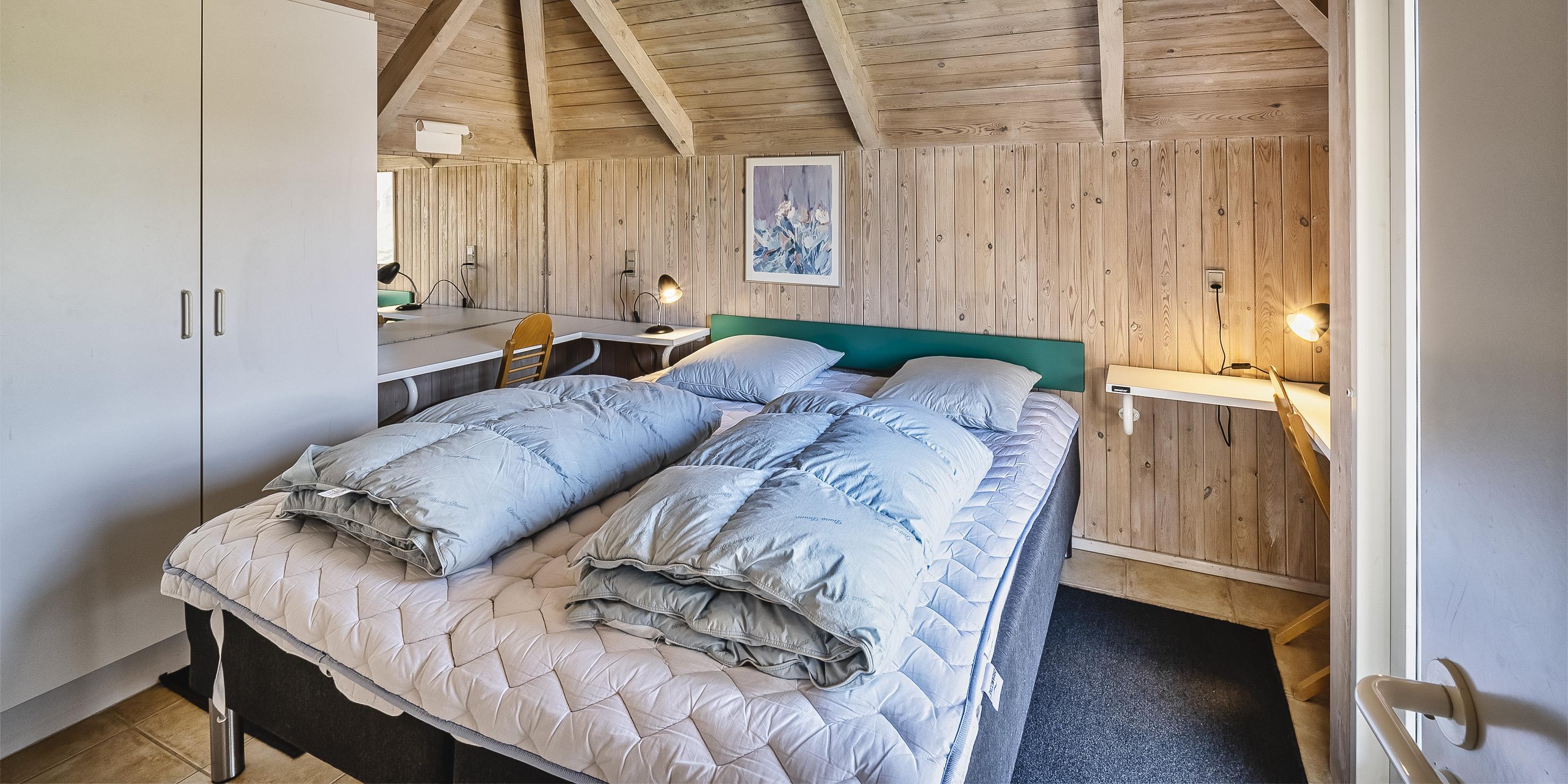 4 soveværelser. 2 med dobbeltseng 180x200 cm. 2 med 2 enkeltsenge (á 90x200 cm)