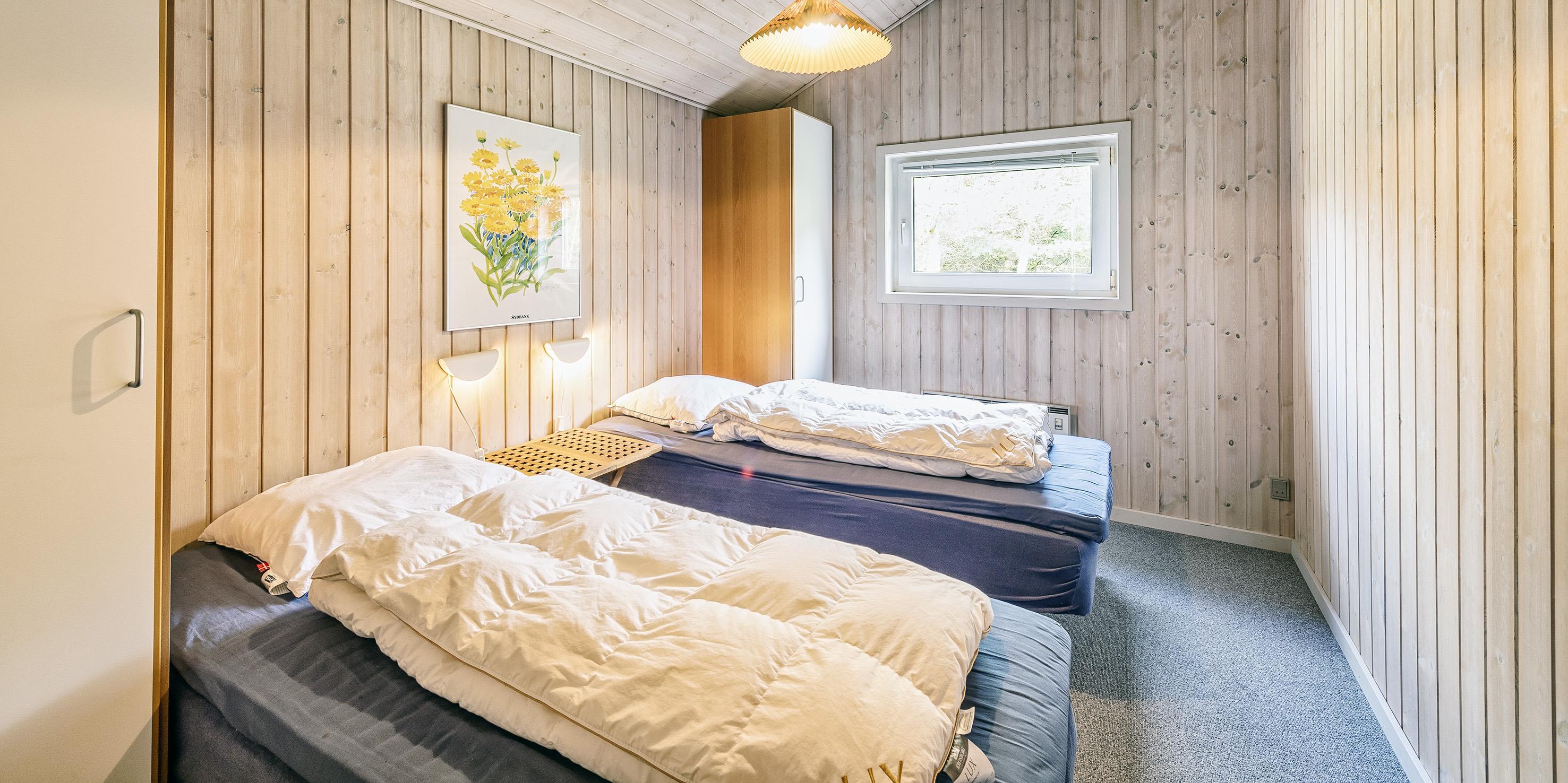 3 soveværelser. 2 med dobbeltseng 180x200 cm. 1 med 2 enkeltsenge (á 90x200 cm)