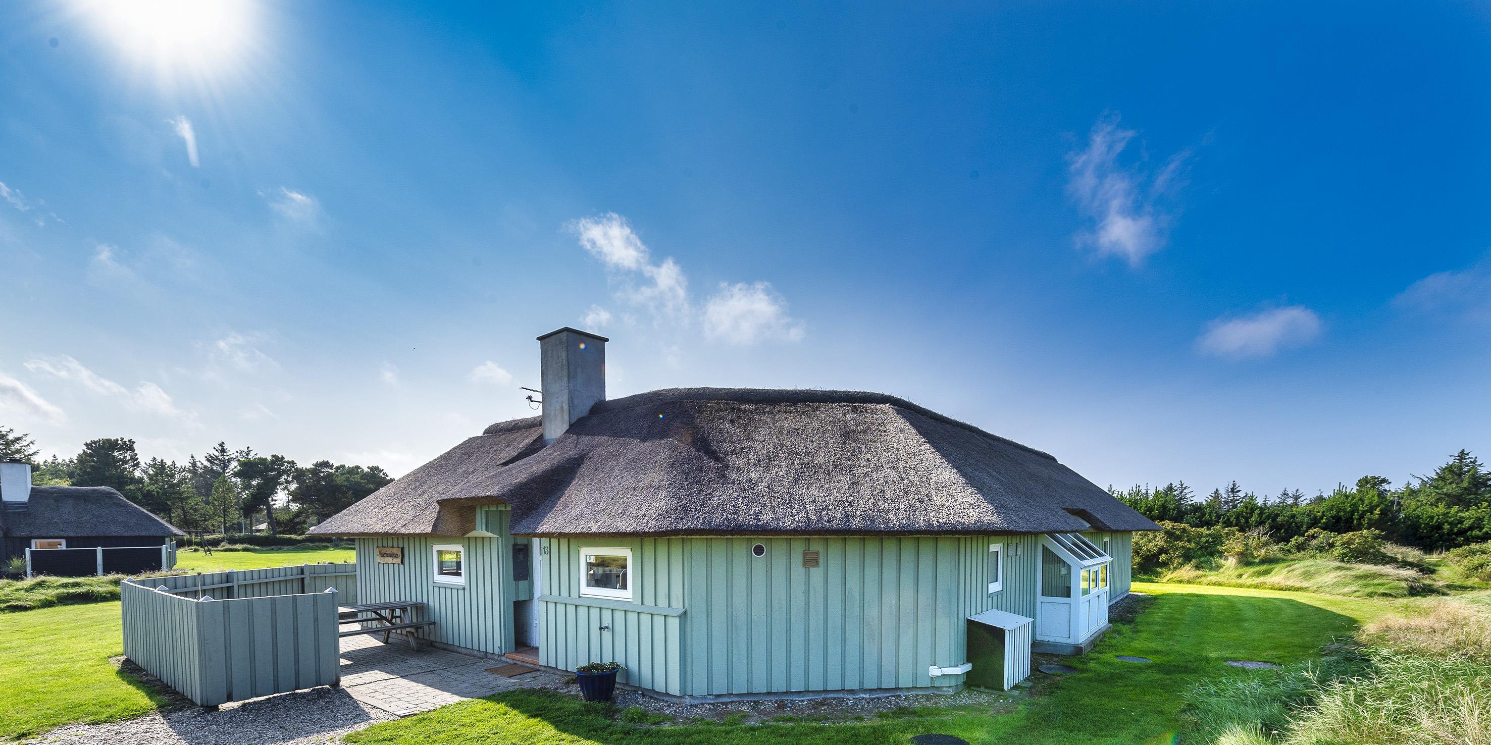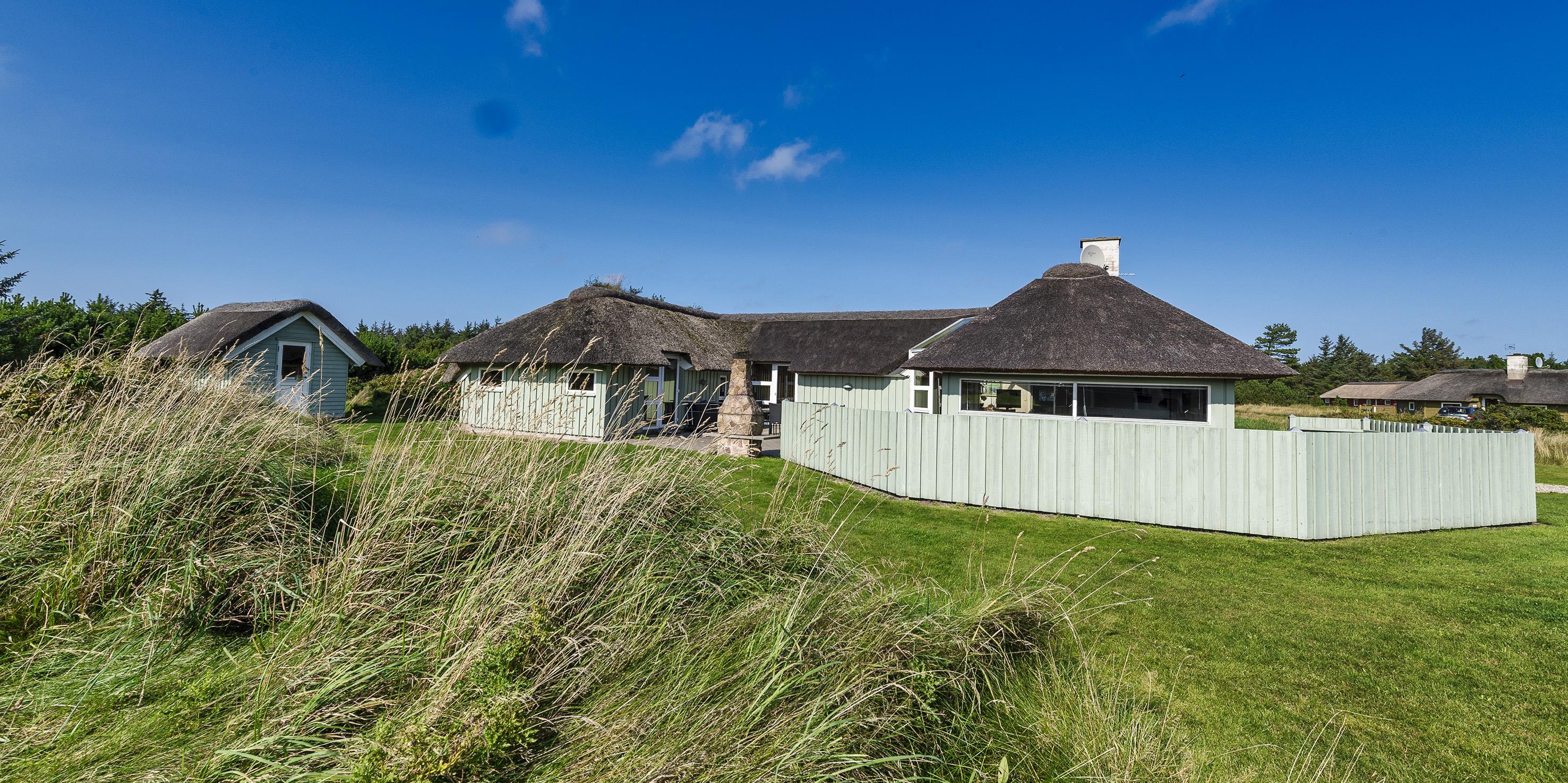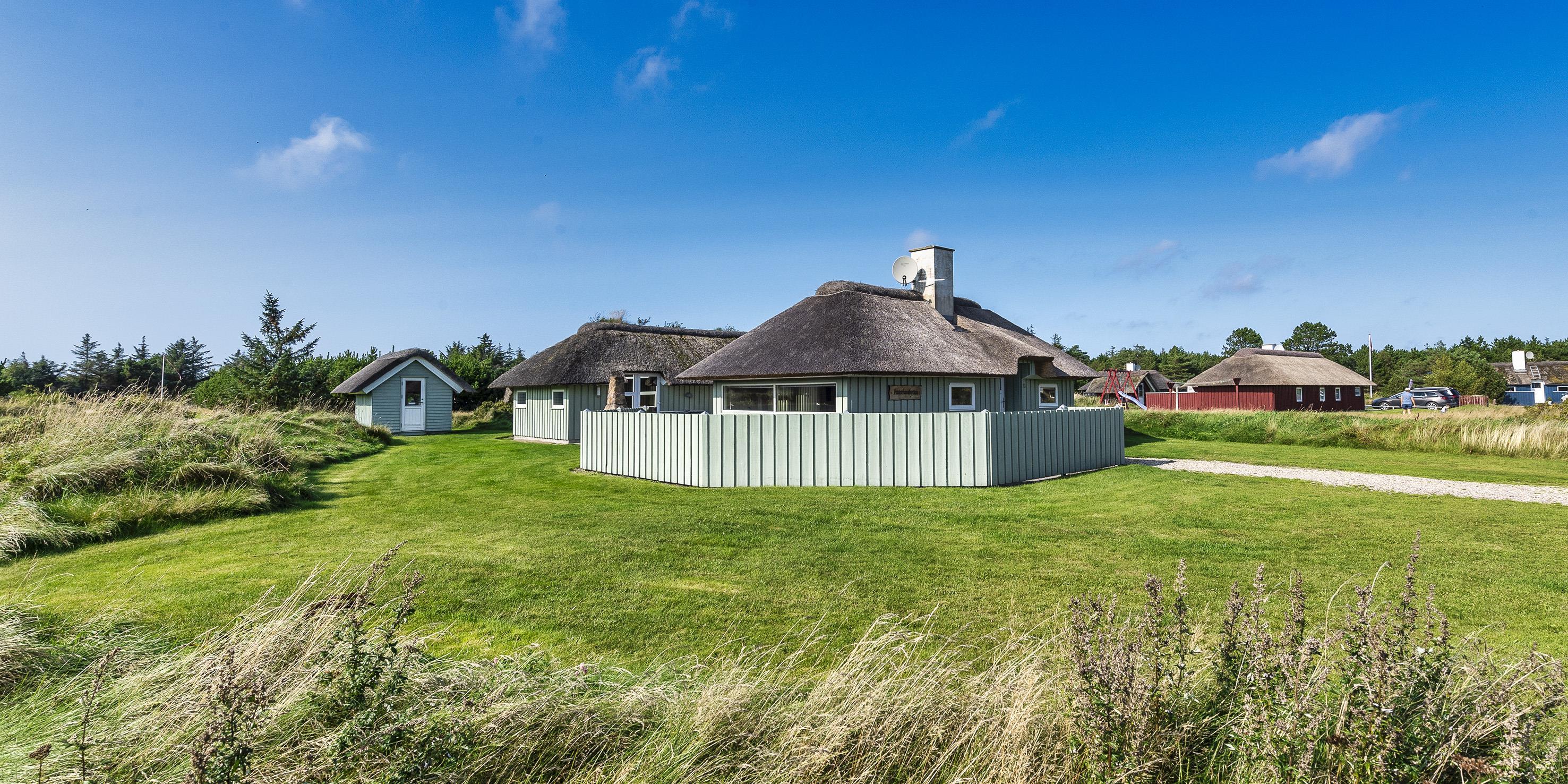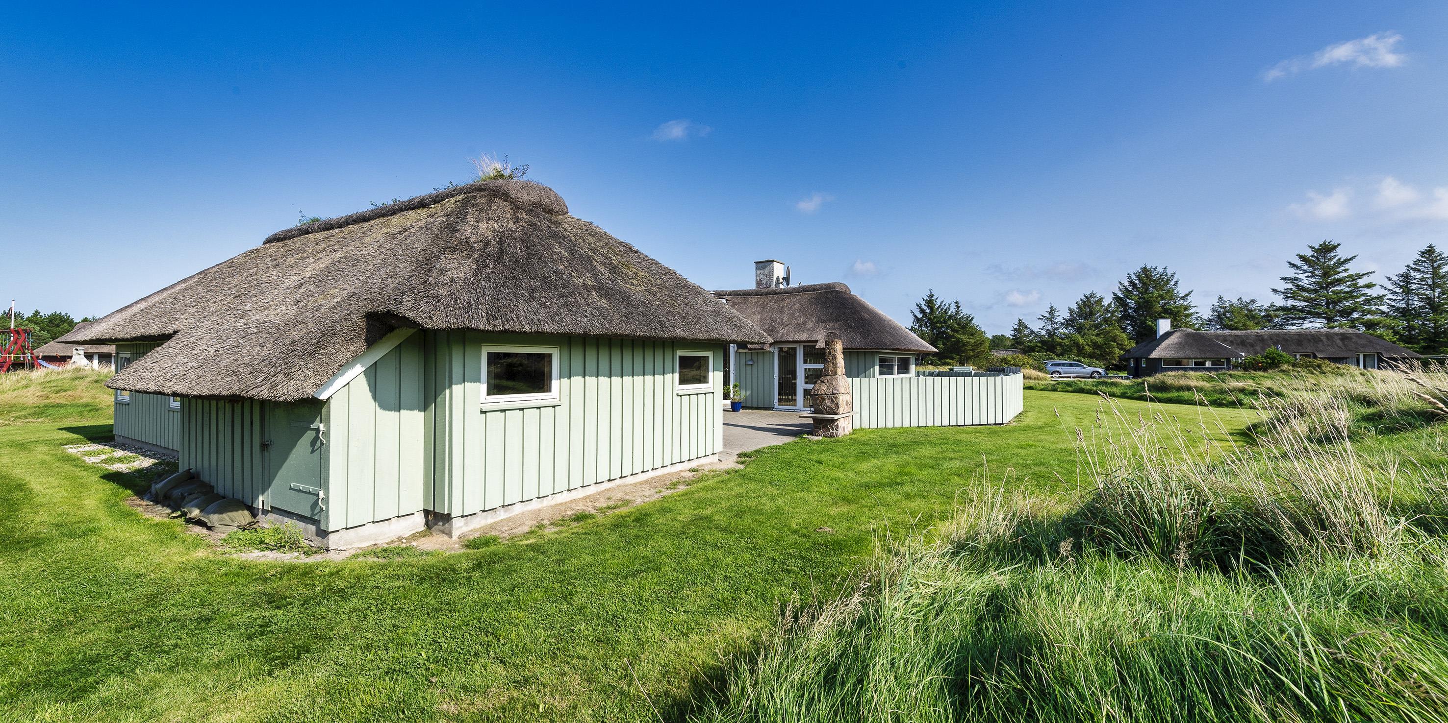 Dejligt stråtækt vinkelhus til 10 personer tæt beliggende på skovområde og cykelsti mod Grærup Strand. Sommerhuset er beliggende på en stor græsbelagt grund der indbyder til leg for børnene