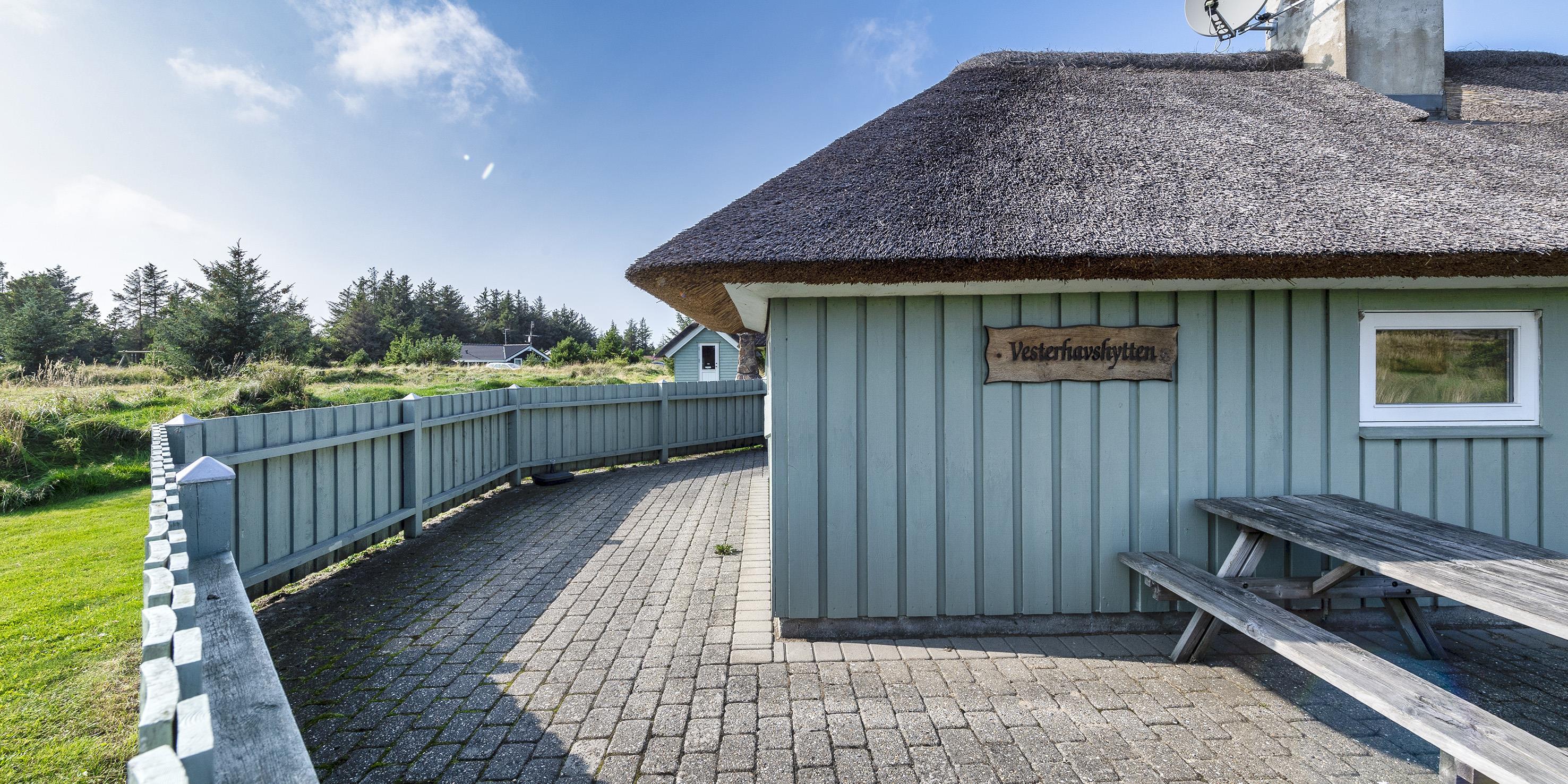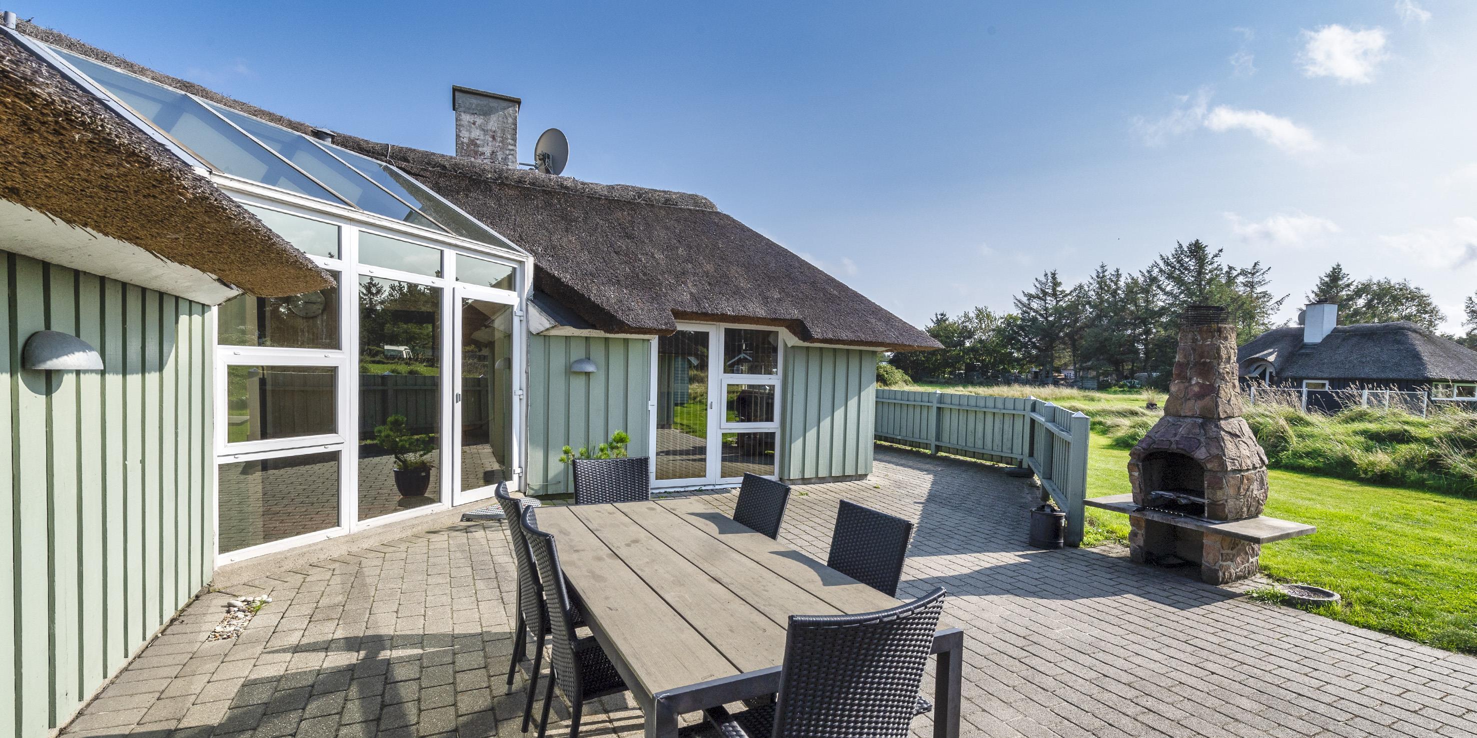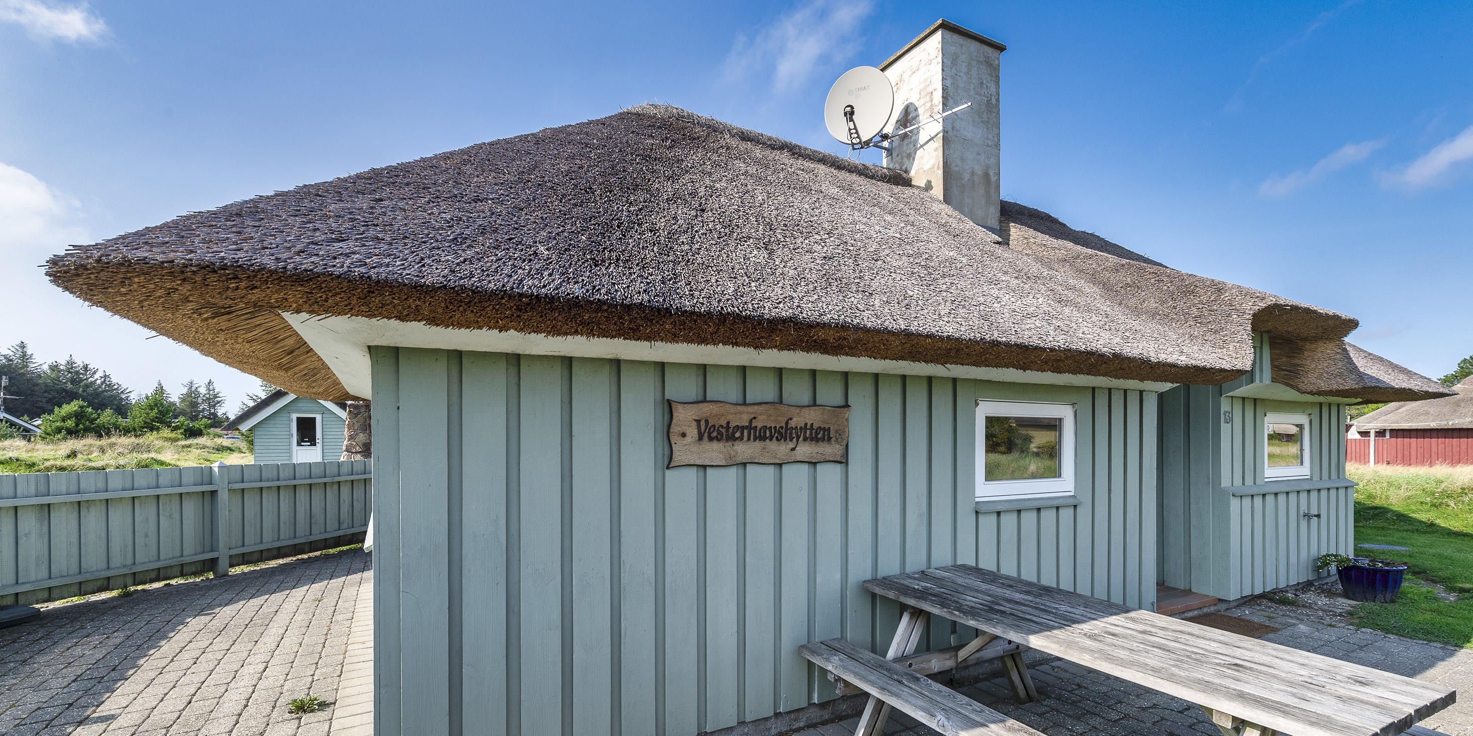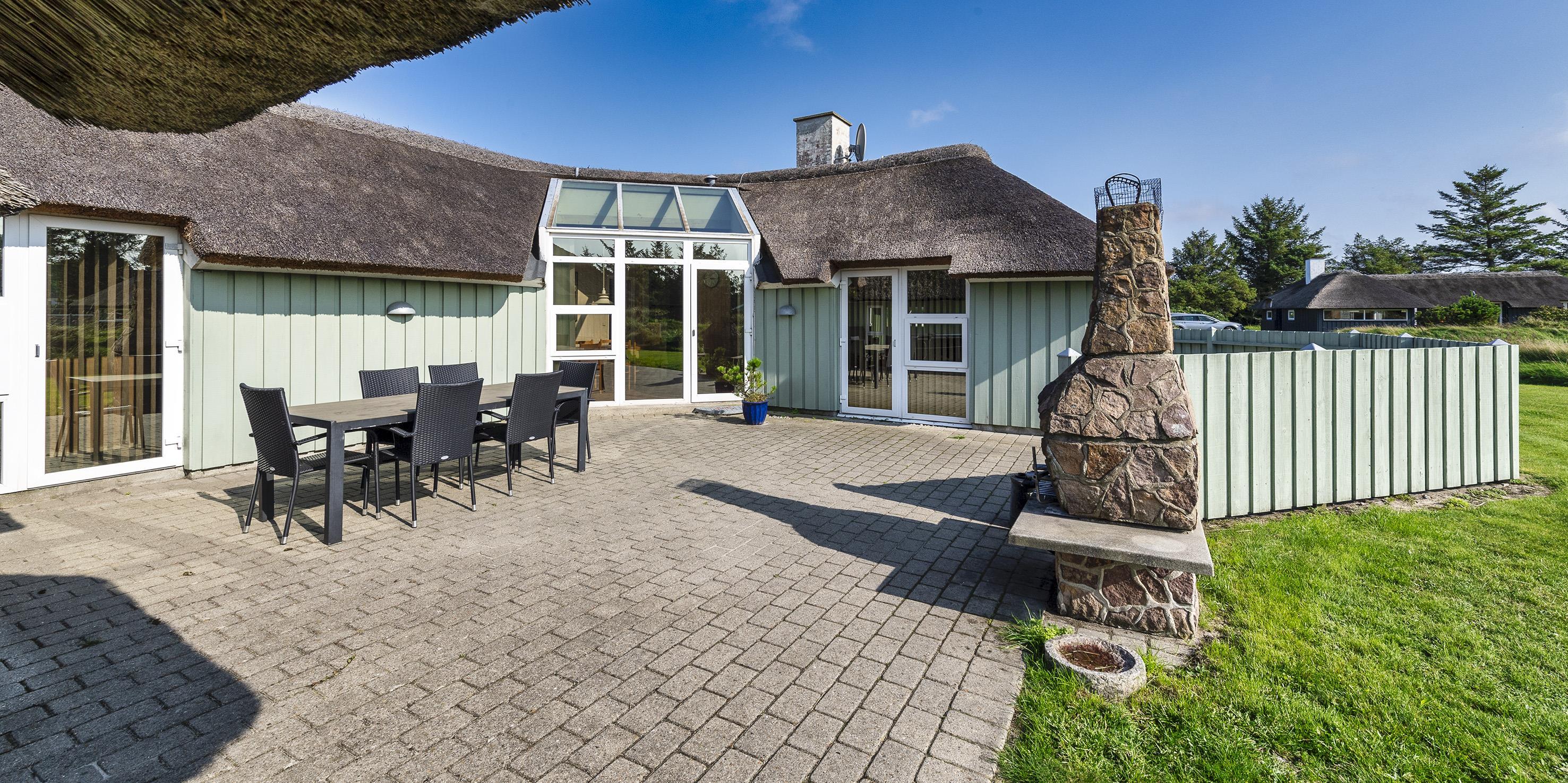 Dejligt stråtækt vinkelhus til 10 personer tæt beliggende på skovområde og cykelsti mod Grærup Strand. Sommerhuset er beliggende på en stor græsbelagt grund der indbyder til leg for børnene