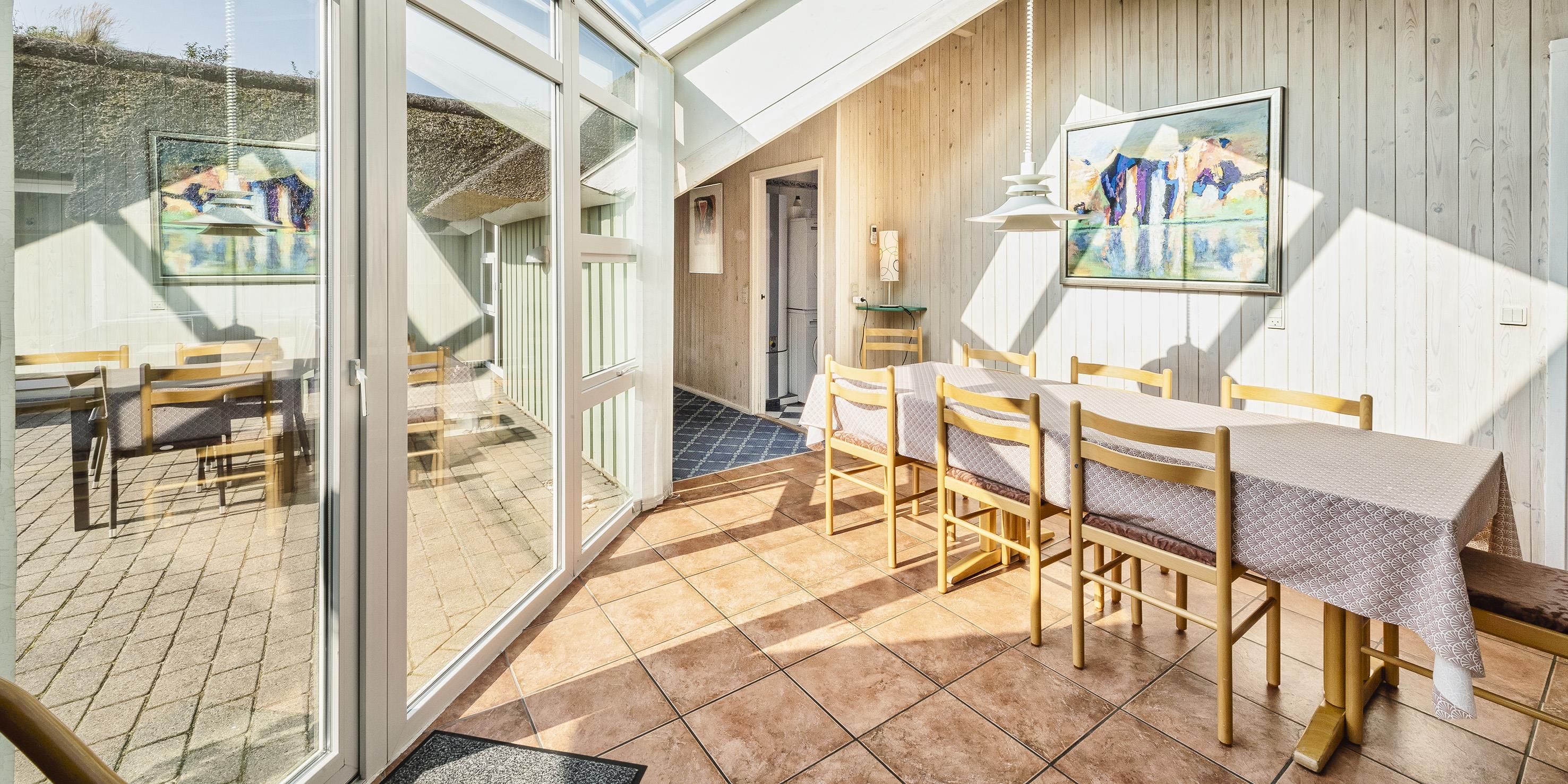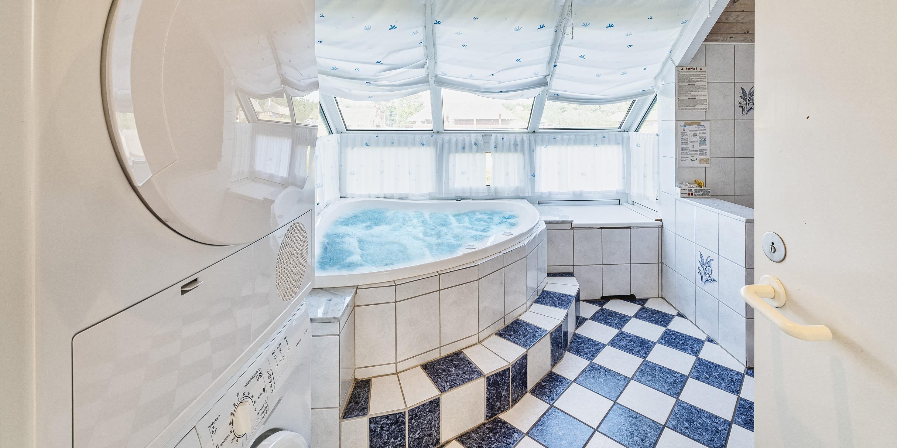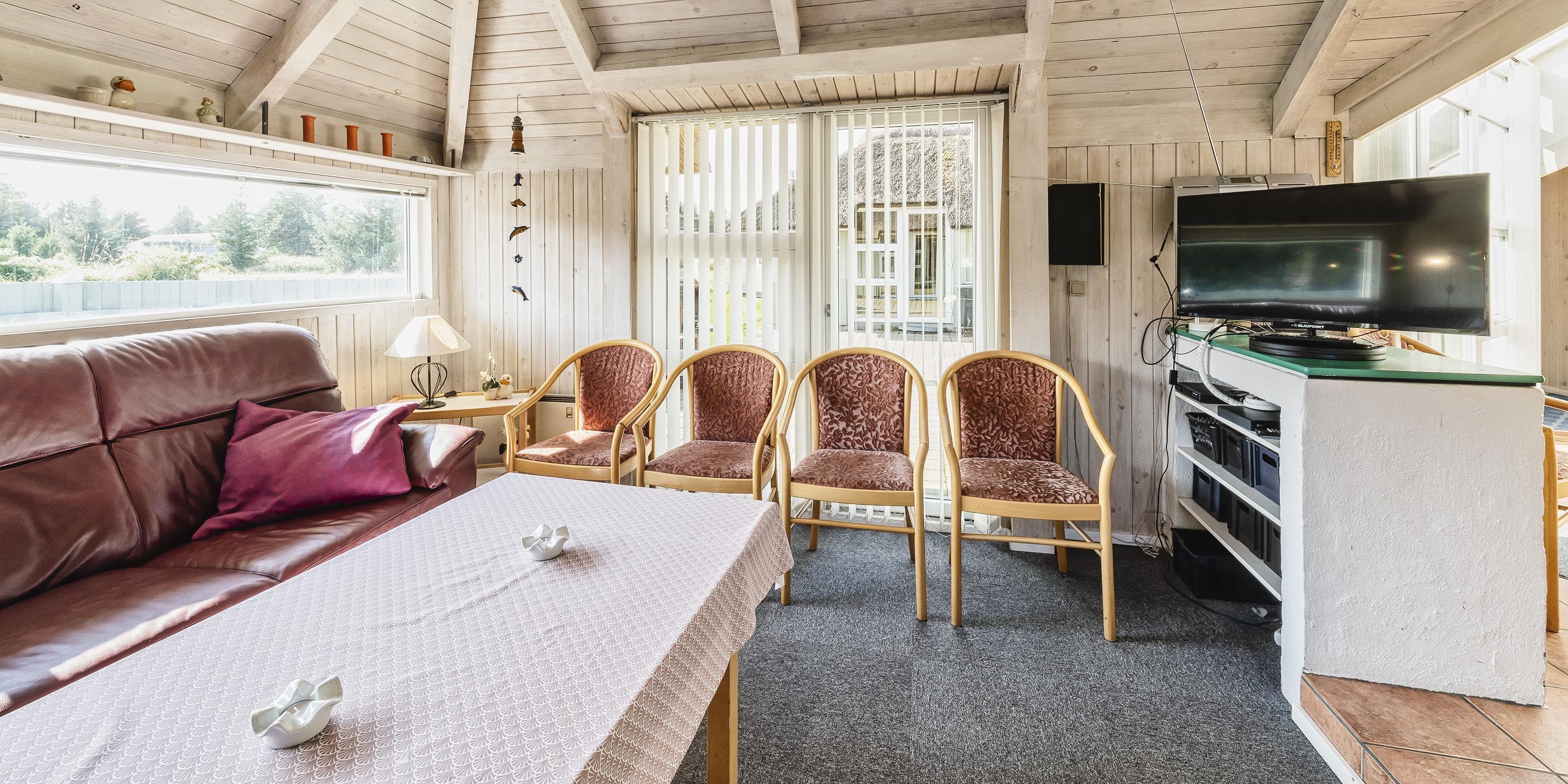 Entre igennem lille gang hvorefter man kommer over i huset opholdsrum. Det åbne opholdsrum fremstår med lys spisestueafdeling med udgang til terrassen. Spisestueafdelingen ligger i åben forbindelse med køkkenet. Køkken fremstår med opvaskemaskine, køle-/fryseskab, komfur med keramisk kogeplade, mikroovn. Huset indeholder en hyggelig nedsænket stue med brændeovn (pejs med indsats), DVD-afspiller, Chrome Cast og fjernsyn. Varmepumpe. Badeværelse med bruser, wc, vask med underskab. 5 soveværelser: 2S + 2S + 2S + DS + DS. Wellness badeværelse med bruser/wc og ophævet hjørnespa. Vaskesøjle med vaskemaskine og tørretumbler. Rygning er ikke tilladt i huset. Dejlig delvis lukket terrasse med grillplads. Trådløs internet (30/30). Max 1 hund er tilladt! Rygning er ikke tilladt. Byggeår 1988. Renoveret 2006. Adgang til Oksbøl Badeland 2026.