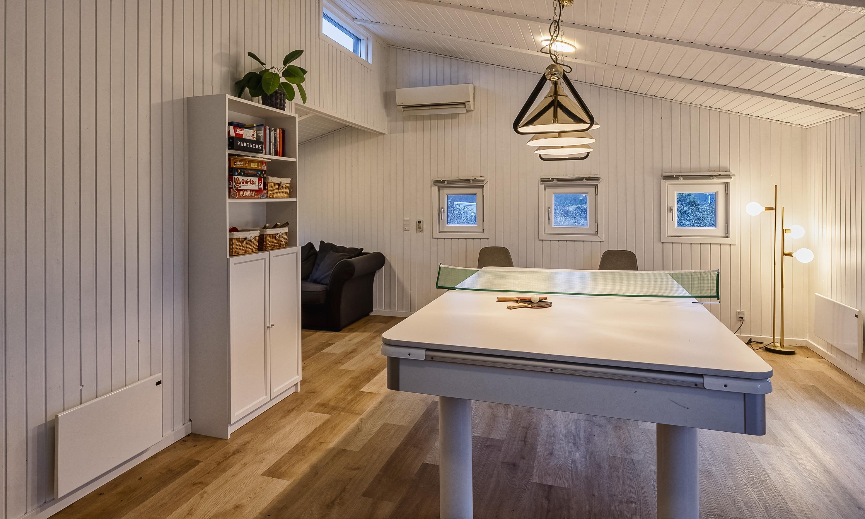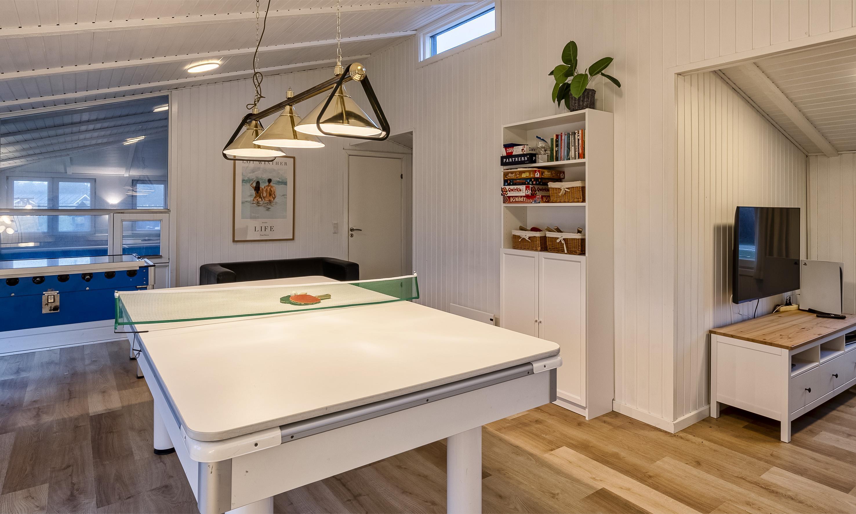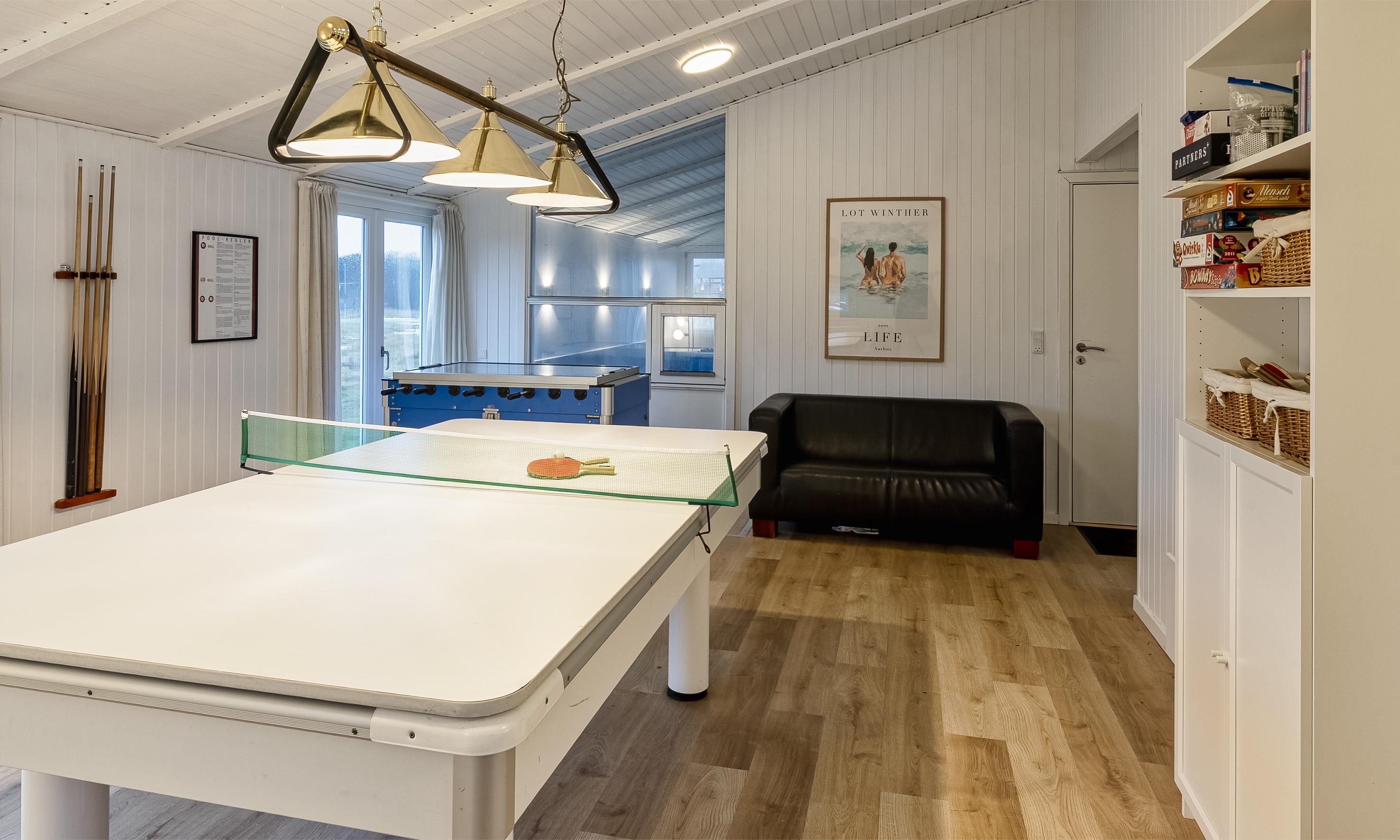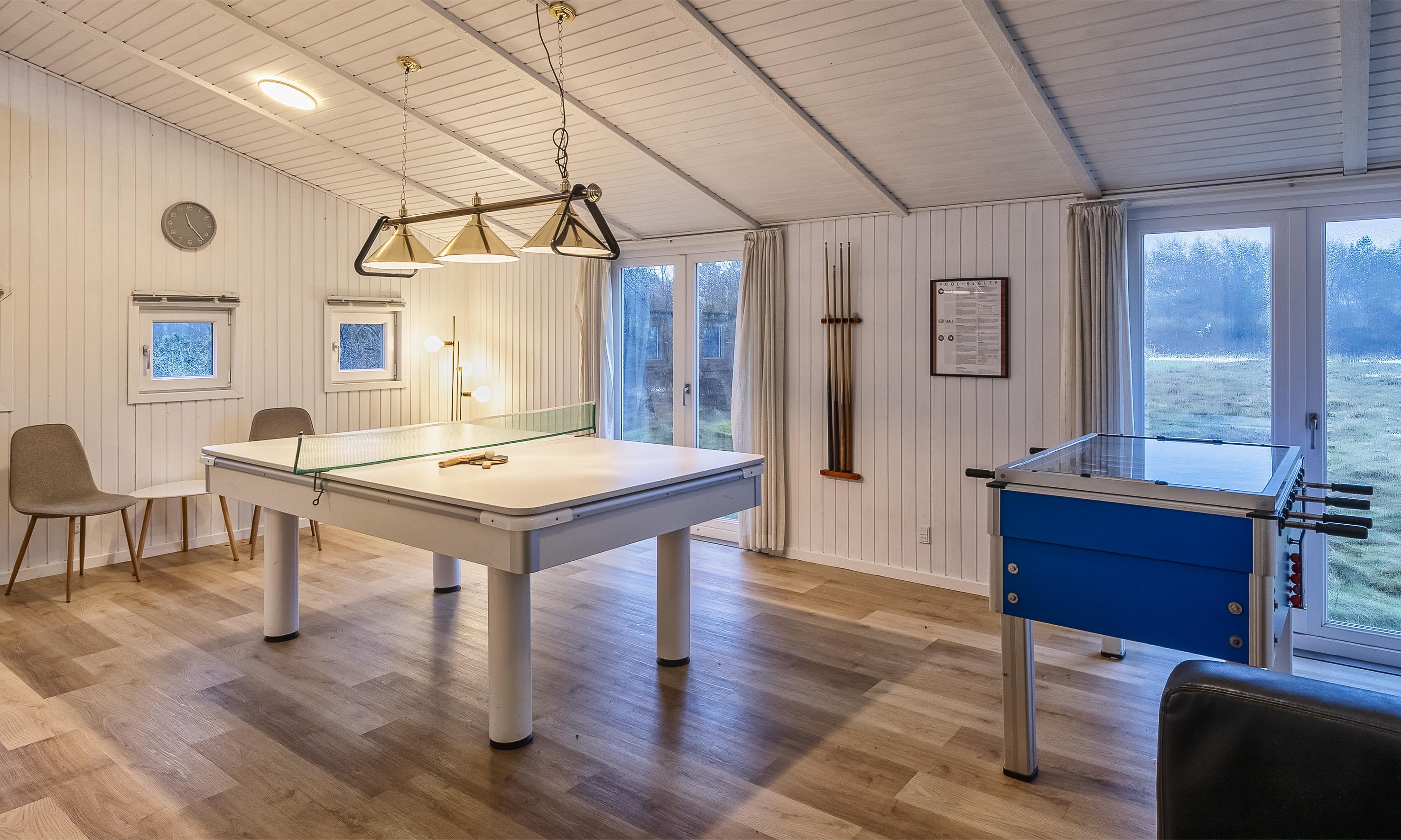 Stort og lyst aktivitetsrum med bordtennis, billardbord og bordfodbold.
