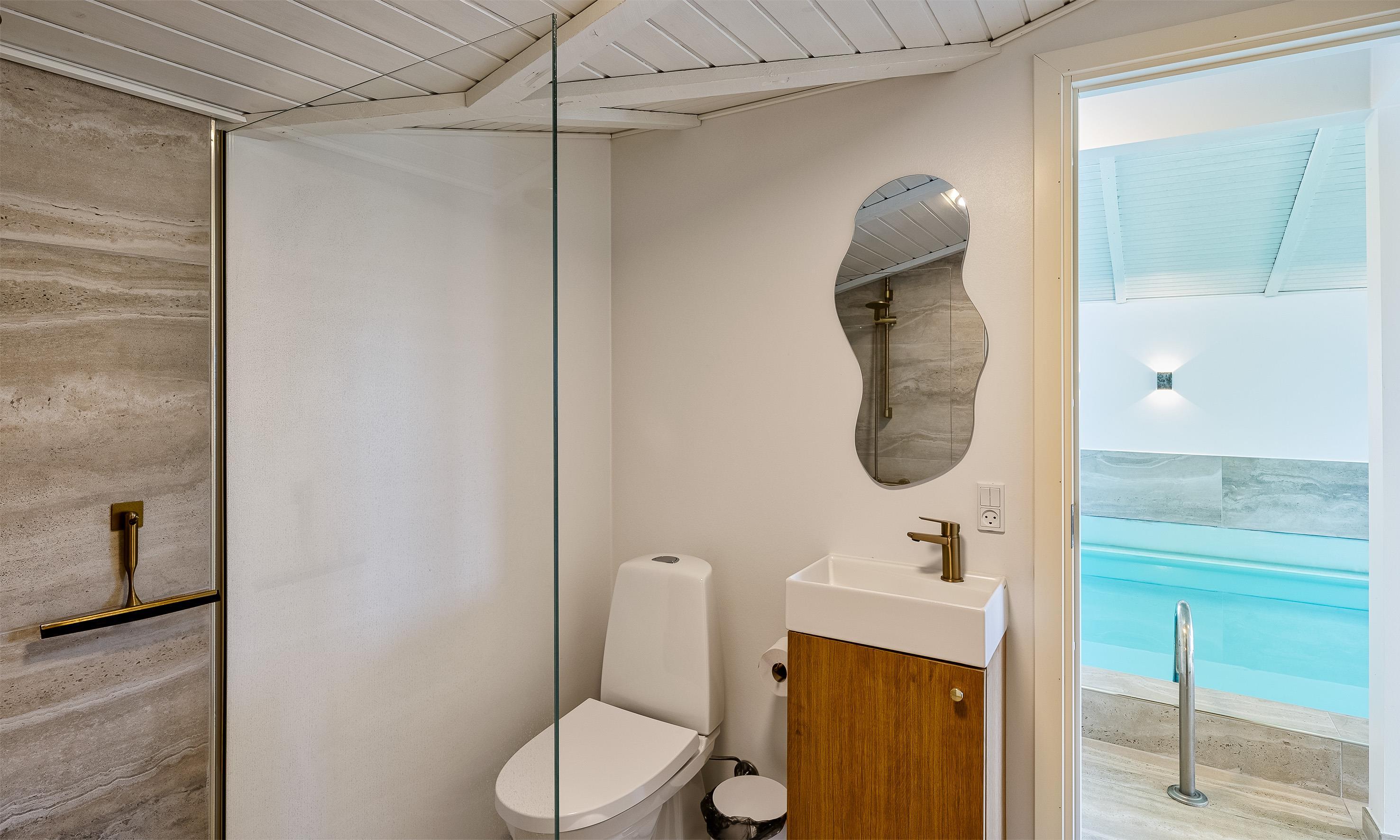 Poolrum med indgang til badeværelse med wc og bruser samt indgang til stor sauna. Pool har en størrelse med ca. 6, x 3,6 x 1,10 meter ( længde x brede x dybde).