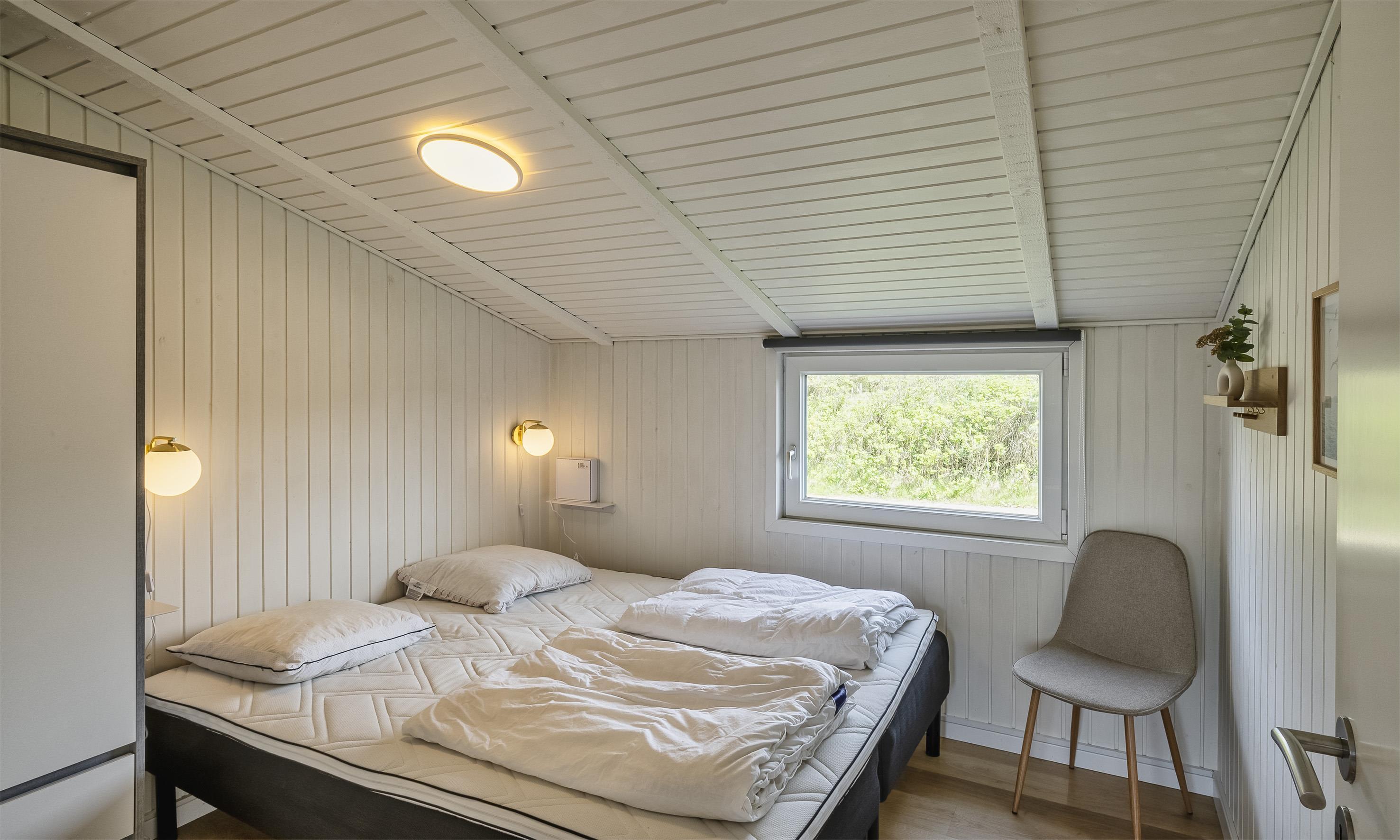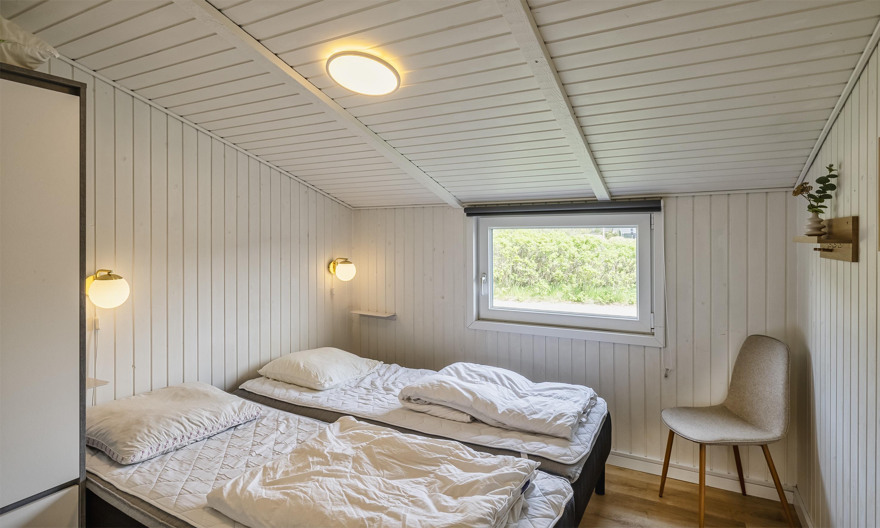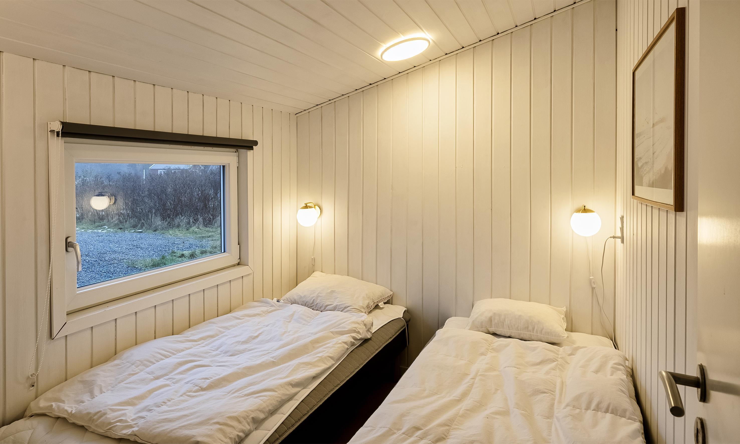 5 soveværelser. 3 med dobbeltseng 180x200 cm. 2 hver med 2 enkeltsenge (á 90x200 cm)
