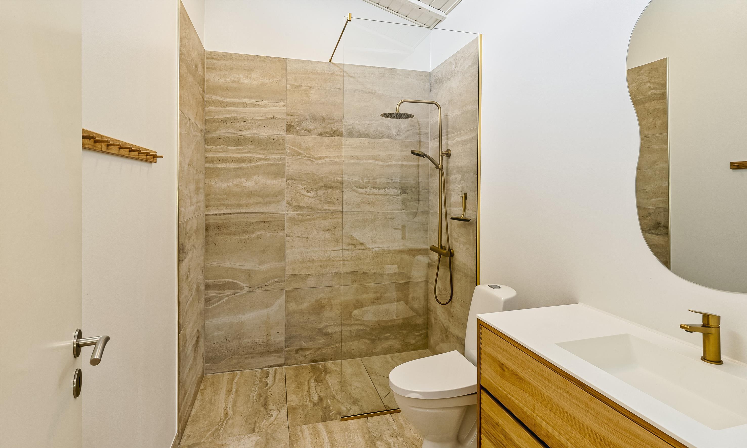 Bad med toilet, bruser og vask