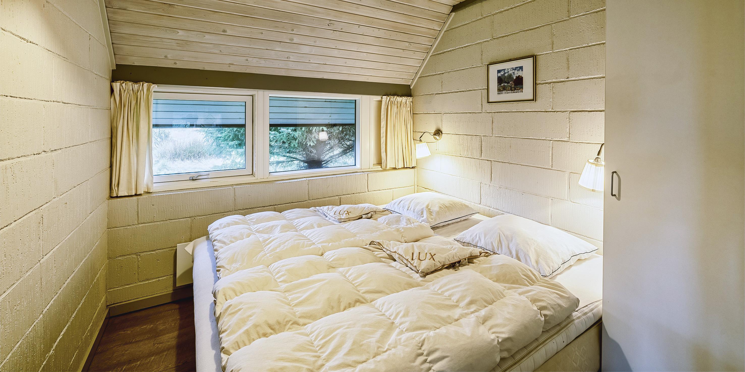 4 soveværelser. 2 med dobbeltseng 180x200 cm. 1 med sovesofa. 1 med 2 enkeltsenge (á 90x200 cm)