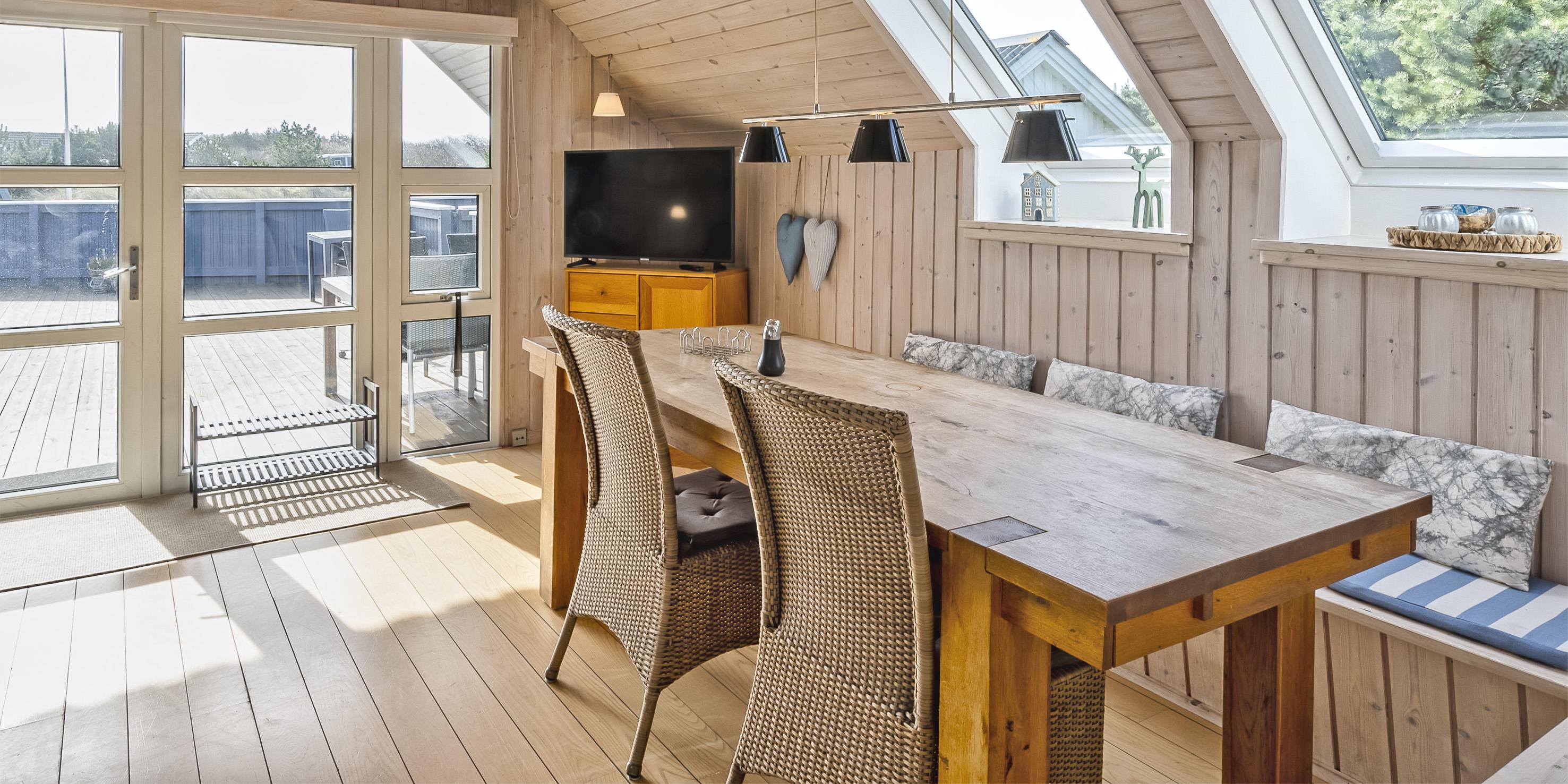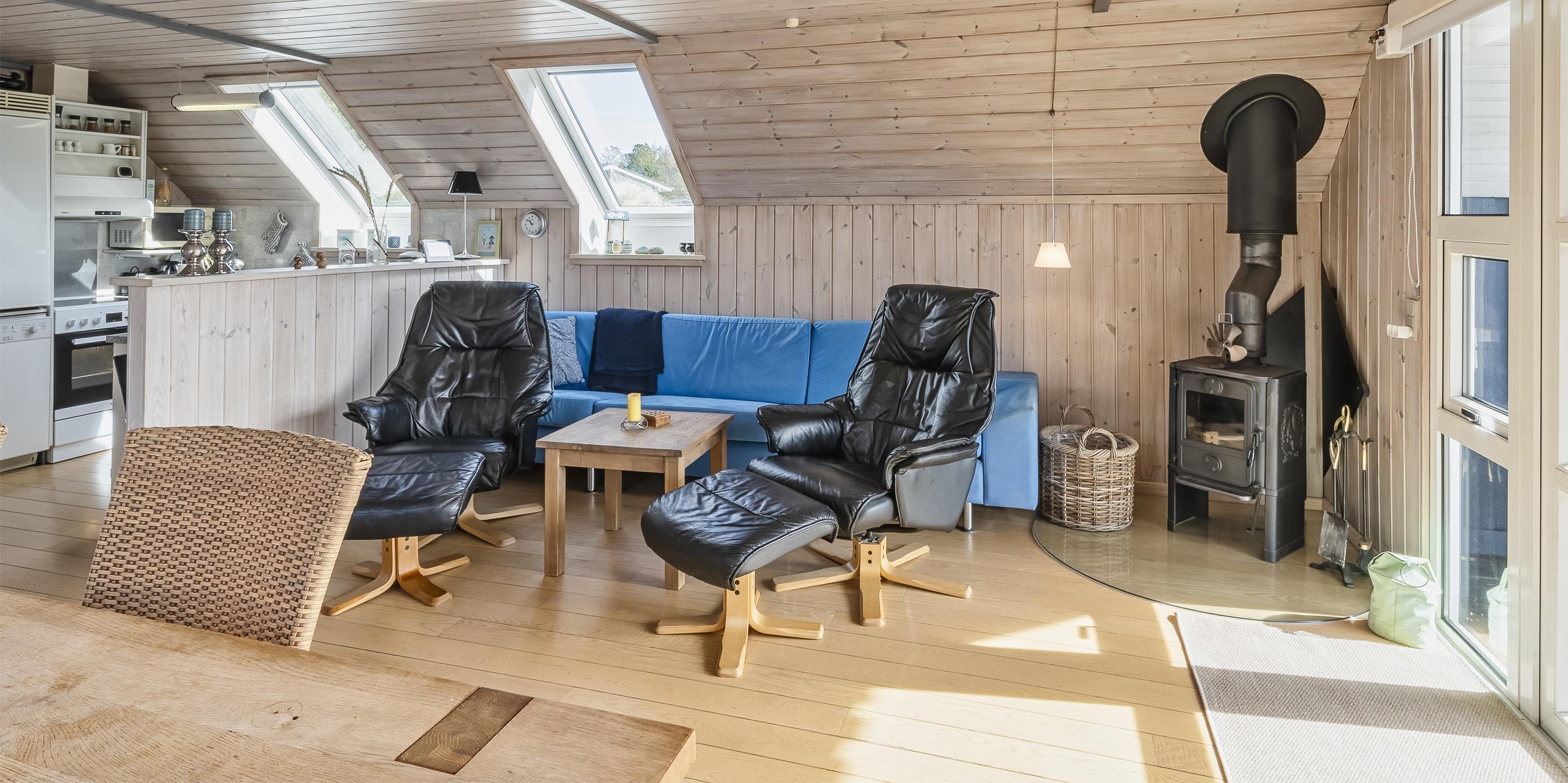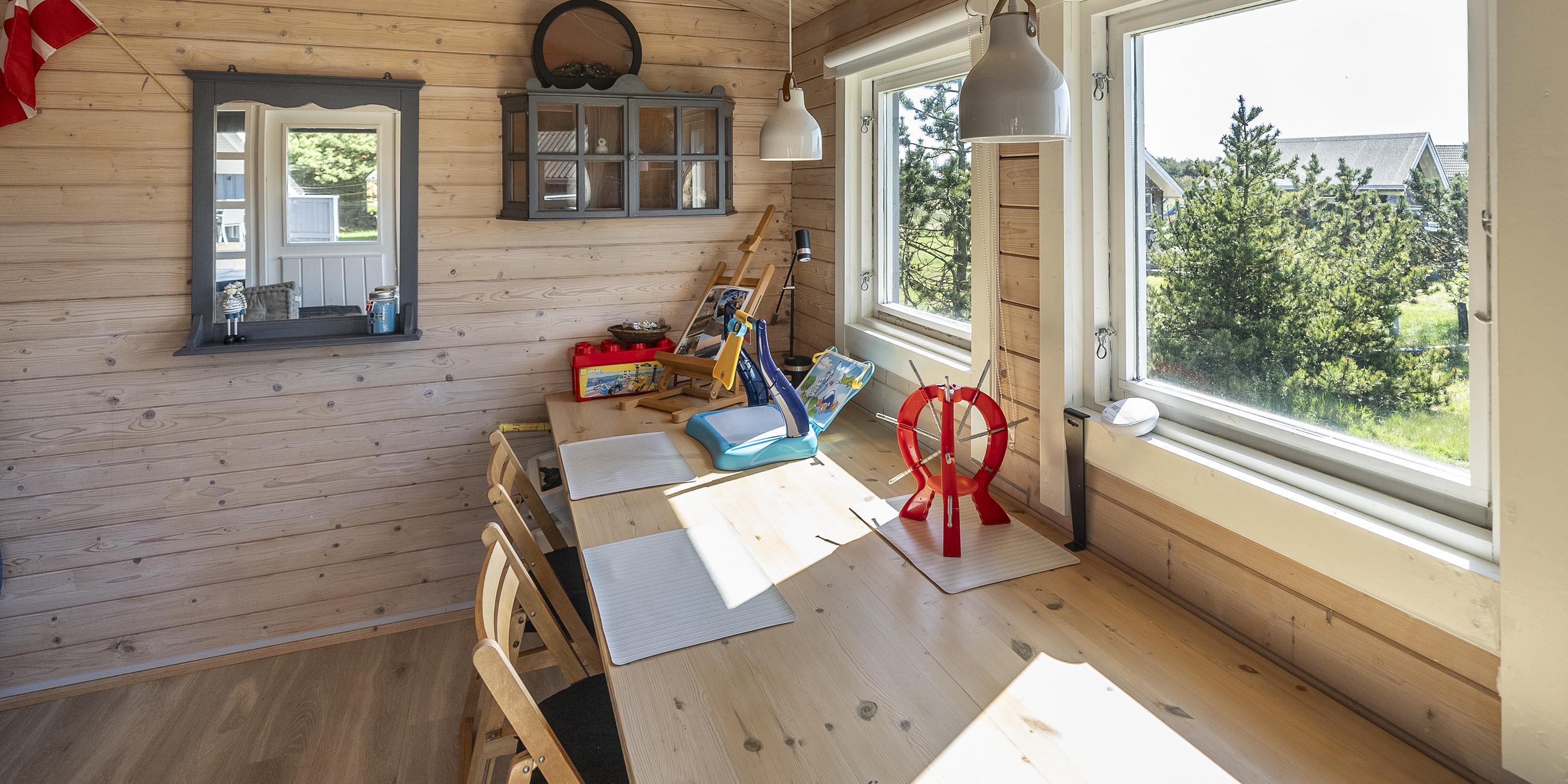 Huset fremstår med indgang over terrassen indtil stuen. Opholdsstuen fremstår med stor spiseplads med kig til brændeovnen. Sofa hygge hjørne med kig til Brændeovnen og Smart-TV, med danske som udenlandske kanaler over yousee-App. U-køkken i åben forbindelse med Opholdsstuen. Køkkenet fremstår med opvaskemaskine, komfur med keramisk kogeplade, mikroovn og køleskab, der forefindes en lille fryser i skuret. Ydermere råder huset over en varmepumpe og trådløs internet. Badeværelset med bruseniche, toilet og vaskearrangement. Vaskemaskine. Tørretumbler. Huset råder over 2 soveværelser: 2S + 4S, 1 soveværelse med 2 enkeltsenge der kan sættes sammen til en dobbeltseng (elevation) og 1 soveværelse med 2 køjesenge (sengene er max 180 cm lange). Rygning er ikke tilladt i huset eller i gæstehuset. Husdyr er ikke tilladt. Huset råder endvidere over et anneks, som ligger i tæt forbindelse med huset tværs over den store lukkede terrasse. Her har børnene mulighed for at lege uden forstyrrelser fra de voksne. De udvendige forhold byder på en fantastisk lukket træterrasse med overdækket veranda samt en stor have, hvor børnene nemt kan udfolde sig på den store græsplæne der indbyder til boldspil. Fra terrassen er der udsigt til ålestrømmen. Der er et skur ved huset med en fryser. Der afregnes ekstra for vand.