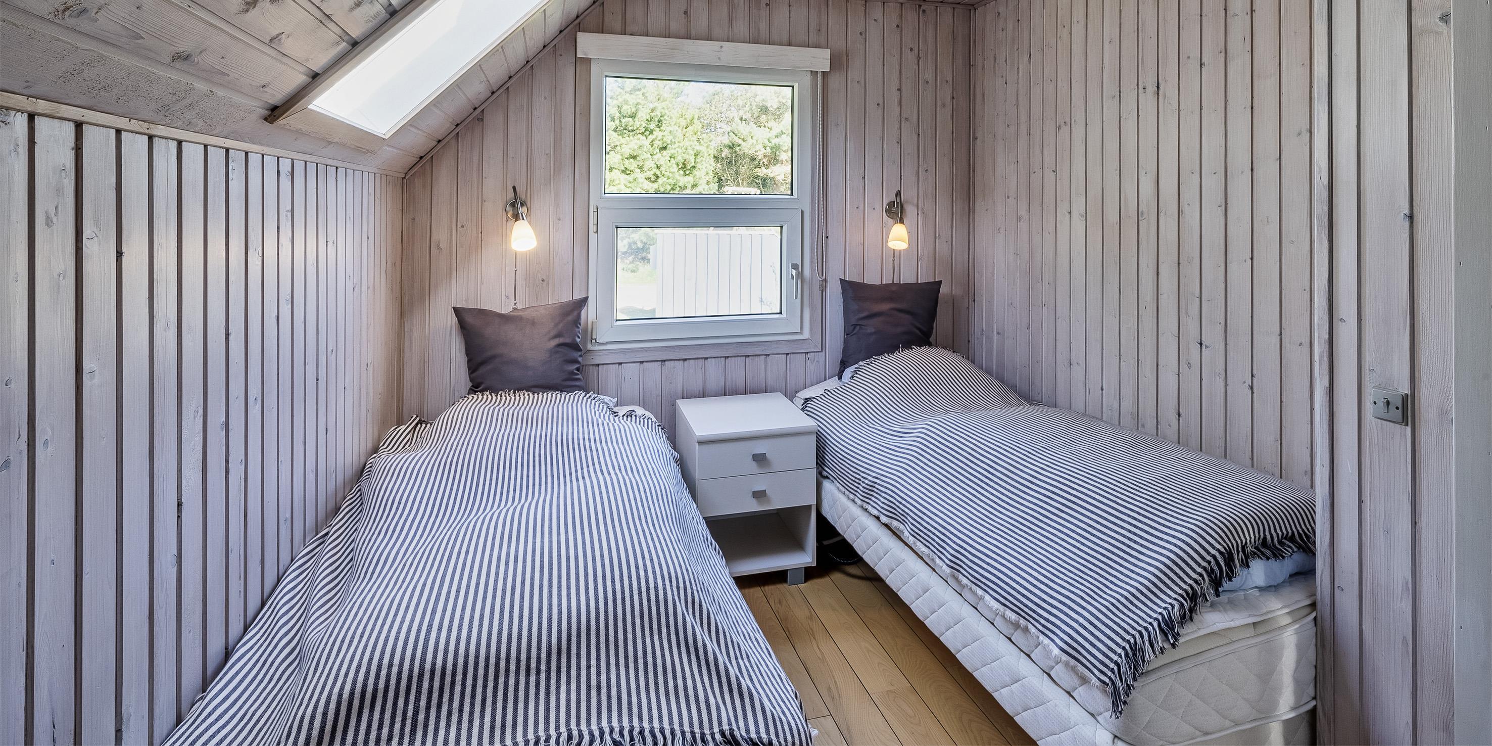 2 soveværelser. 1 med 2 enkeltsenge (á 90x200 cm) 1 med 2 køjesenge.