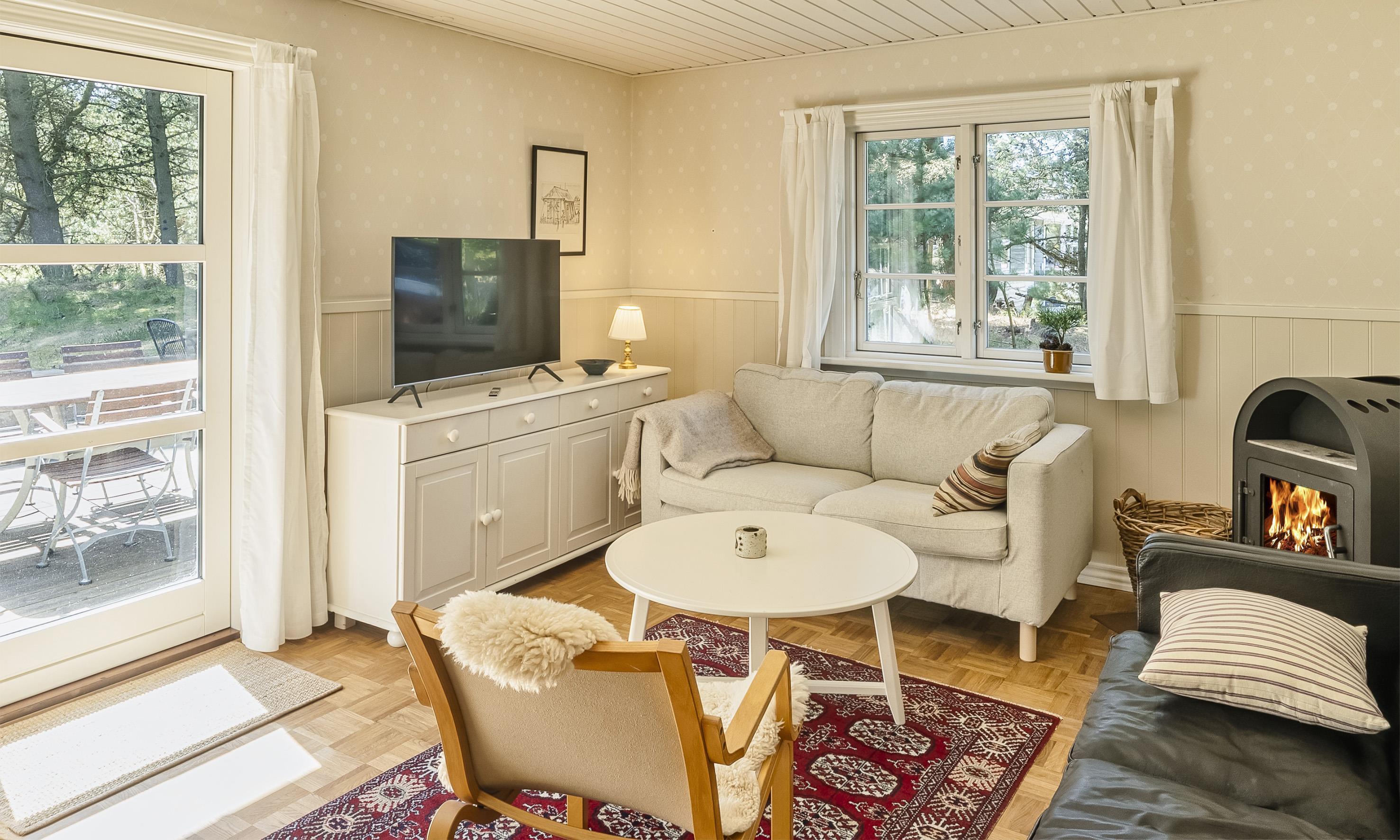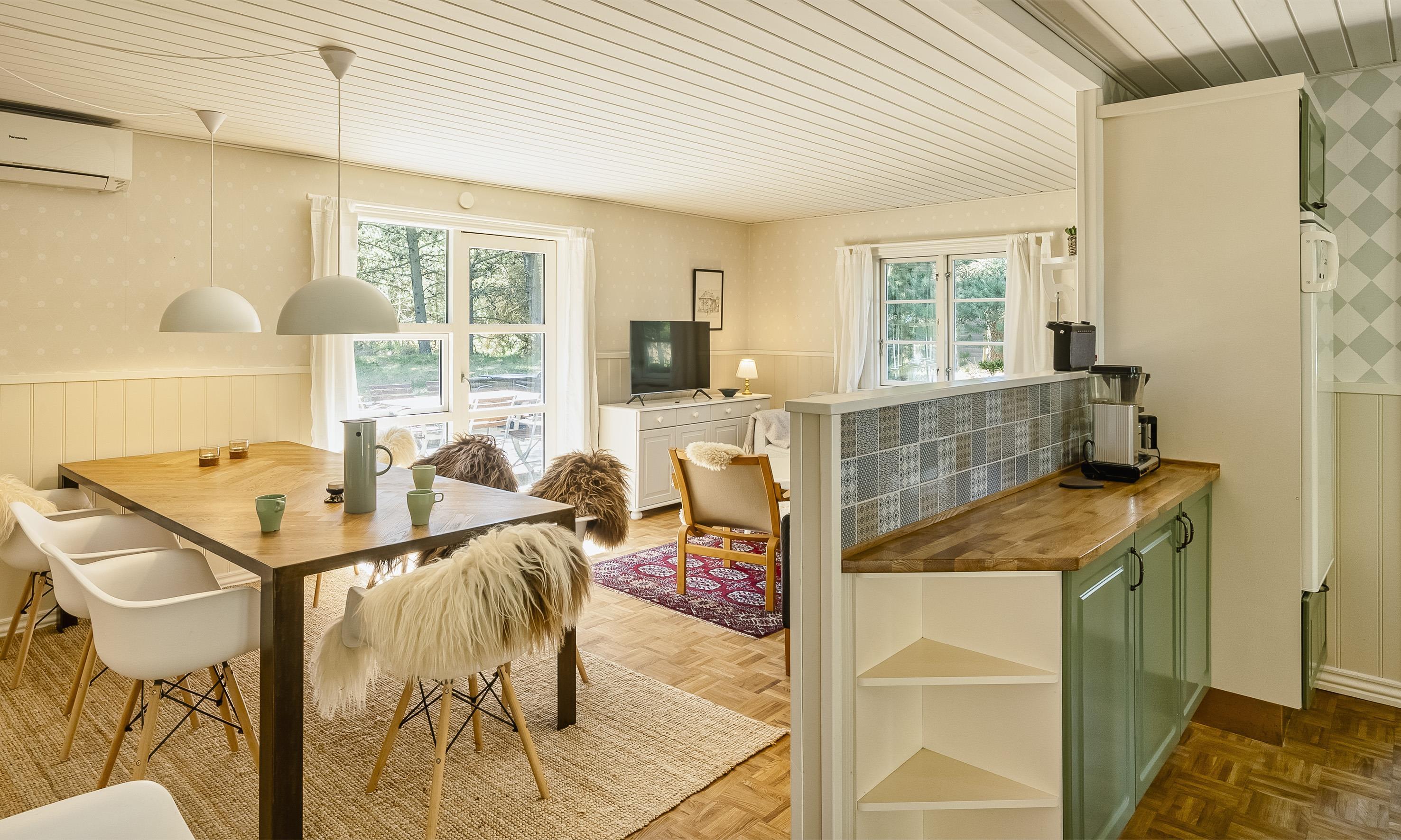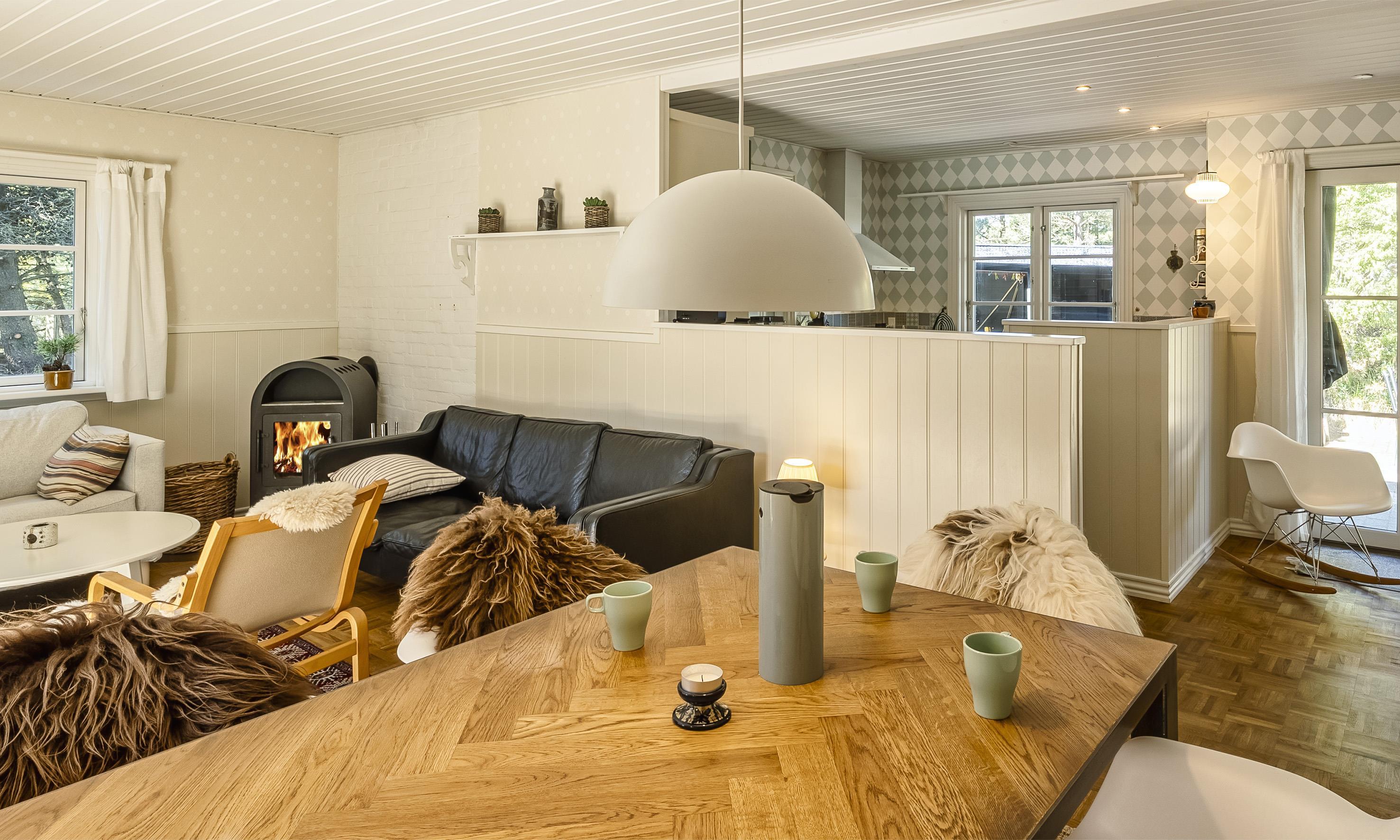 Huset fremstår med indgang/entre med bryggers med vaskemaskine og tørretumbler. Gulvvarme i gangen. Fra entreen kommer man ind til husets skønne køkken-alrum. Køkkenet er renoveret og fremstår i romantisk landkøkkenstil. Her finder man alt hvad hjertet begærer såsom opvaskemaskine, komfur med keramisk kogeplade, mikroovn og køle-/fryseskab. Køkkenet er i åben forbindelse med huset opholdsrum, der fremstår med stor spisebordsplads, hvorfra middagen kan nydes med udsigt til haven. Der er ydermere udgang til en morgenterrasse mod øst og til en vestvendt terrasse fra et lille hyggehjørne i forbindelse med køkkenet. Sofahjørne med Smart-TV, brændeovn og kig ud af den store dobbeltdør til den østvendte terrasse. Varmepumpe. Trådløs internetadgang. Huset råder ydermere over 3 hyggelige soveværelser: DS + DS + 2S. Badeværelse med bruser, wc og skabs arrangement. 2 skønne terrasser. Et heraf er en nyanlagt træterrasse, som er i plan med huset, og hvor der er opgang til et vildmarksbad der opvarmes med brændeovn. (Det tager ca. 3 timer at varme vildmarksbadet op). En vestvendt terrasse der er total ugeneret og med god læ. Utrolig spændende naturgrund med rigt dyreliv omkranset med træer og udlagt med flere hyggekroge. En luksus udesauna med et stort glasparti hvorfra søen ved Jafdalvej kan observeres. Der forefindes en udvendig bruser med koldt vand.