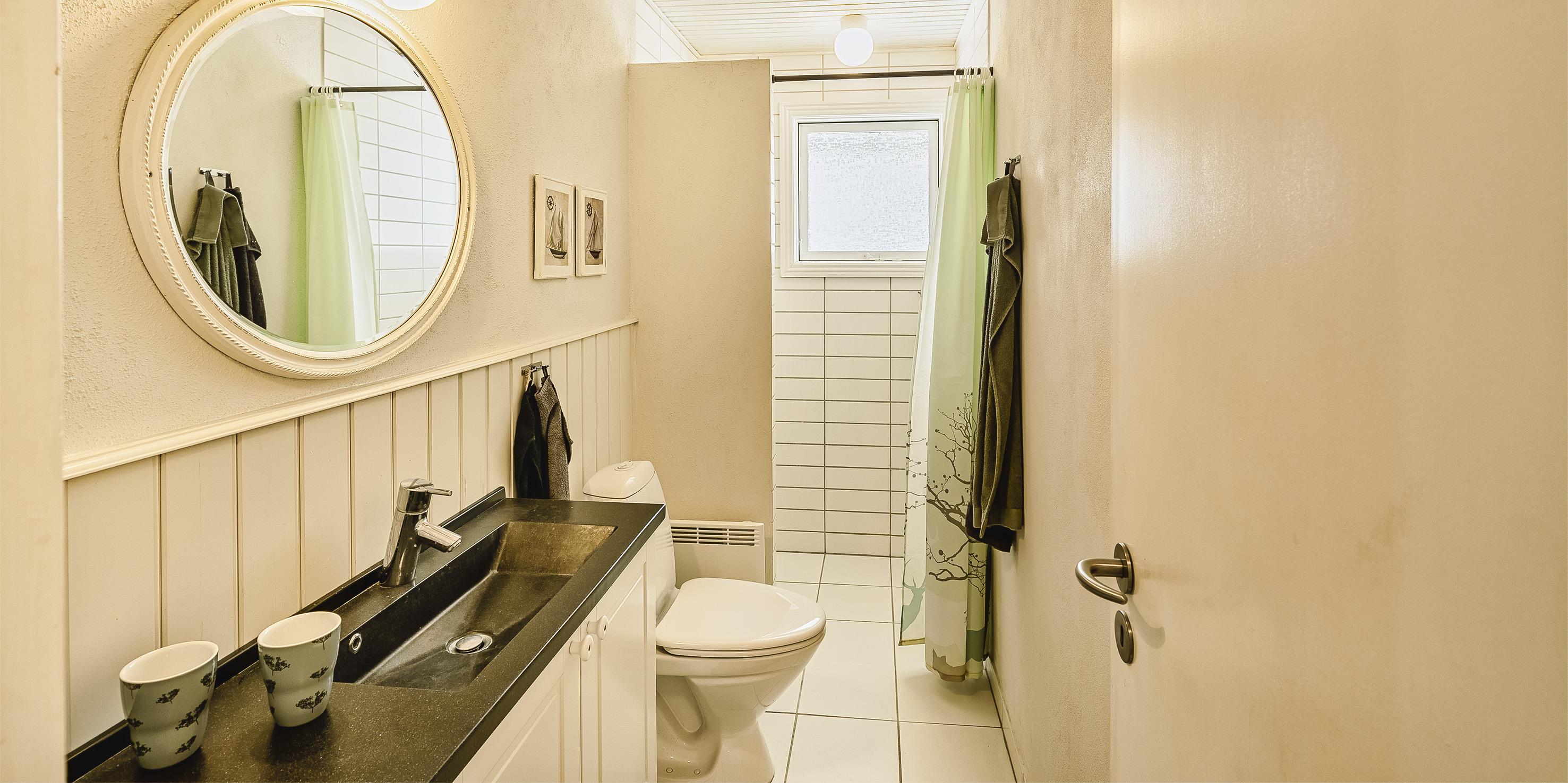 Bad med toilet, bruser og vask