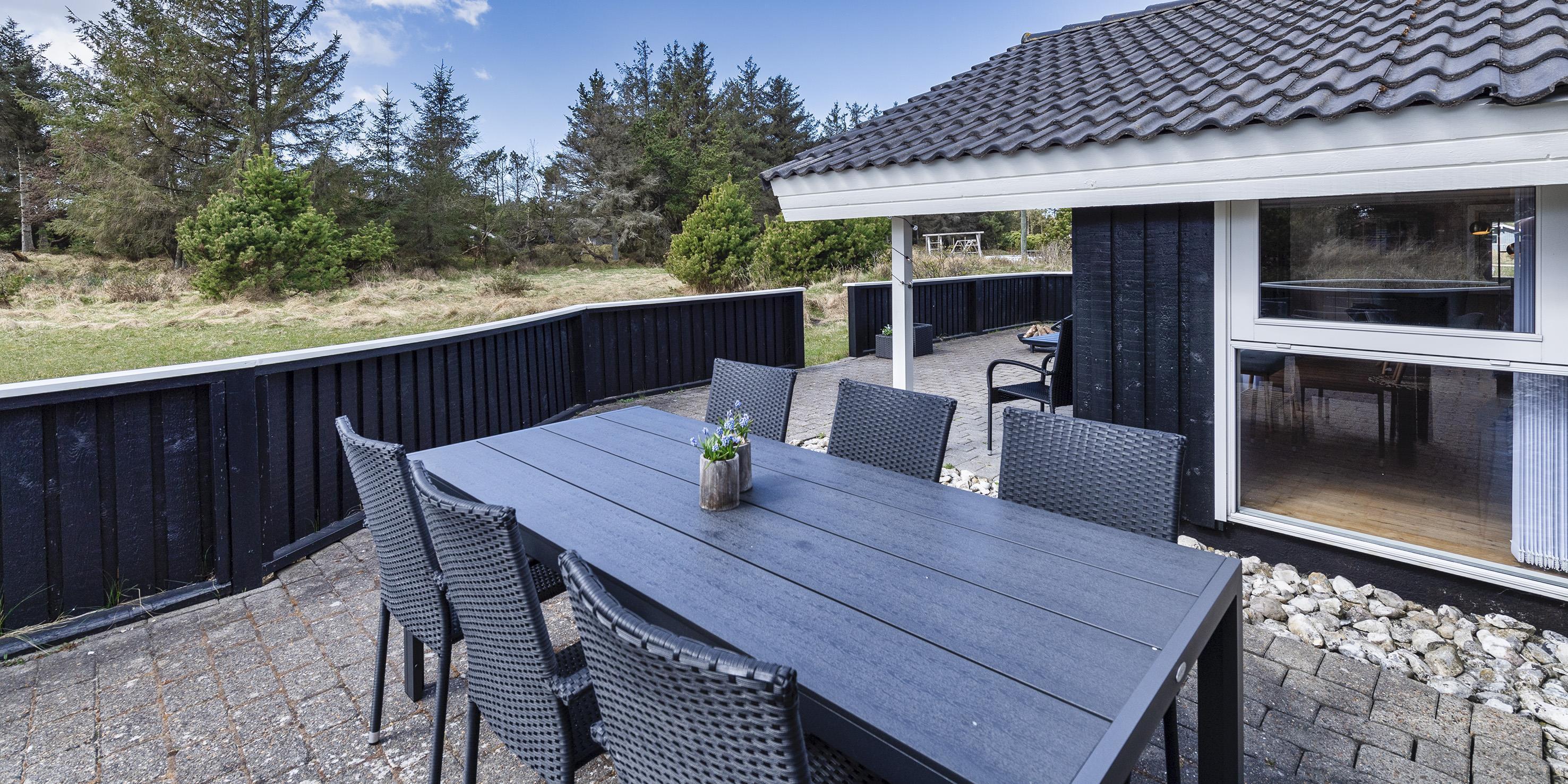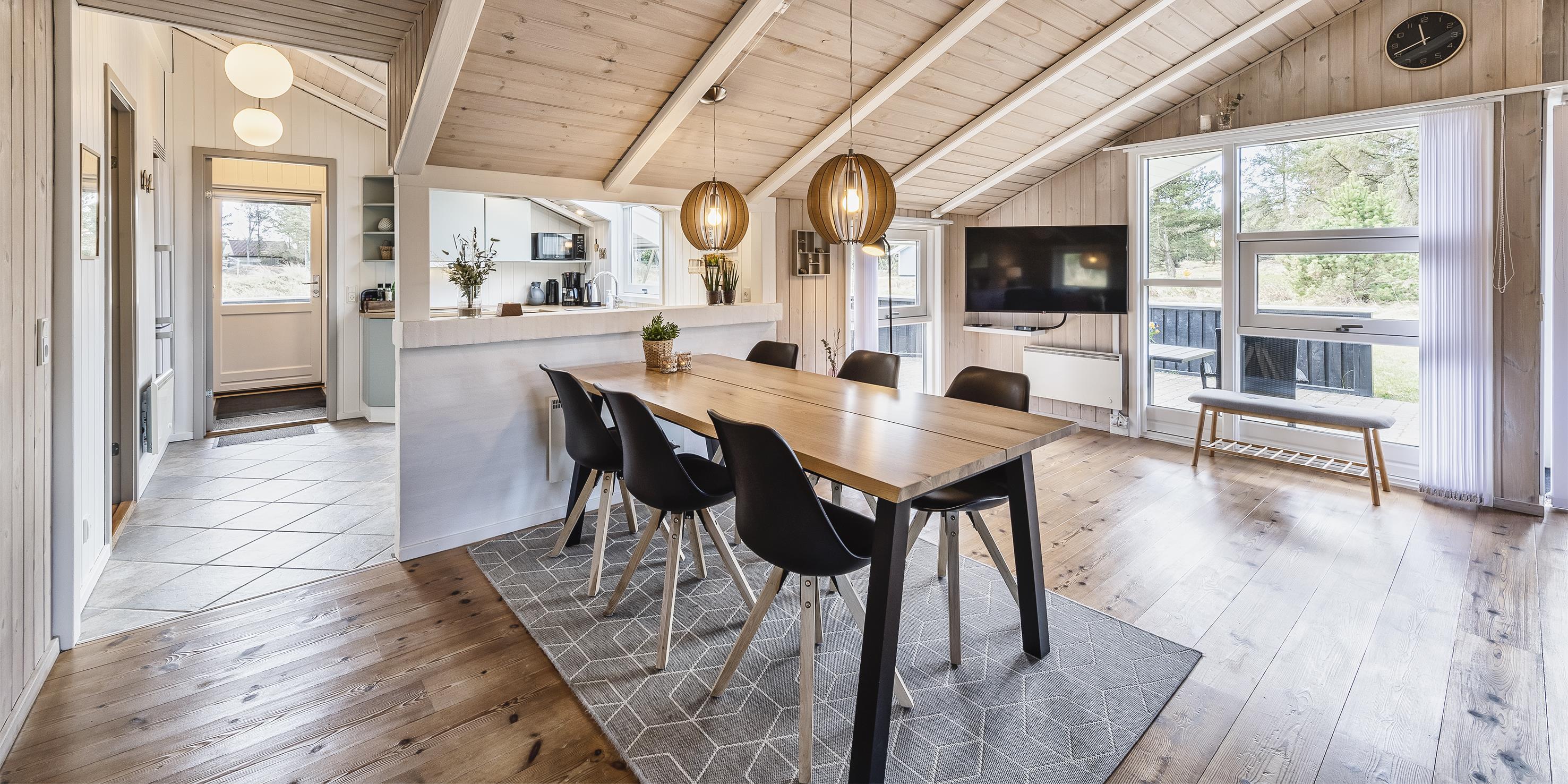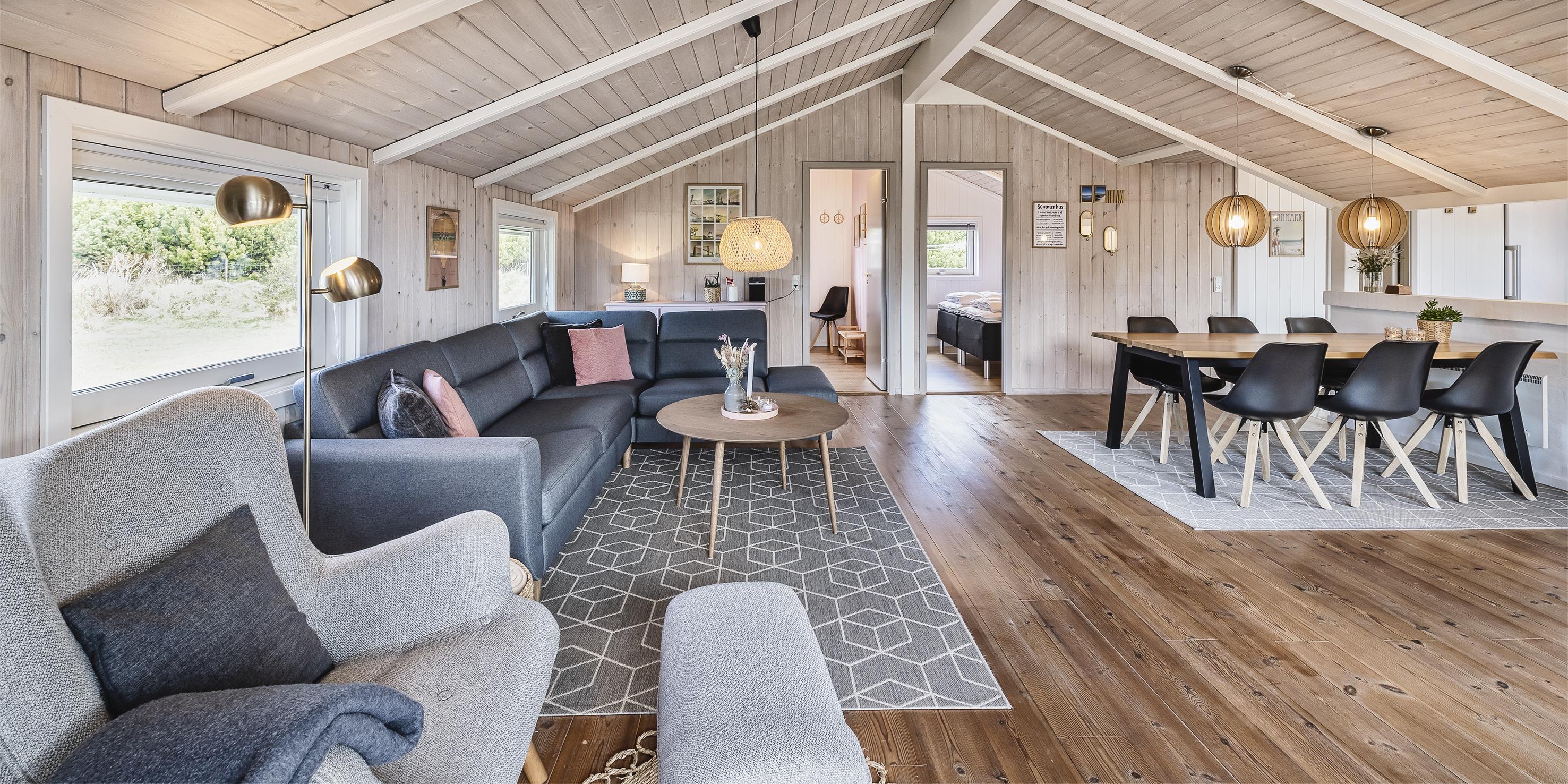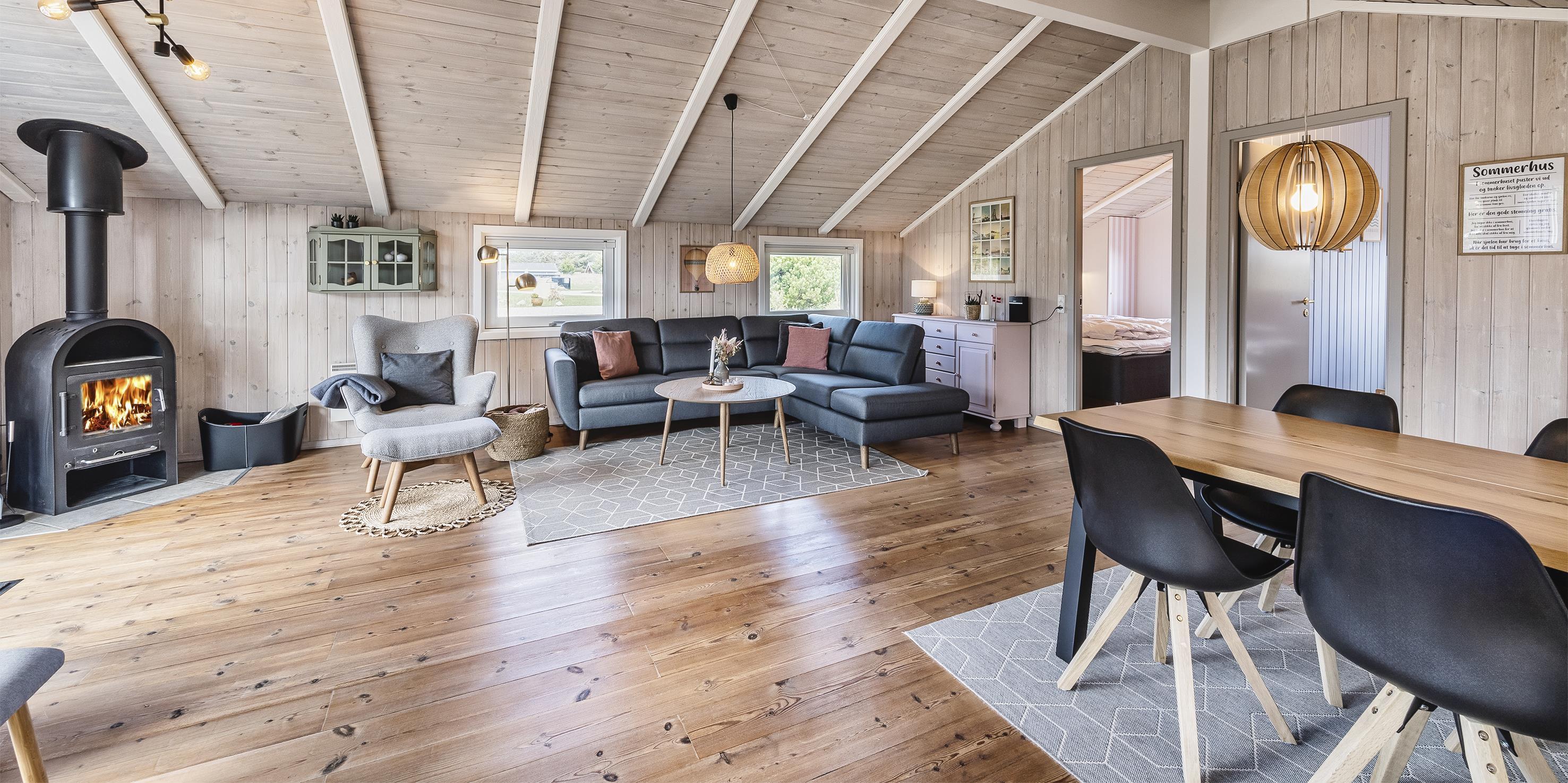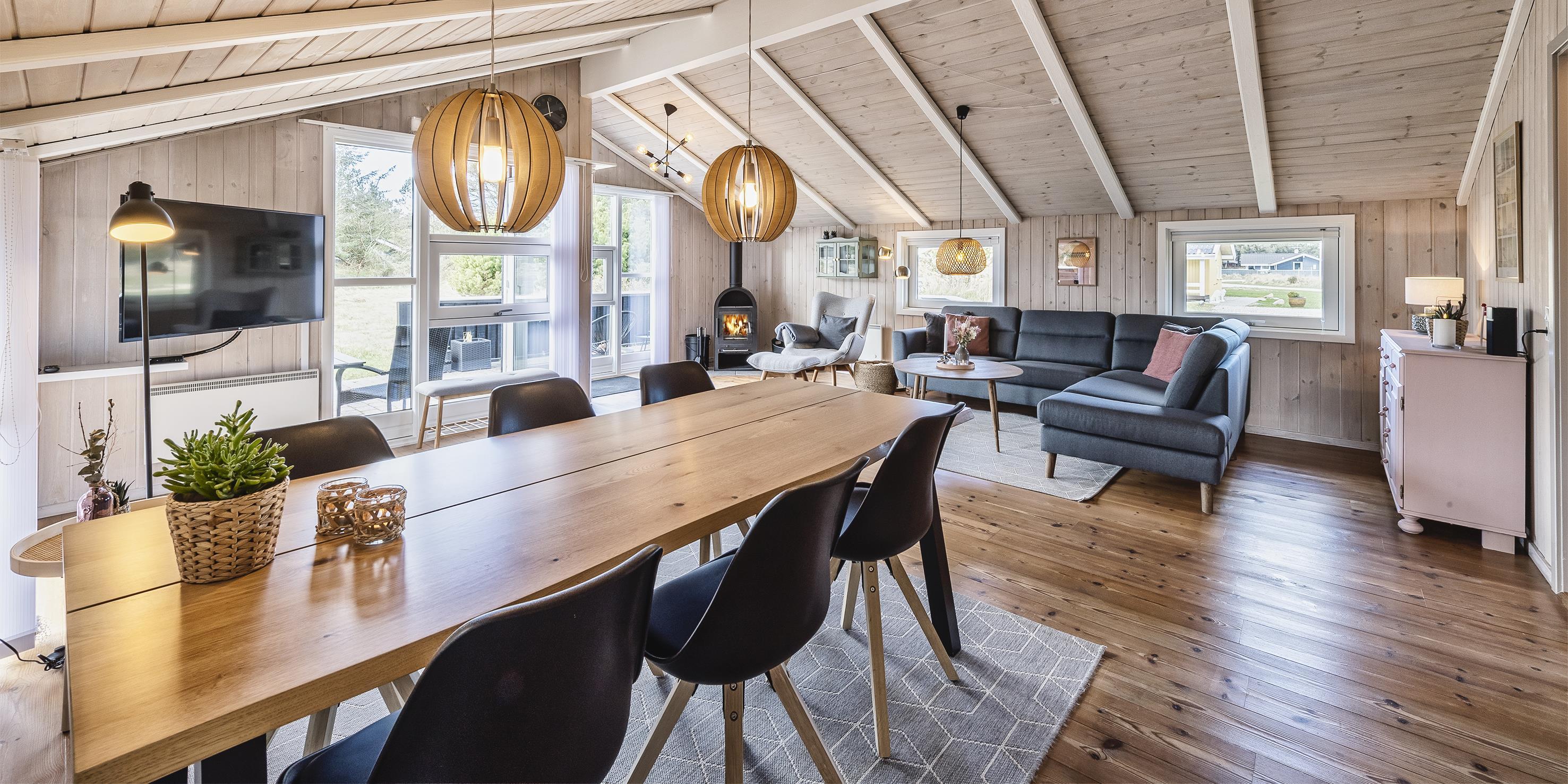 Huset indeholder: indgangsparti der går over i husets opholdsrum. Fra indgangspartiet er der adgang til husets master badeværelser der fremstår med nyt vaskearrangement, bruseniche, wc og en hjørnespa samt en sauna. Gæstetoilet med wc, vask og en vaskemaskine samt en tørretumbler. Opholdsrummet er åbent med et nyrenoveret køkken der fremstår med indbygningsovn, keramisk kogeplade, udtræks emhætte, opvaskemaskine, mikroovn og nyt køle-fryseskab og gulvarme i køkken. Fra køkkenet er der en åbning ind til spisebordsafdelingen. Nyrenoveret stue med et hyggeligt sofahjørne med kig til brændeovn, radio, Chromecast og smart-TV. De store vinduer i opholdsrummet er med udsyn til haven hvor områdets kronvildt har sin gang. Huset råder over 3 soveværelser: DS + DS + 2S, der er holdt i hver deres farveskala, blå, grøn og lyserød. Alle soveværelser er med helt nye kontinentalsenge. De 2 soveværelser fremstår med hver 1 dobbeltseng og 1 soveværelse med 2 enkeltsenge. Stor, delvis lukket terrasse. Gyngestativ og sandkasse. Kulgrill til rådighed, efter benyttelse skal den rengøres før den sættes tilbage. Trådløst internet. Husdyr og rygning er ikke tilladt! Byggeår 2000, renoveret i 2021.