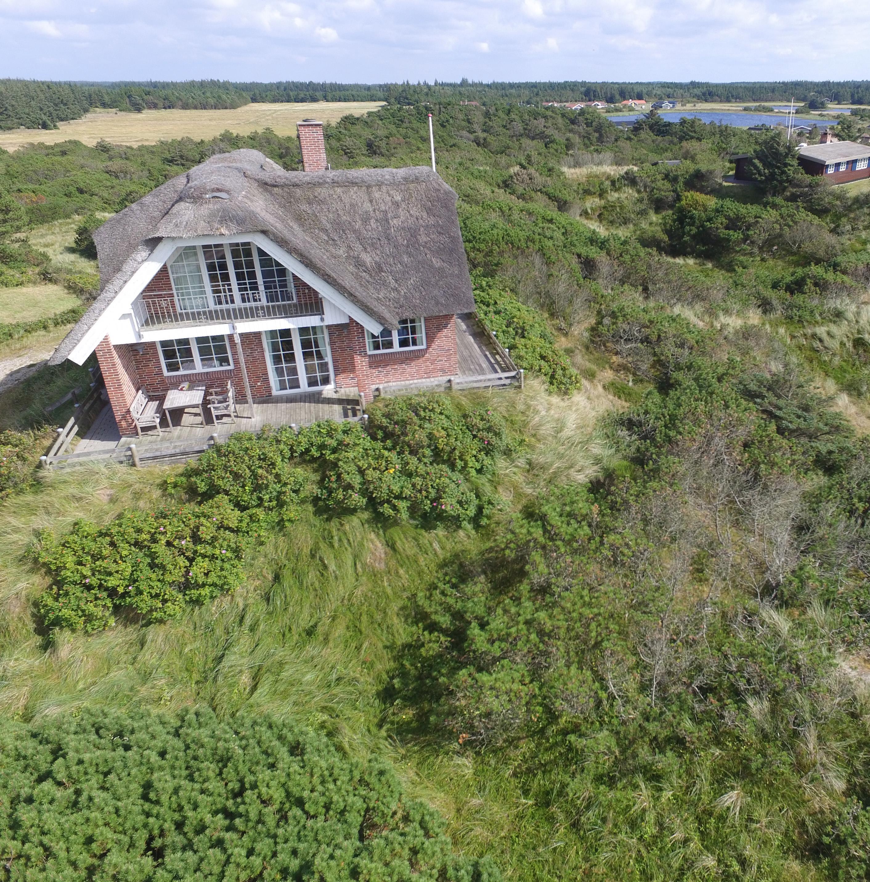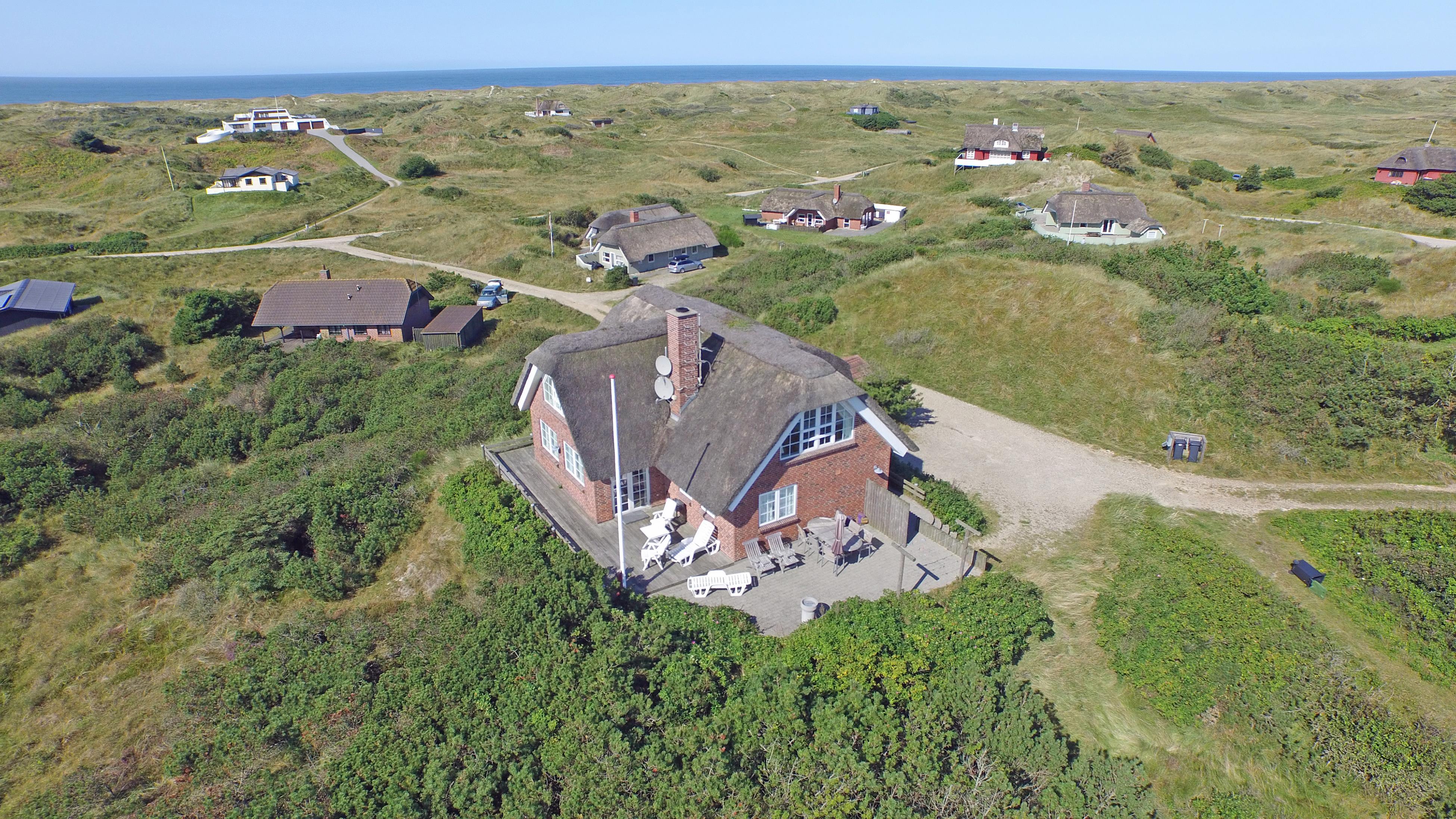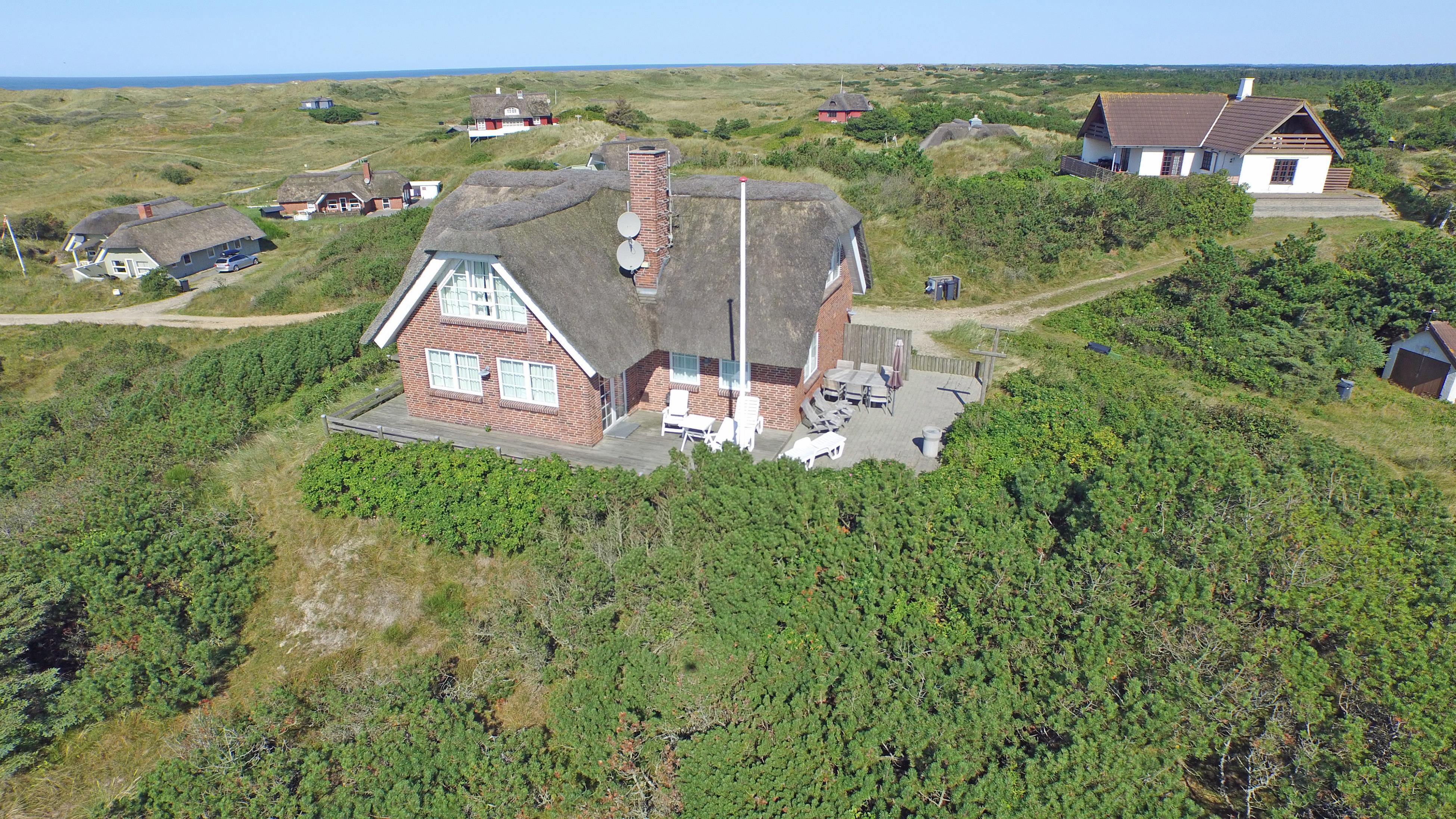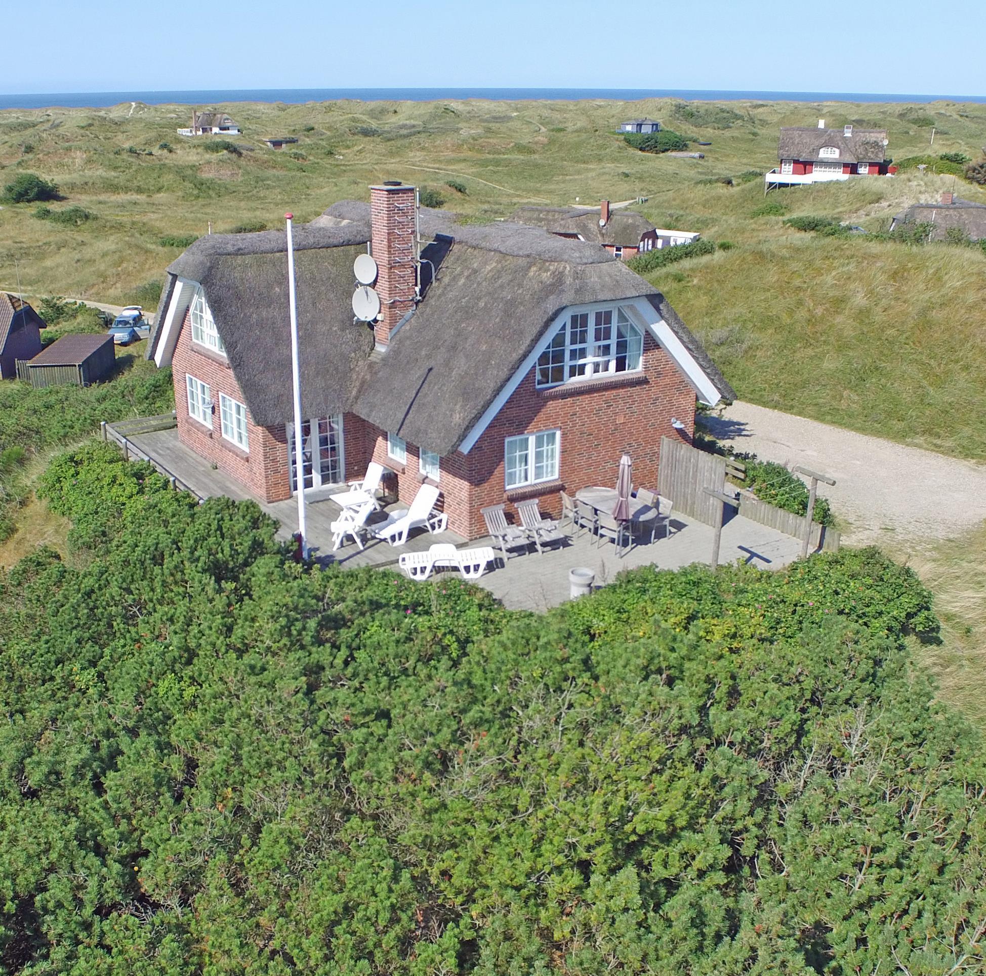 Særdeles flot stråtækt sommerhus til 6 personer, beliggende på en høj klit med havudsigt, ca. 200 meter fra stranden. I stueetagen: stue med brændeovn, fjernsyn og danske kanaler over Stofa (sommerhuspakken), samt åbent køkken med opvaskemaskine. Badeværelse med bruser/wc, spa og sauna. Entre med vaskemaskine og tørretumbler. 3 soveværelser: DS + DS + DS. Badeværelse med bruser/wc. Lille stue. Stor dejlig terrasse. Trådløs internet. Rygning er ikke tilladt. Byggeår 2000.