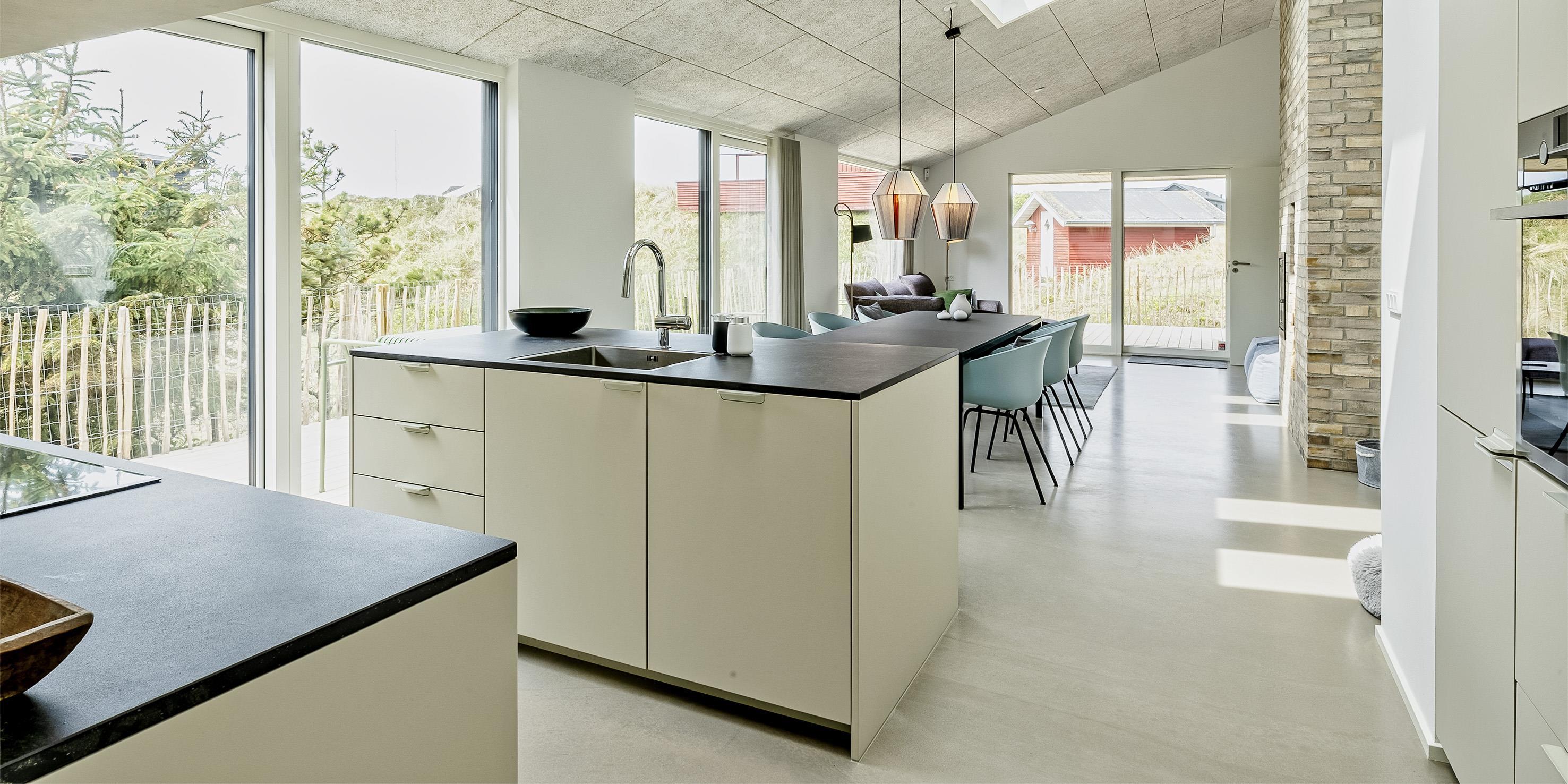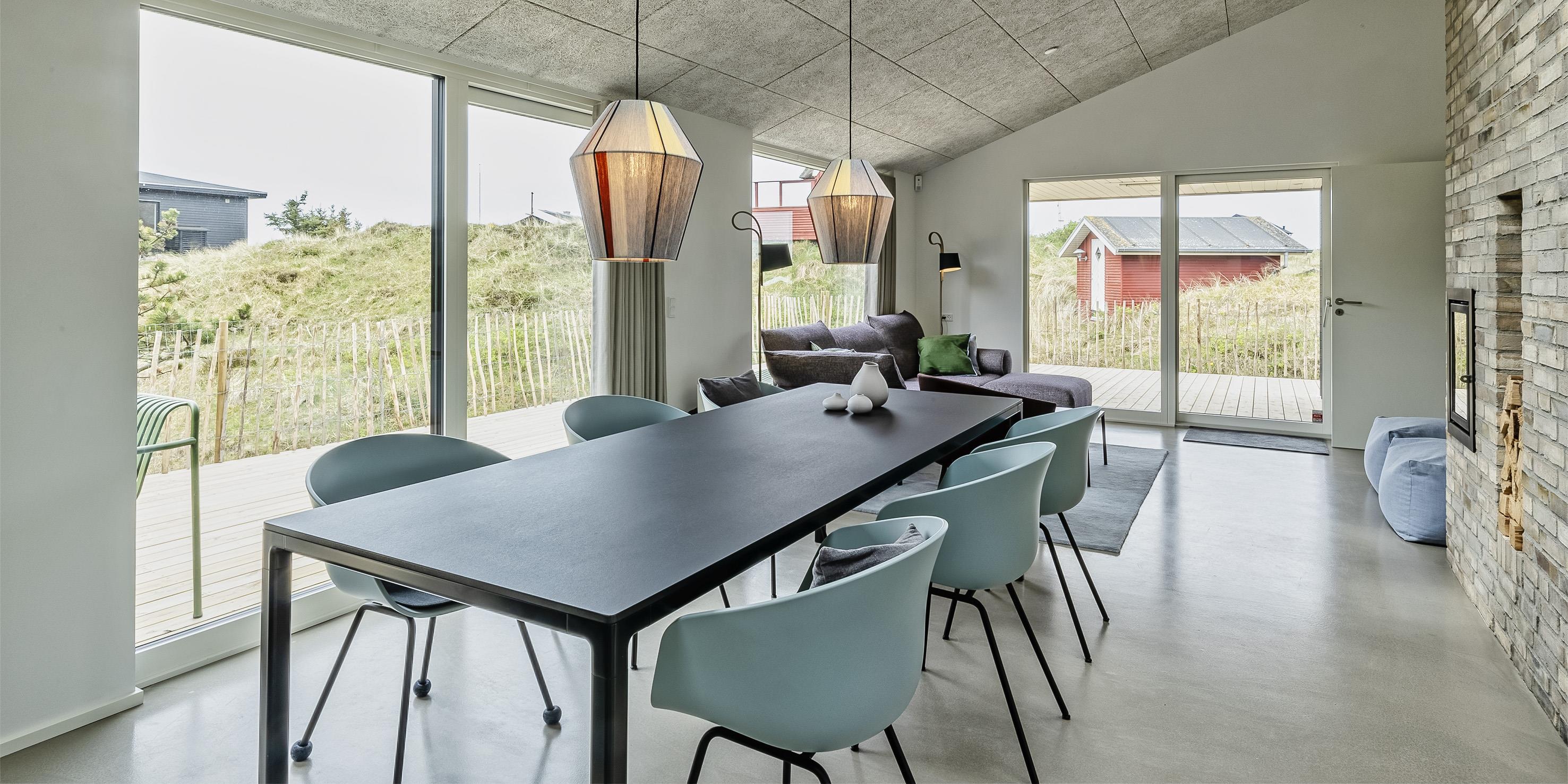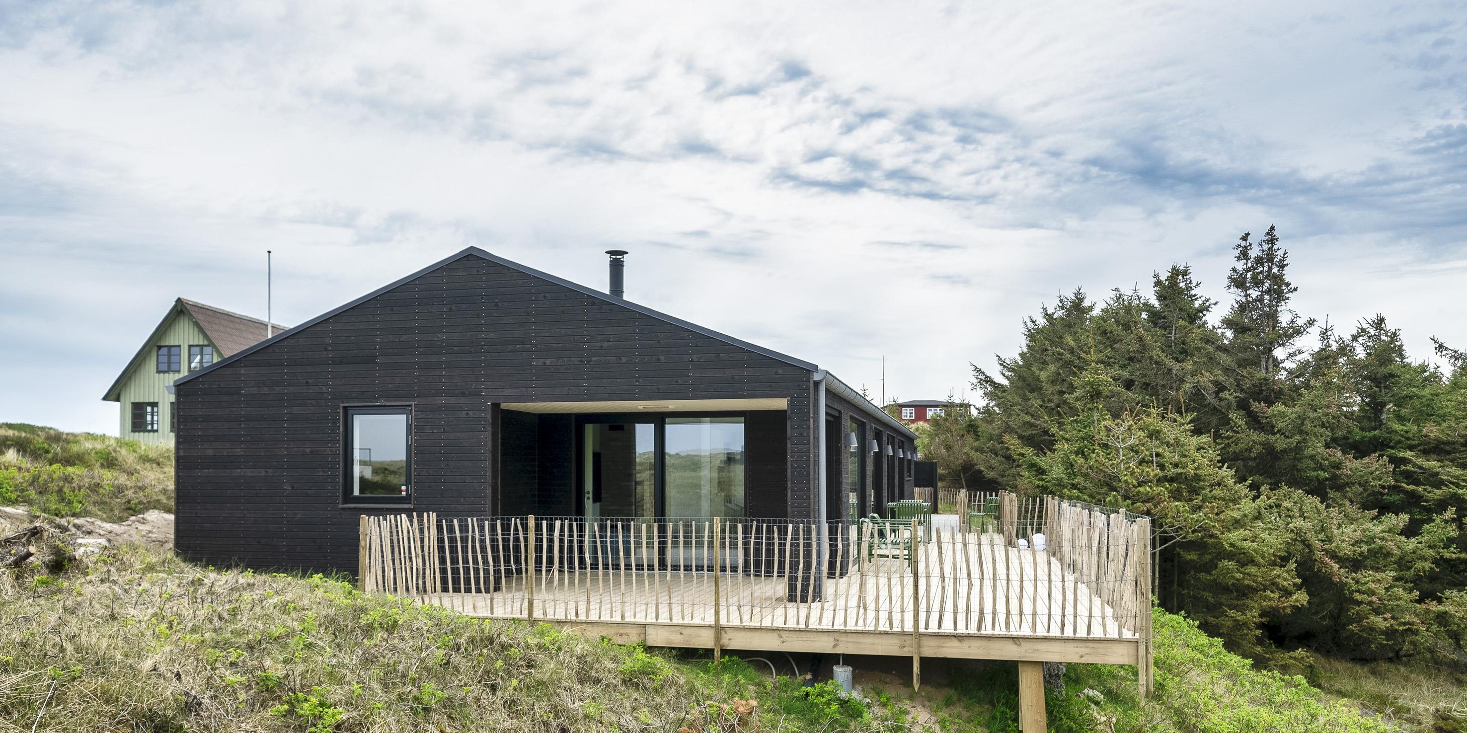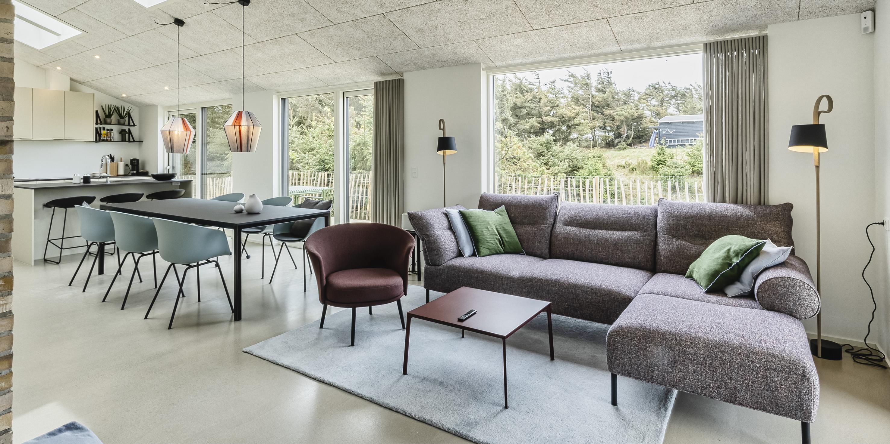 Sommerhuset byder på en skøn atmosfære i en moderne, nordisk stil, og med store panoramavinduer vendt mod naturen.