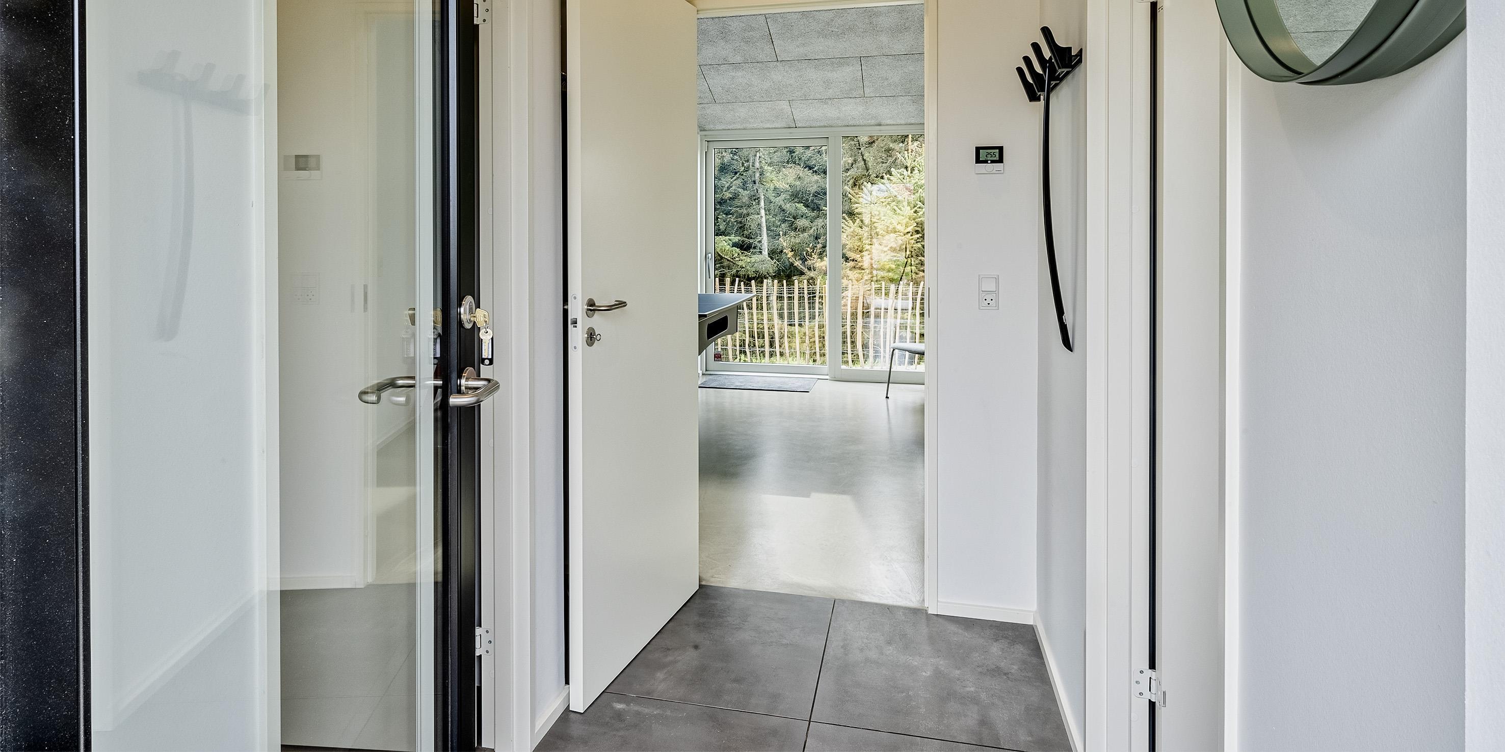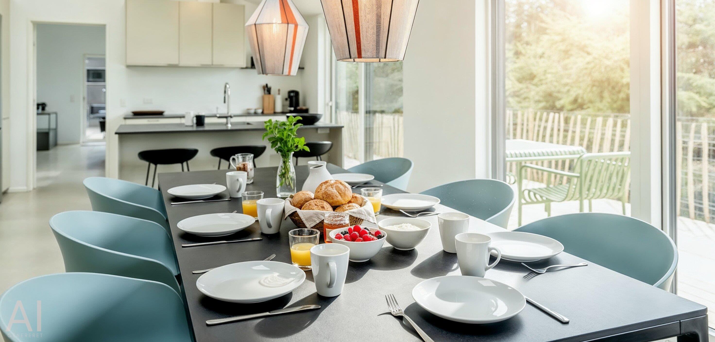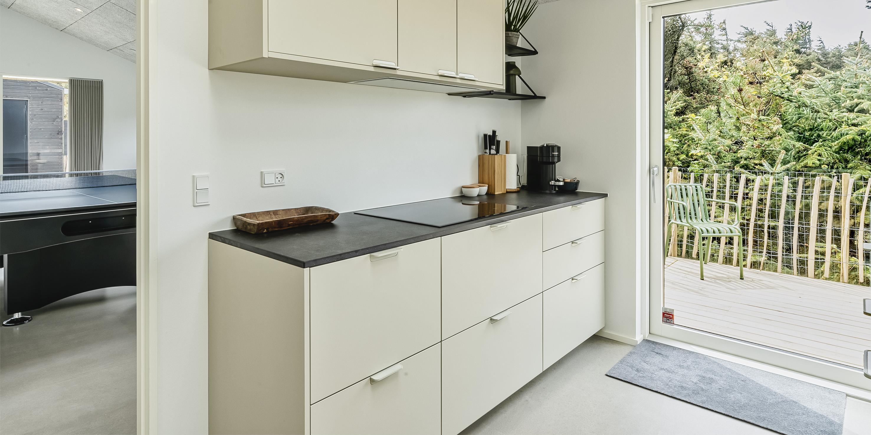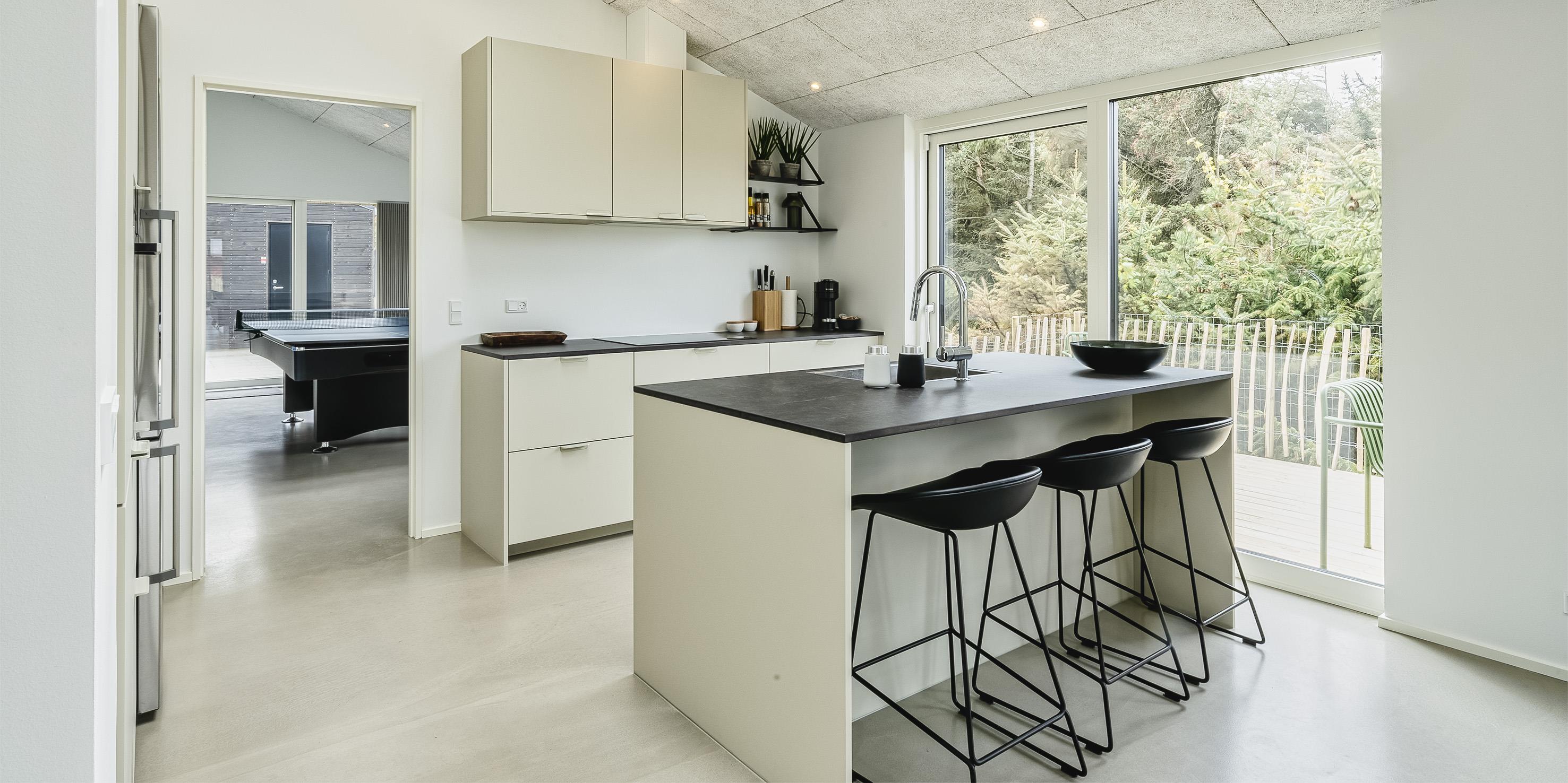 Sommerhuset byder på en skøn atmosfære i en moderne, nordisk stil, og med store panoramavinduer vendt mod naturen.