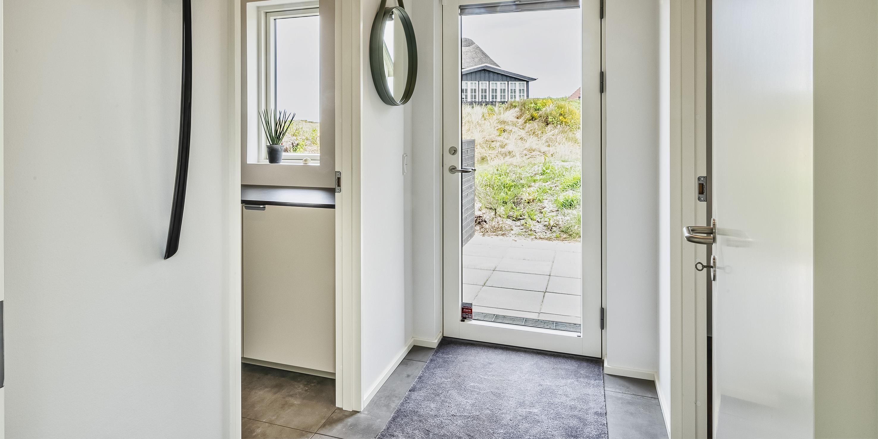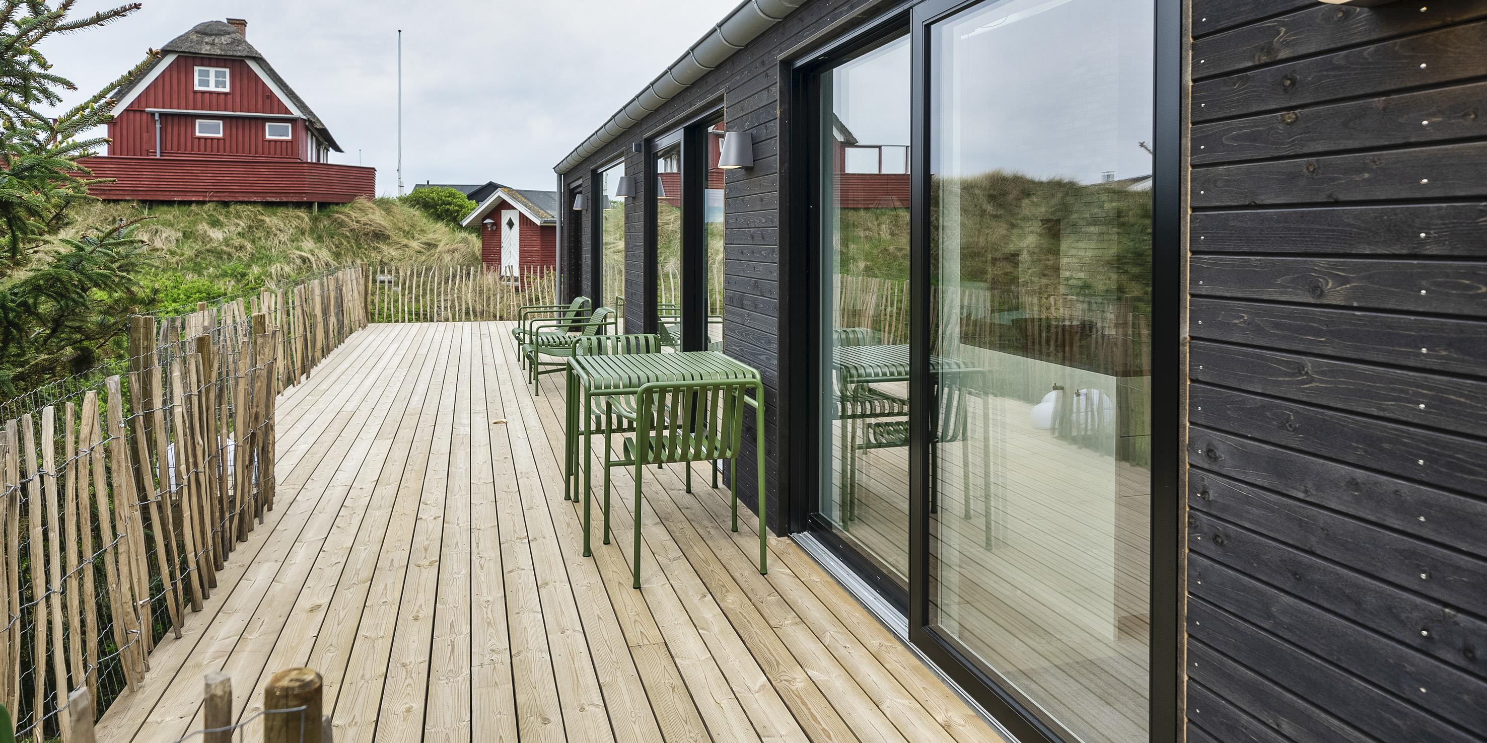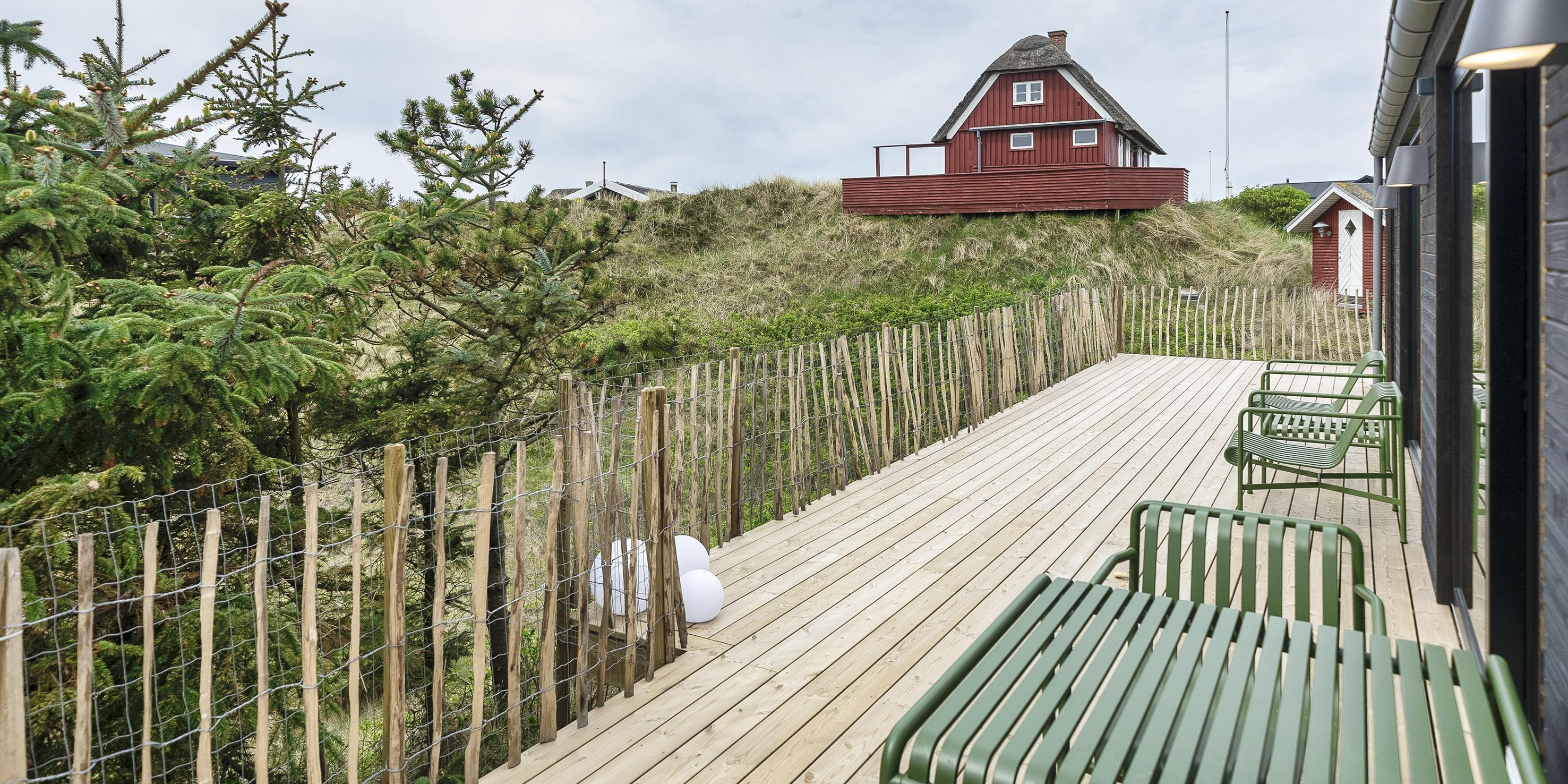 De udvendige faciliteter byder på flotte solnedgange, der kan nydes fra den store omkring liggende træterrasse. Sommerhuset ligger på en lav klitgrund, ca. 200 meter fra stranden samt kort afstand til indkøb og restaurant.
