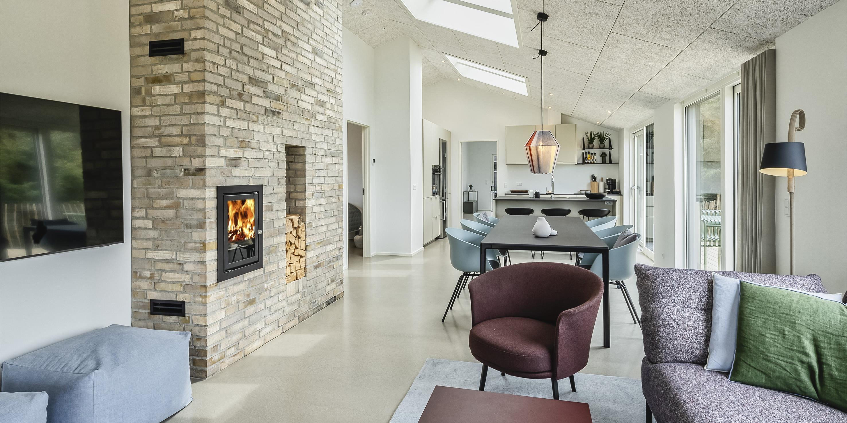 Huset opvarmes med gulvvarme i alle rum og luft til vand varmeanlæg, hvorved der er et lavere energiforbrug.