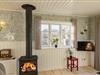 Stort køkken/alrum i åben forbindelse med spiseplads og stue med energivenlig varmepumpe og gasbrændeovn – perfekt til hyggeligt samvær.